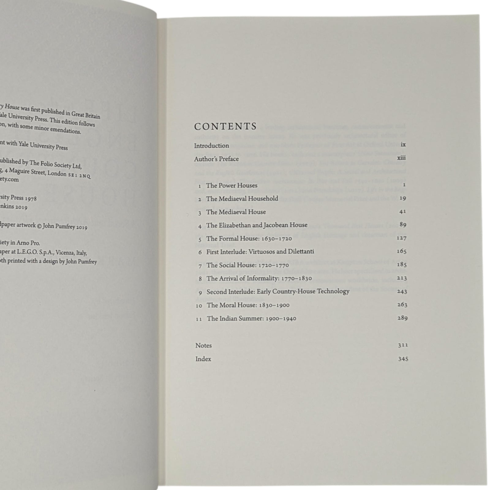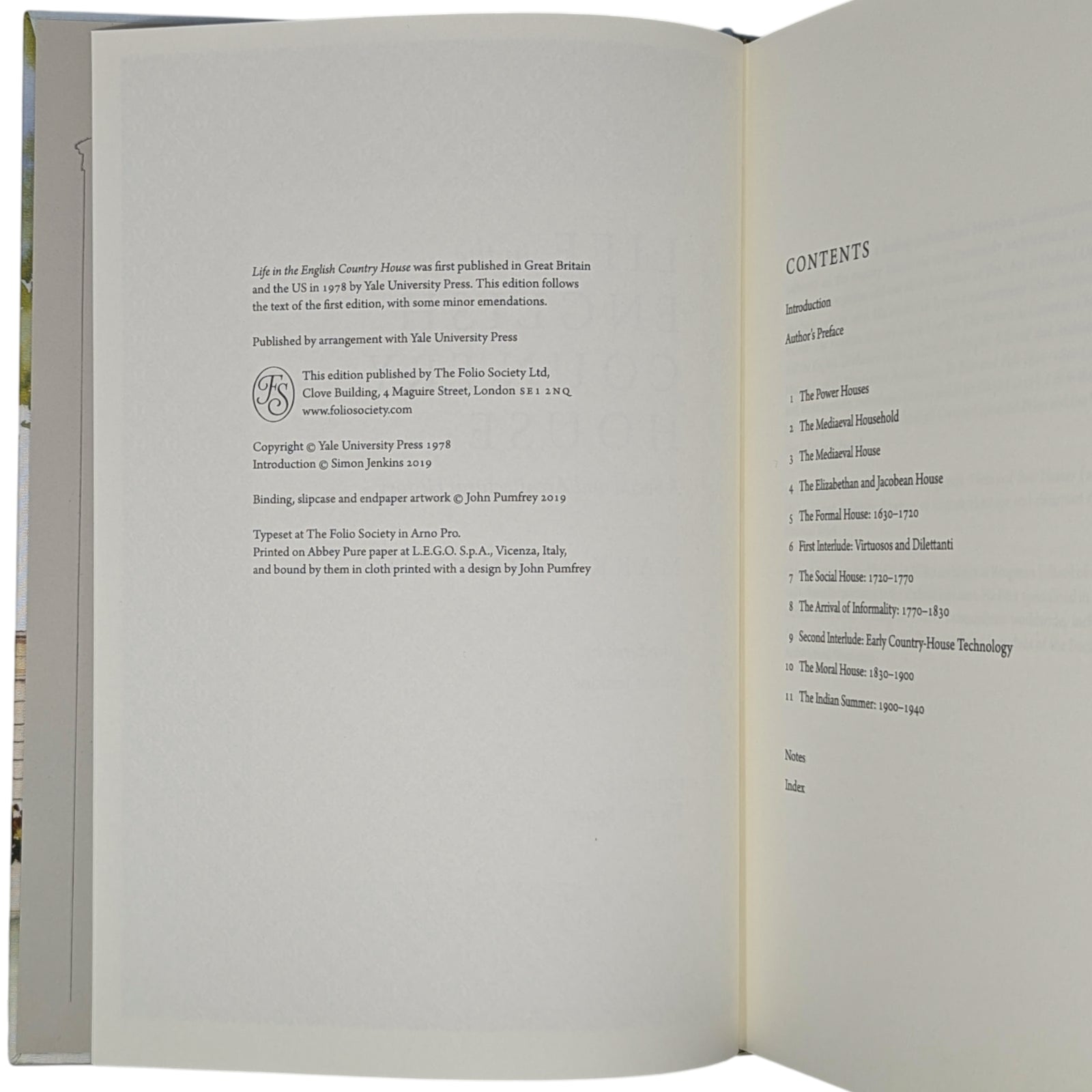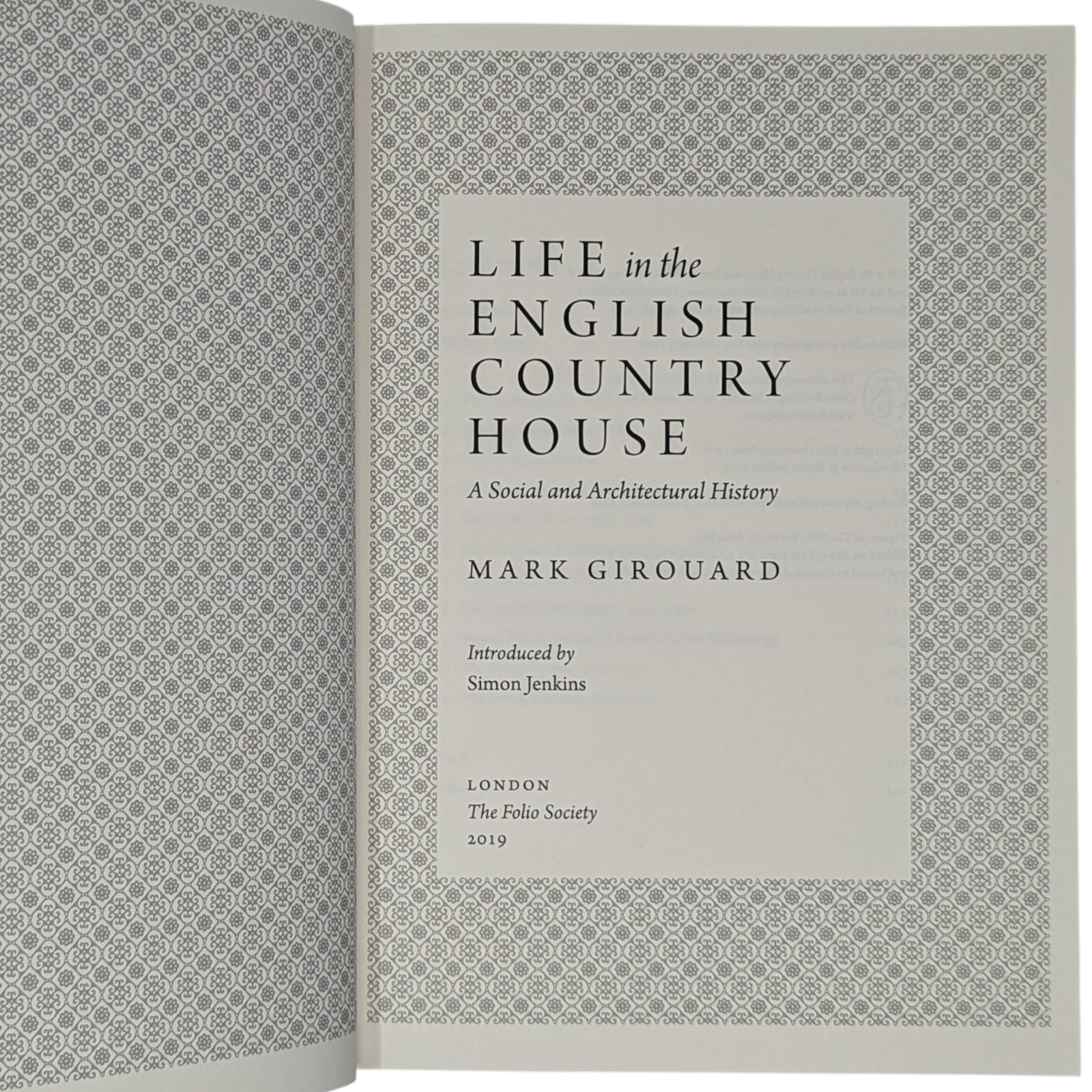 Life in the English Country House, A Social and Architectural History, Mark Girouard. London: The Folio Society, 2019. First printing thus. Introduced by Simon Jenkins. 288 × 205 × 36 mm. Pp. [i–ix] x–xiv [xv–xvi], [1–3] 4–357 [358–360]: [12] leaves of colour plates (between pp. 96–97, 192–[193] and 272–[273]). Type: Arno Pro. Printed and bound by L.E.G.O. in full printed cloth with a design by John Pumfrey; pale grey endleaves printed with illustration by Pumfrey. Green slip case titled in gold and printed in black with detail from binding. The plates largely reproduce images from oil paintings, illuminated manuscripts and watercolours. In addition, copious plans, interiors and exteriors of houses are reproduced in the text. The photographs are primarily sourced from the archives of Country Life magazine and the Royal Institute of British Architects.