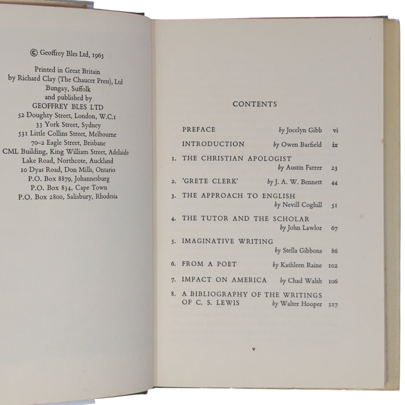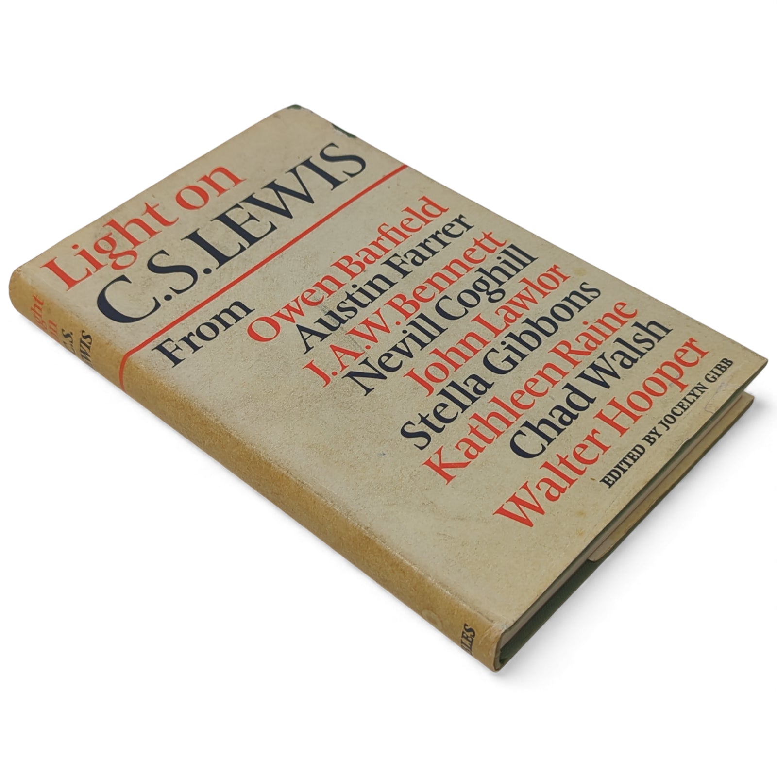 GIBB, Jocelyn [Edited by]; BARFIELD, Owen; FARRER, Austin; BENNETT, J A W; COGHILL, Nevill; LAWLOR, John; GIBBONS, Stella; RAINE, Kathleen; WALSH, Chad; HOOPER, Walter. Light on C S Lewis. London: Geoffrey Bles, 1965. First edition, first printing of this collective portrait of C.S. Lewis through essays by people who knew him well, including members of the Inklings. Publisher's green binding, red label with gilt titles to spine, plain endpapers; in price-clipped dust wrapper.