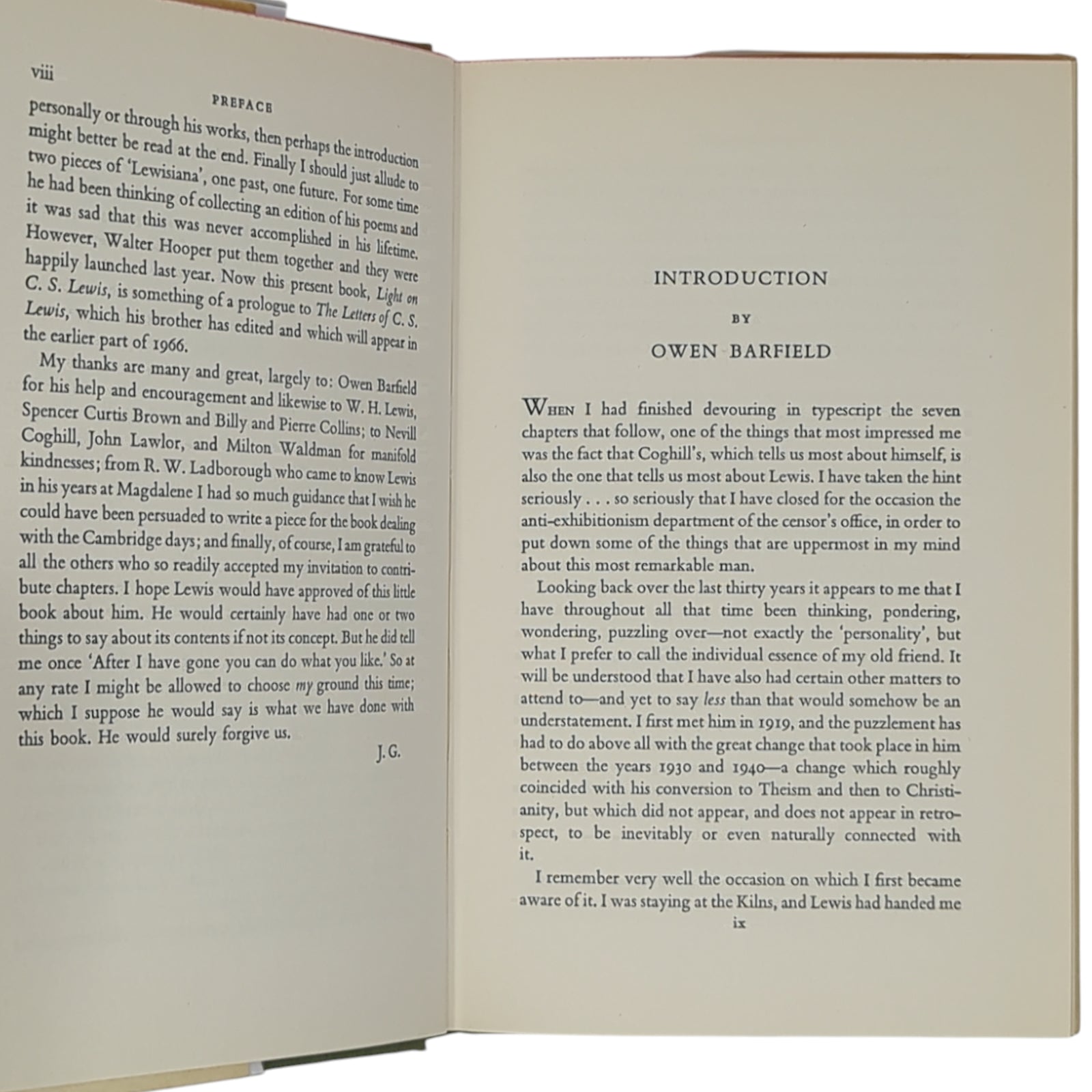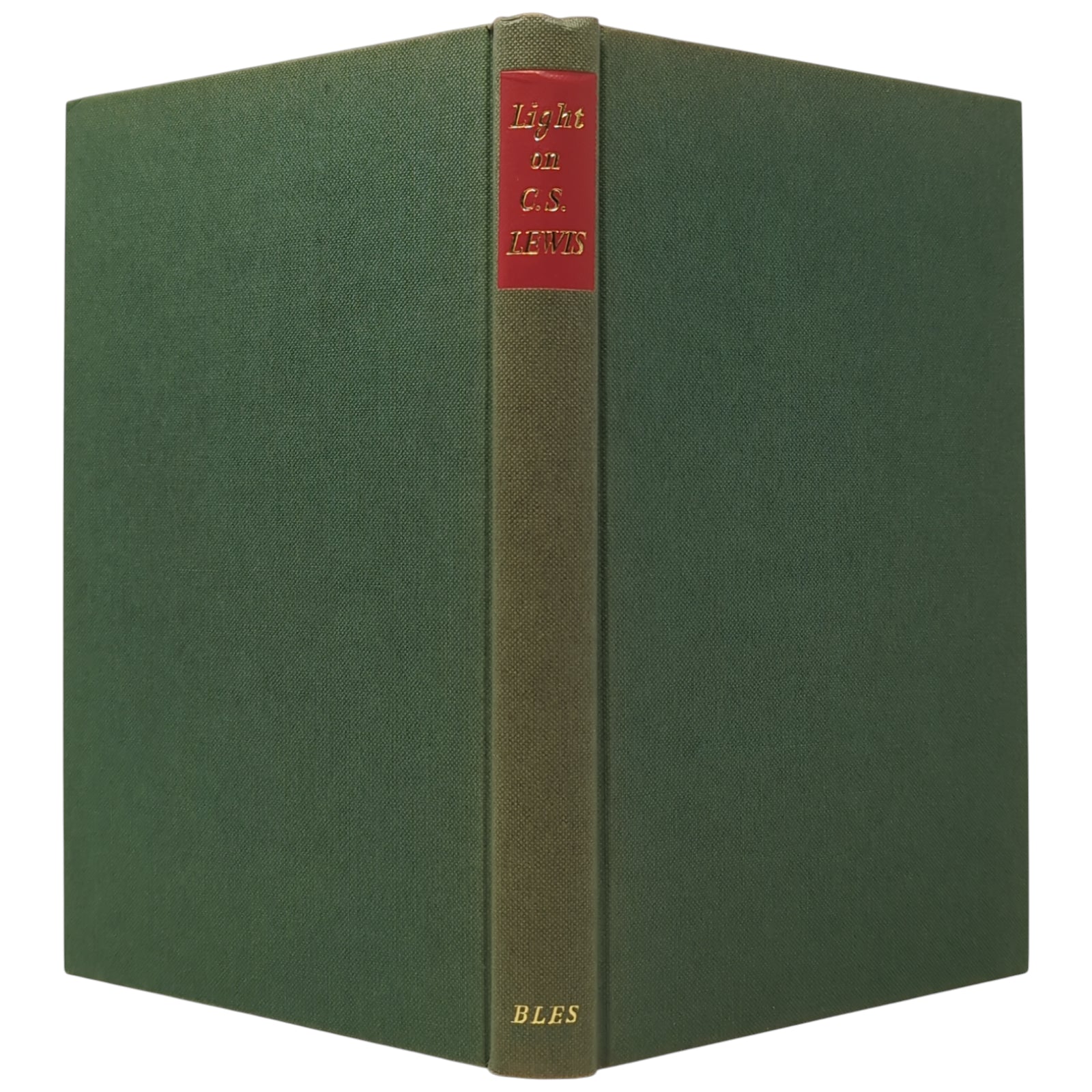 GIBB, Jocelyn [Edited by]; BARFIELD, Owen; FARRER, Austin; BENNETT, J A W; COGHILL, Nevill; LAWLOR, John; GIBBONS, Stella; RAINE, Kathleen; WALSH, Chad; HOOPER, Walter. Light on C. S. Lewis. London: Geoffrey Bles, 1965. First edition, first printing of this collective portrait of C.S. Lewis through essays by people who knew him well, including members of the Inklings. Publisher's green binding, red stamp with gilt titles to spine, plain endpapers; in unclipped dust wrapper.