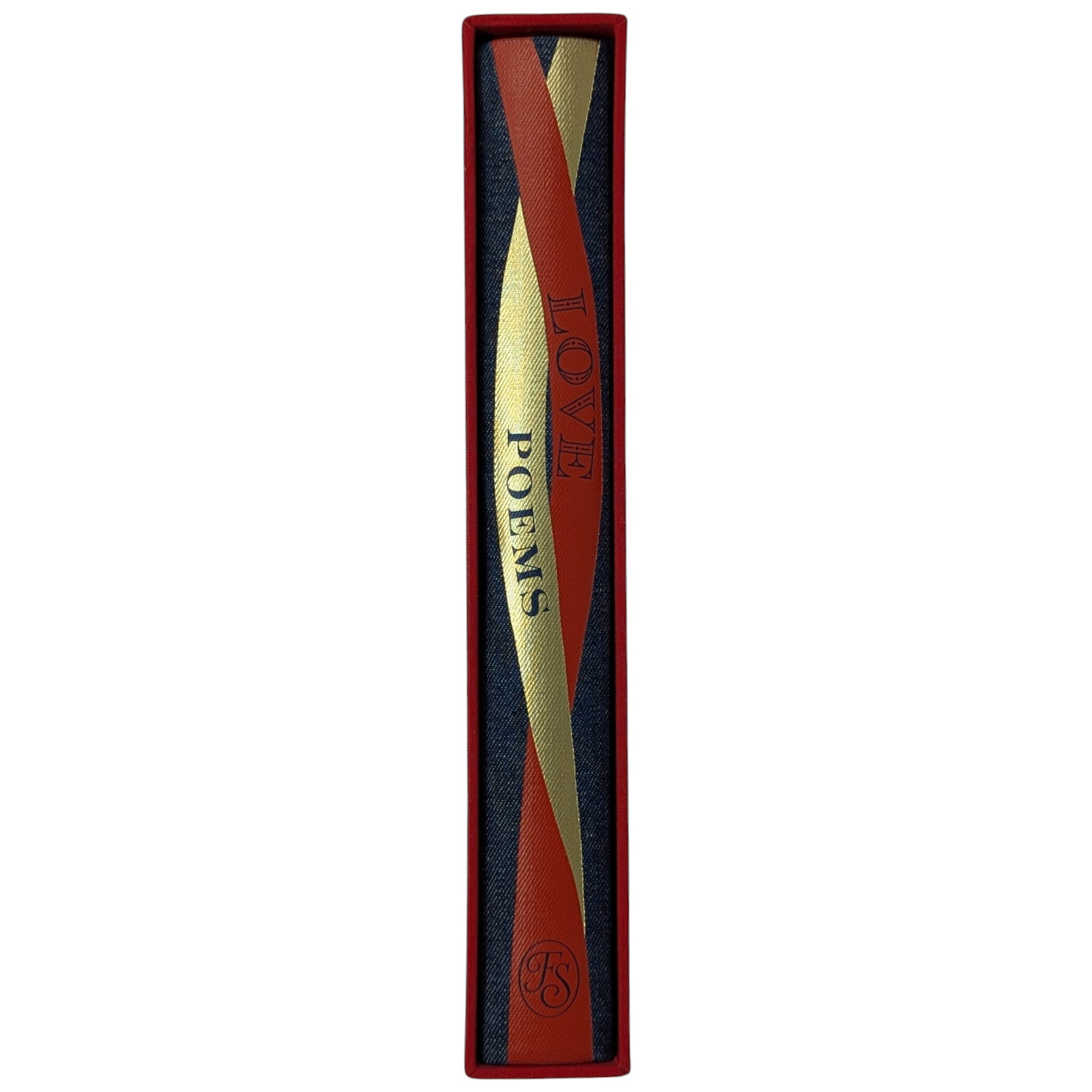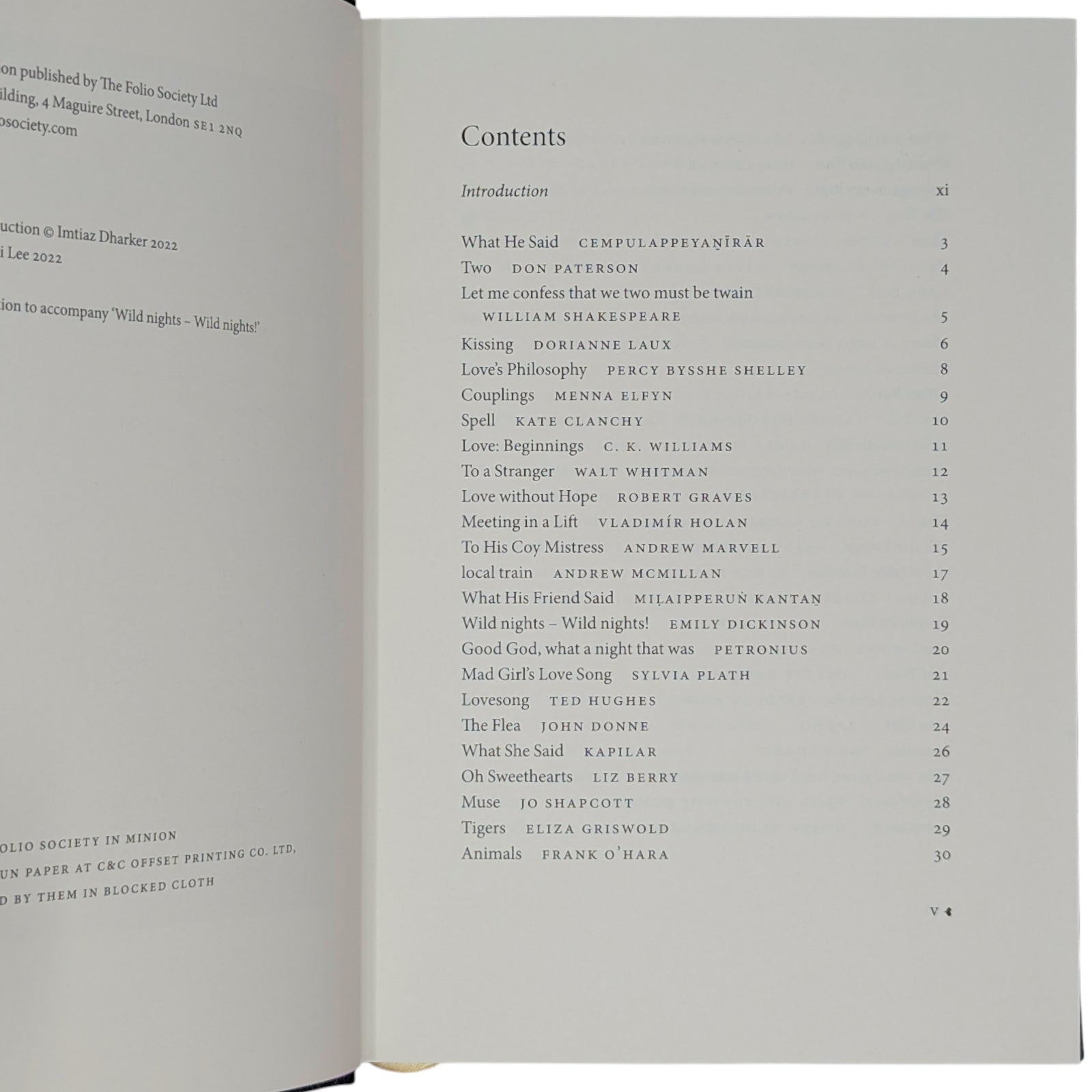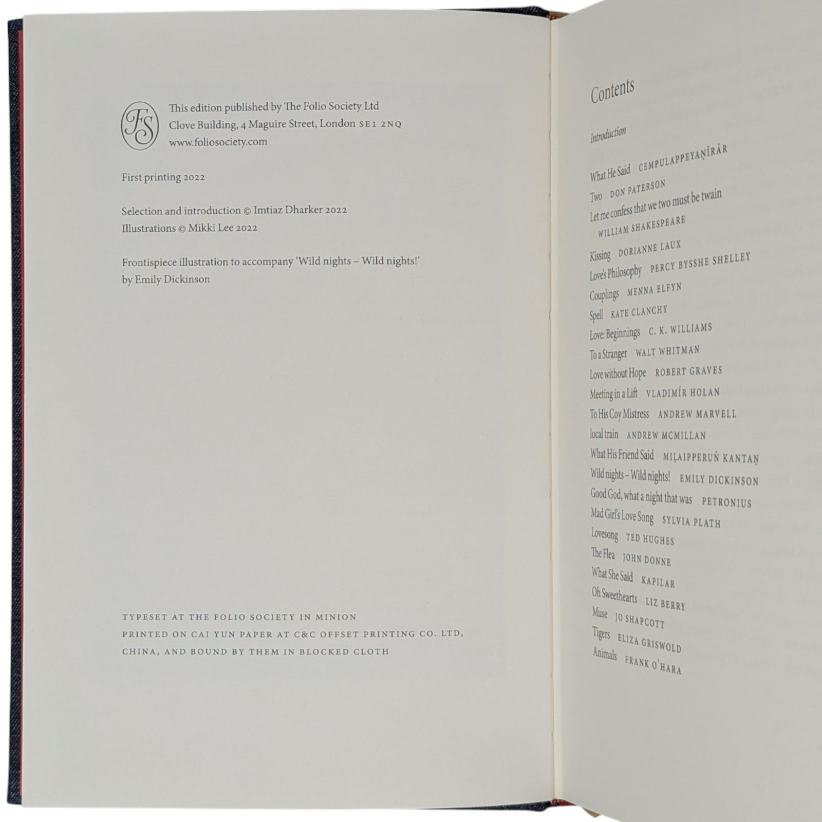 Love Poems. London: The Folio Society, 2022. First printing thus. Selected and introduced by Imtiaz Dharker, illustrated by Mikki Lee. 253 × 178 × 33 mm. Pp. [i–iv] v–xv [xvi], [1–2] 3–230 [231–234]: [7] leaves of colour plates (facing pp. 57, 75, 91, 110, 136, 181 and 199). Type: Minion. Printed and bound by C & C Offset in dark blue cloth blocked in gold and red; textured Cloud Dragon paper endpapers, twin ribbon markers. Red slip case blocked with a single heart in gold. Lee has also provided a coloured frontispiece.