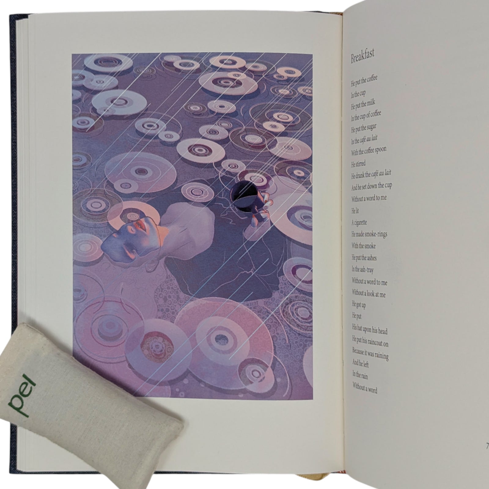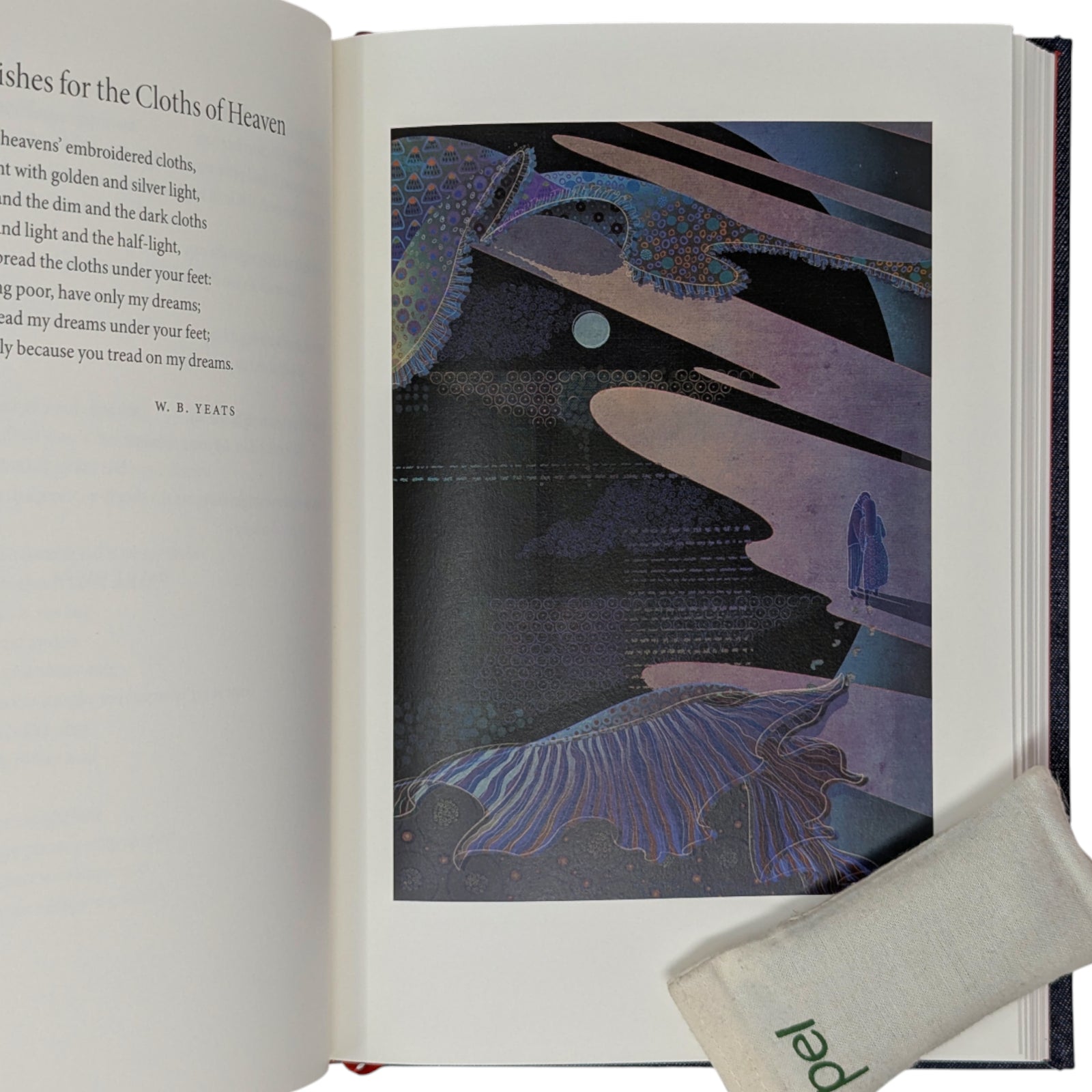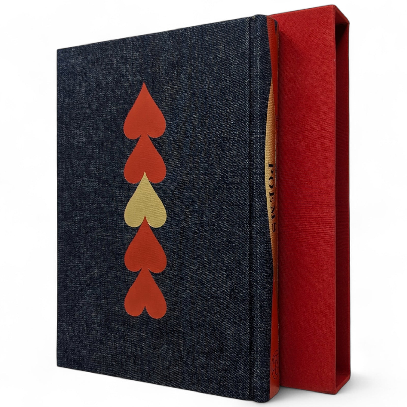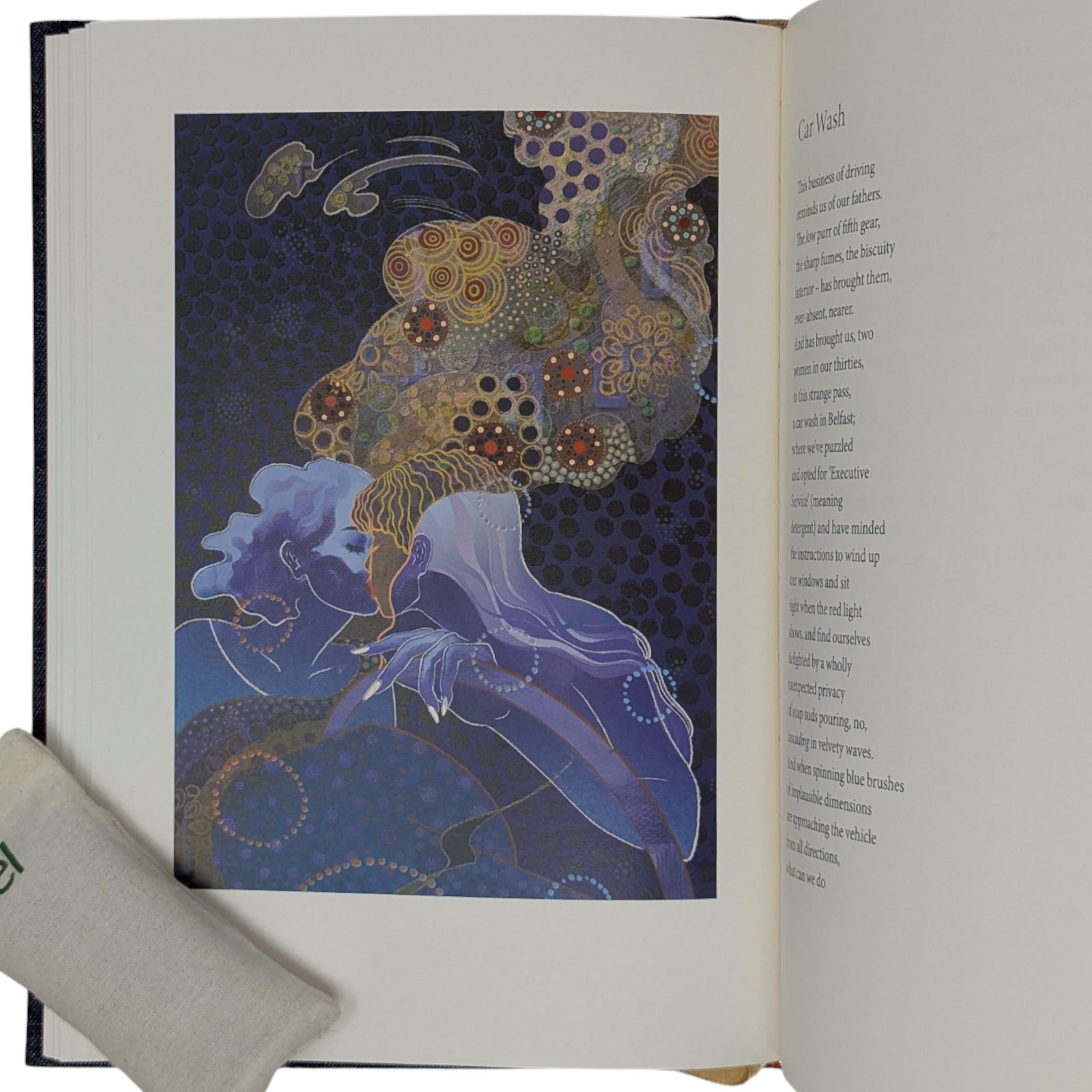 Love Poems. London: The Folio Society, 2022. First printing thus. Selected and introduced by Imtiaz Dharker, illustrated by Mikki Lee. 253 × 178 × 33 mm. Pp. [i–iv] v–xv [xvi], [1–2] 3–230 [231–234]: [7] leaves of colour plates (facing pp. 57, 75, 91, 110, 136, 181 and 199). Type: Minion. Printed and bound by C & C Offset in dark blue cloth blocked in gold and red; textured Cloud Dragon paper endpapers, twin ribbon markers. Red slip case blocked with a single heart in gold. Lee has also provided a coloured frontispiece.