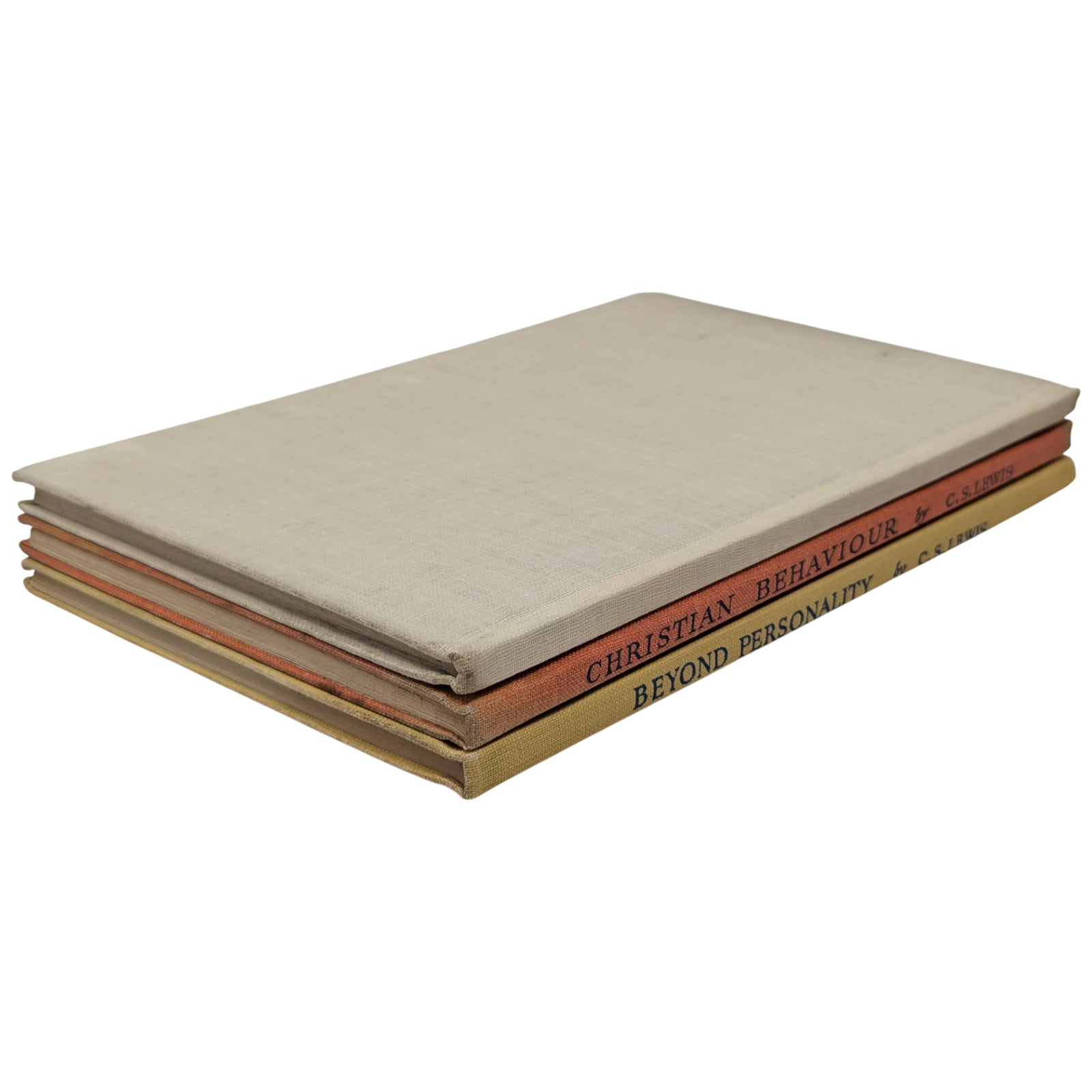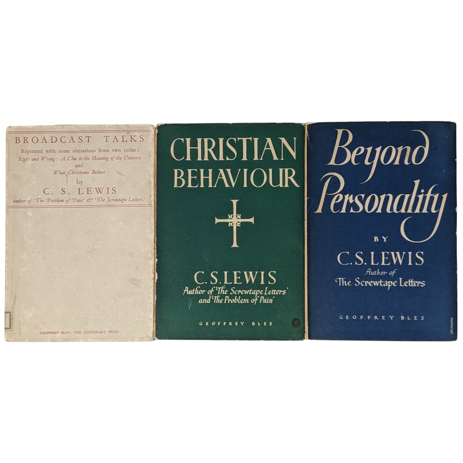 A rare opportunity to acquire the three original first-edition, first-print volumes of C.S. Lewis’ Christian apologetic works: Broadcast Talks (1942), Christian Behaviour (1943), and Beyond Personality (1944). These books were initially published as separate volumes after Lewis's BBC radio talks and were later combined into the single-volume Mere Christianity, which solidified Lewis’s standing as one of the most original voices in 20th-century Christian thought.