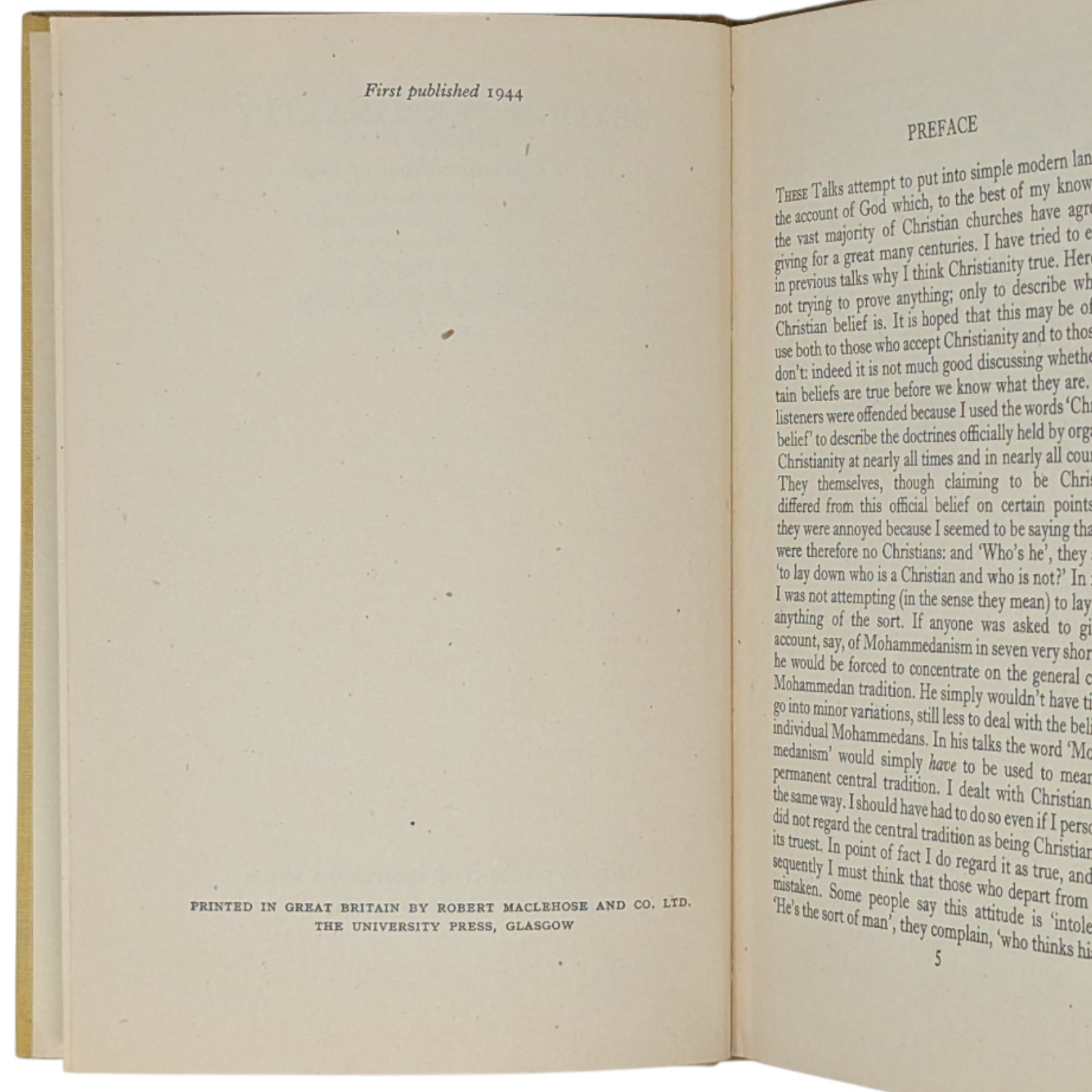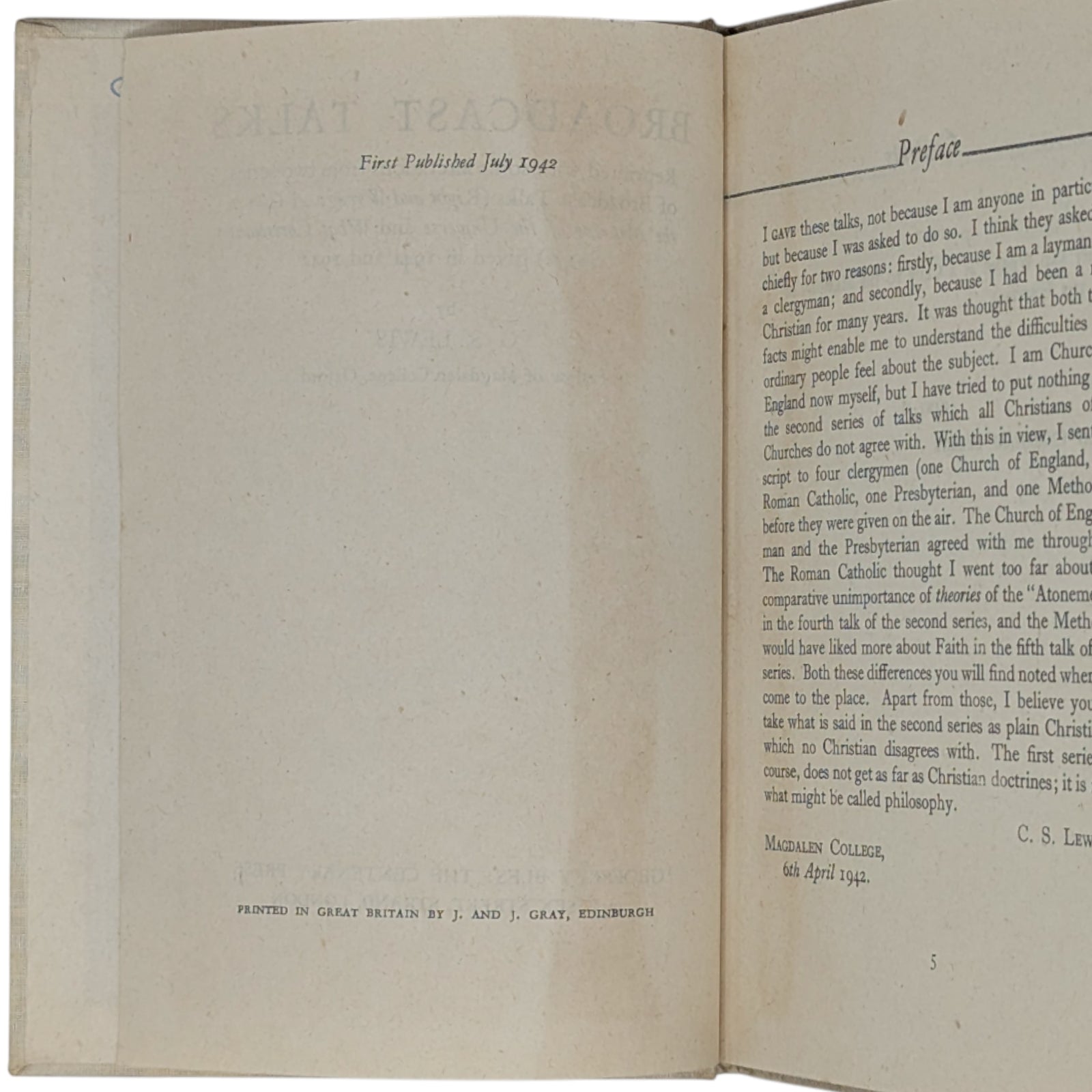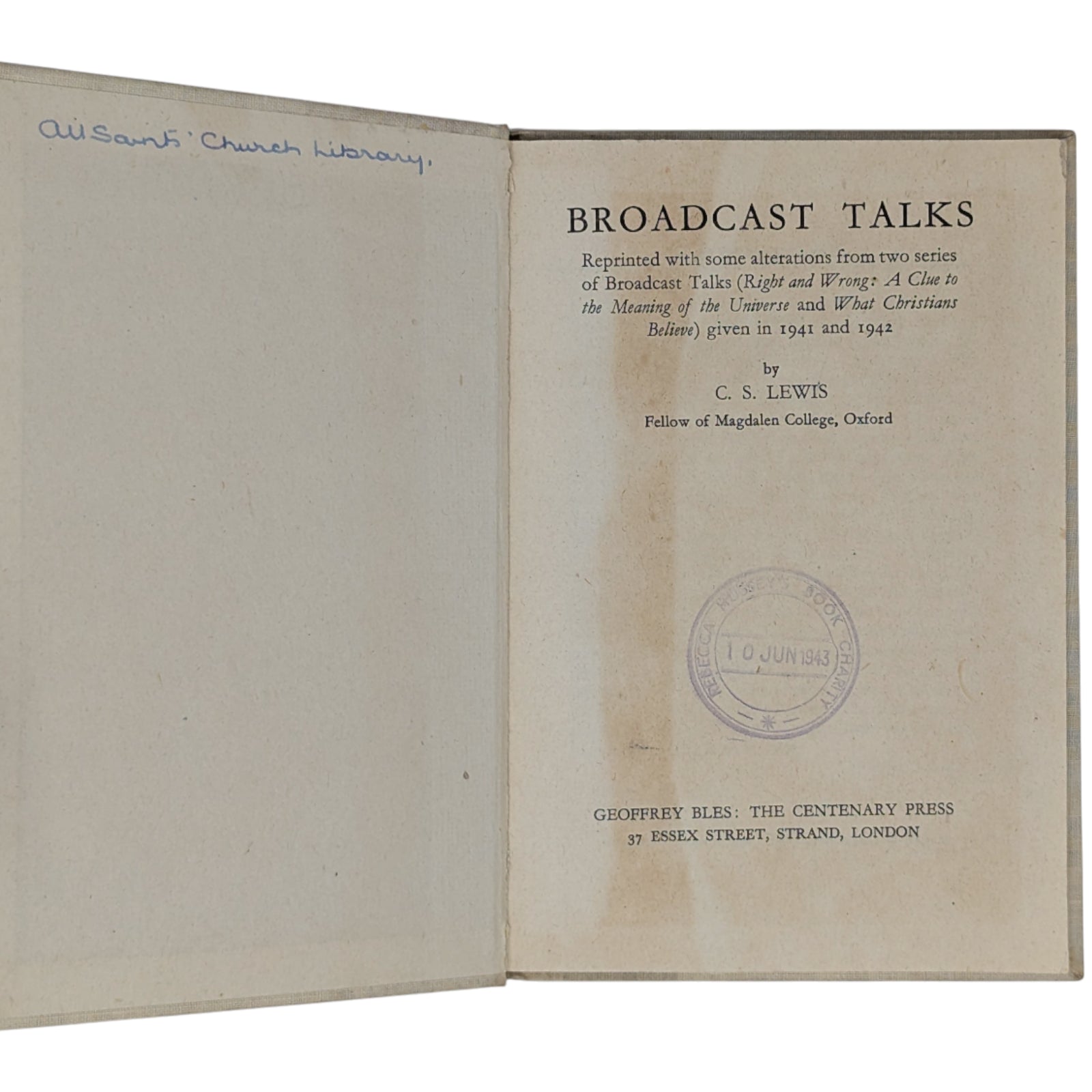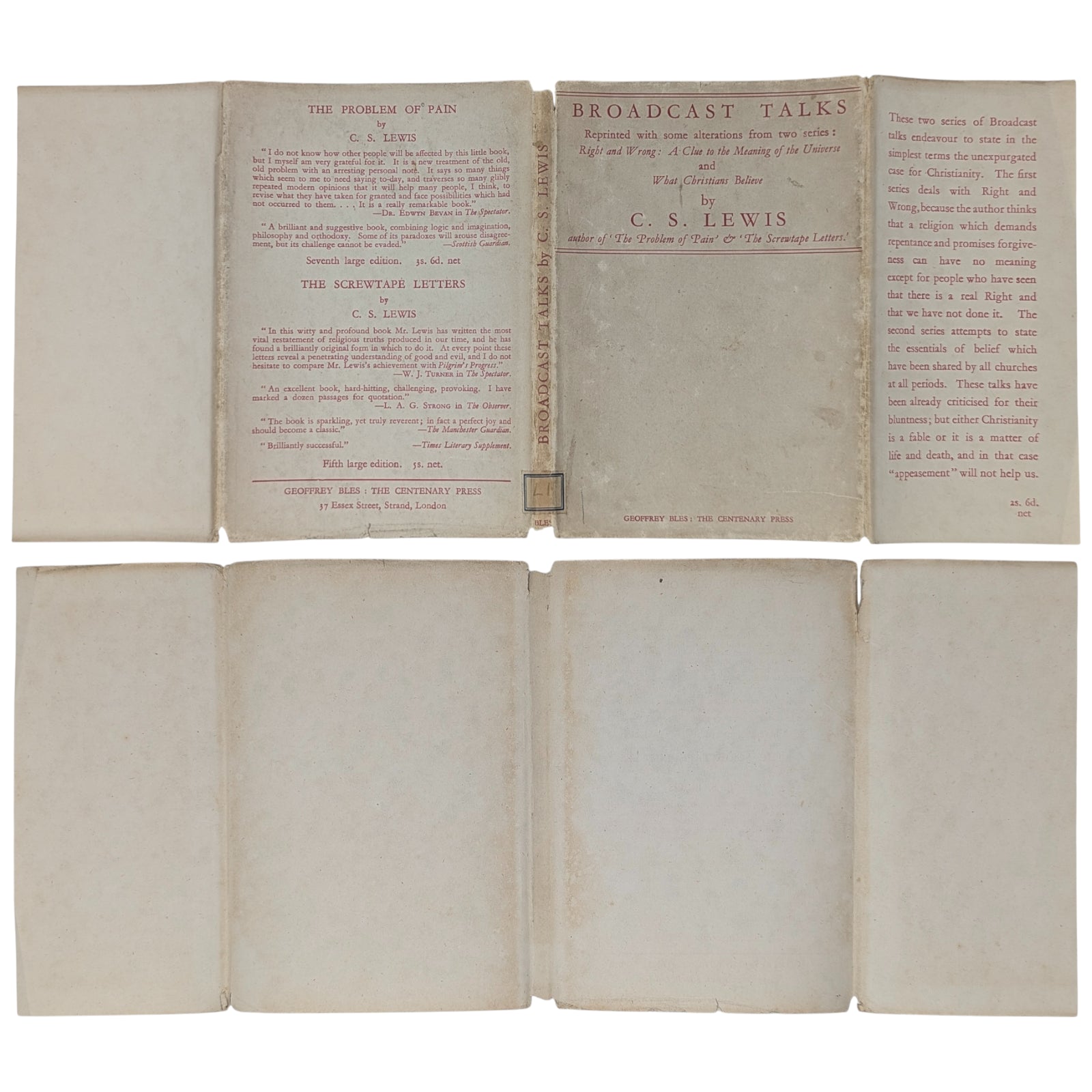 Broadcast Talks: Reprinted with some alterations from two series of Broadcast Talks (Right and Wrong: A Clue to the Meaning of the Universe and What Christians Believe) given in 1941 and 1942. London: Geoffrey Bles: The Centenary Press, July 1942. First edition, first printing. Hardback. Cream cloth; cover lettered in red, spine un-lettered as issued and published without the usual free end-papers and on 'War Economy Paper'. In cream dust wrapper printed in red and not price-clipped (2s.6d.).