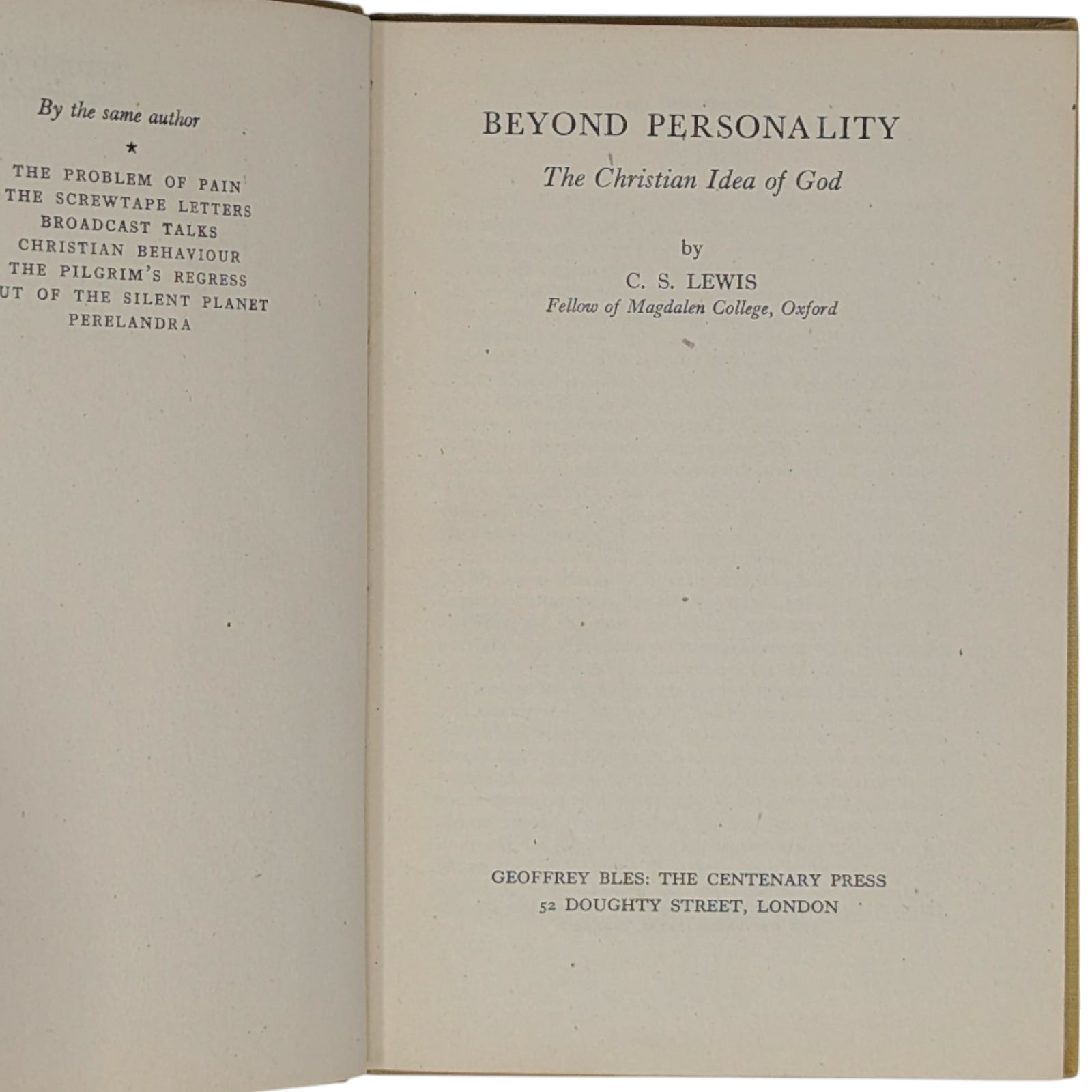 Beyond Personality: The Christian Idea of God. London: Geoffrey Bles: The Centenary Press, 1944. First edition, first printing. Hardback. Yellow cloth; backstrip lettered in blue, published on 'War Economy Paper'. In blue and cream dust wrapper printed in cream and blue respectively, and not price-clipped (2s.6d.).
