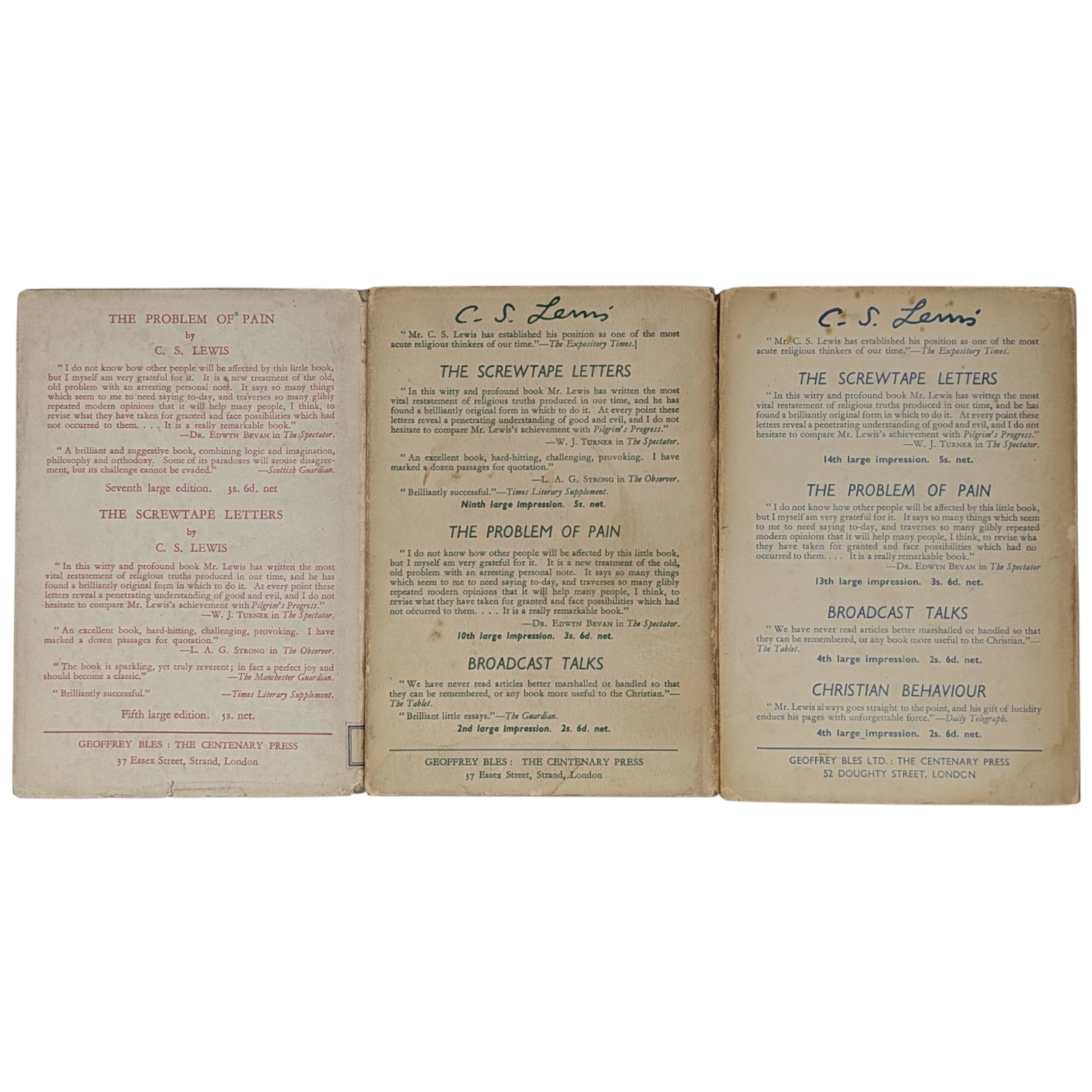A really scarce set of first editions, first printings of the three original volumes that would go on to make up Mere Christianity in 1952.
