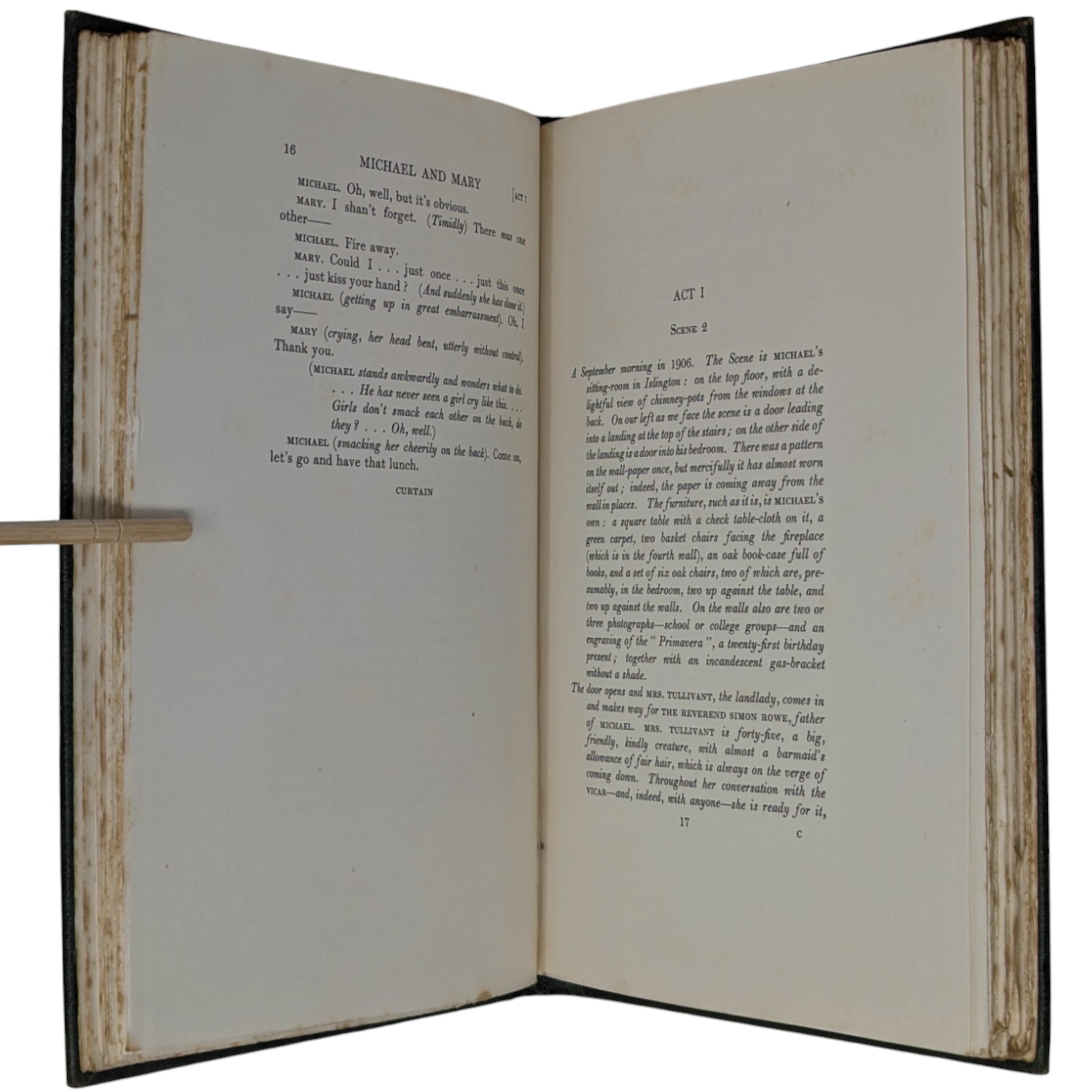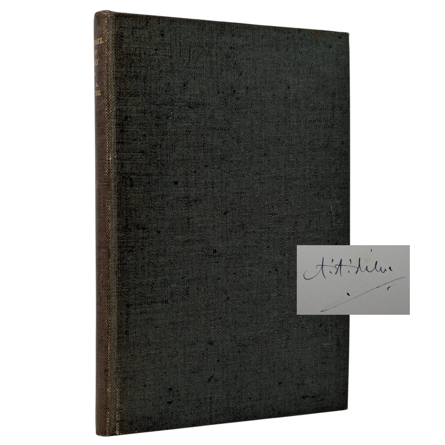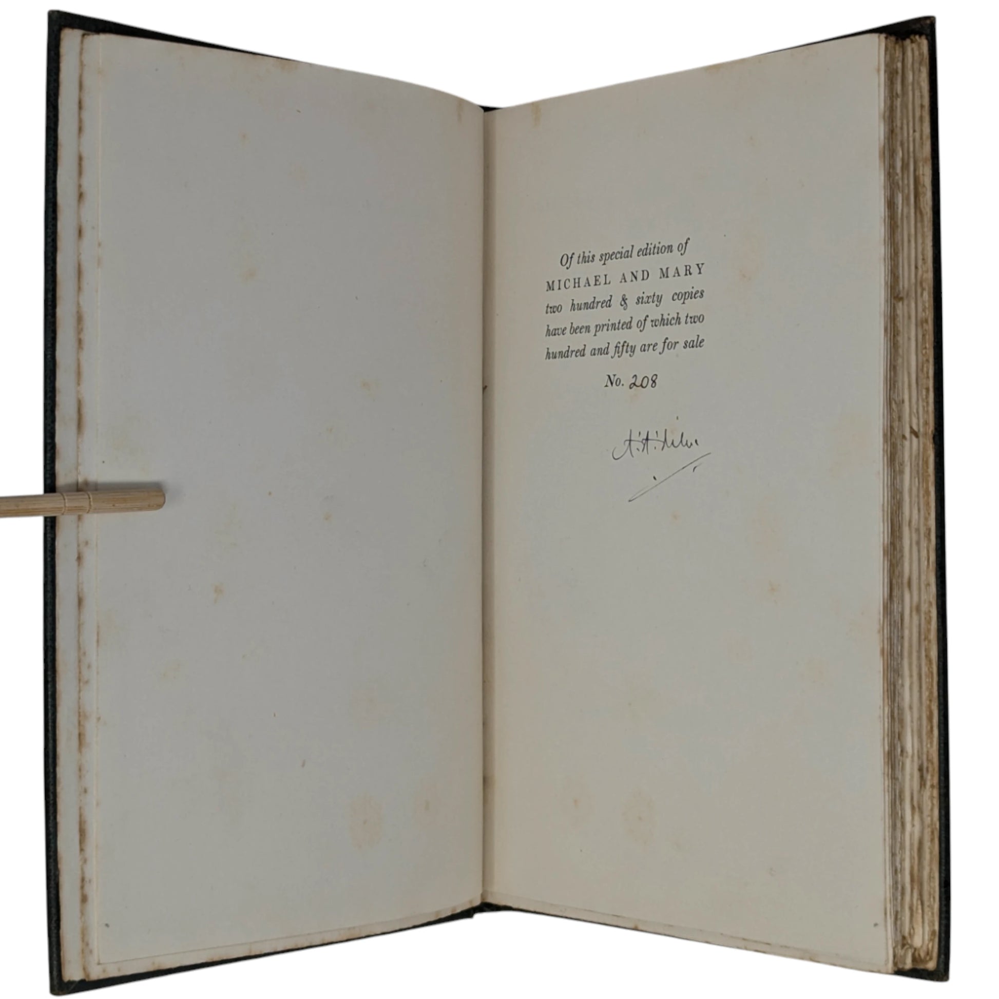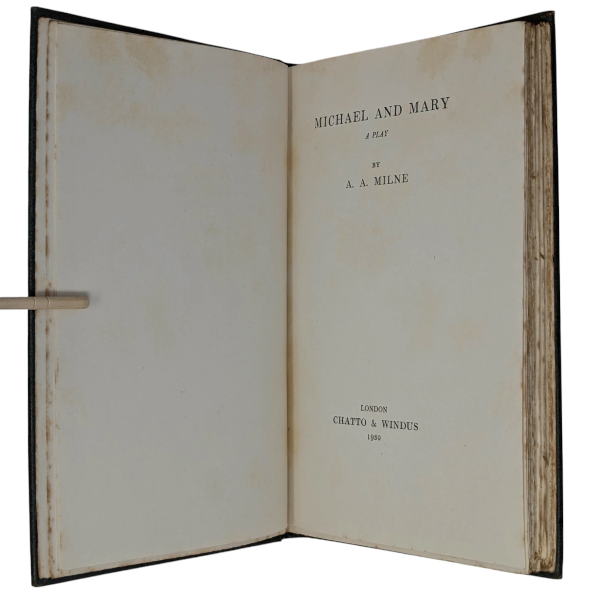 Milne, A. A. Michael and Mary: A Play. London: Chatto & Windus, 1930. Special, Limited, Numbered Edition. Hardcover, Octavo, 96 pp. Signed by the author to a limitation page. No. 208 of 260 copies (250 only for sale). Publisher's green cloth, gilt lettering to spine, top edge gilt; no dustwrapper.