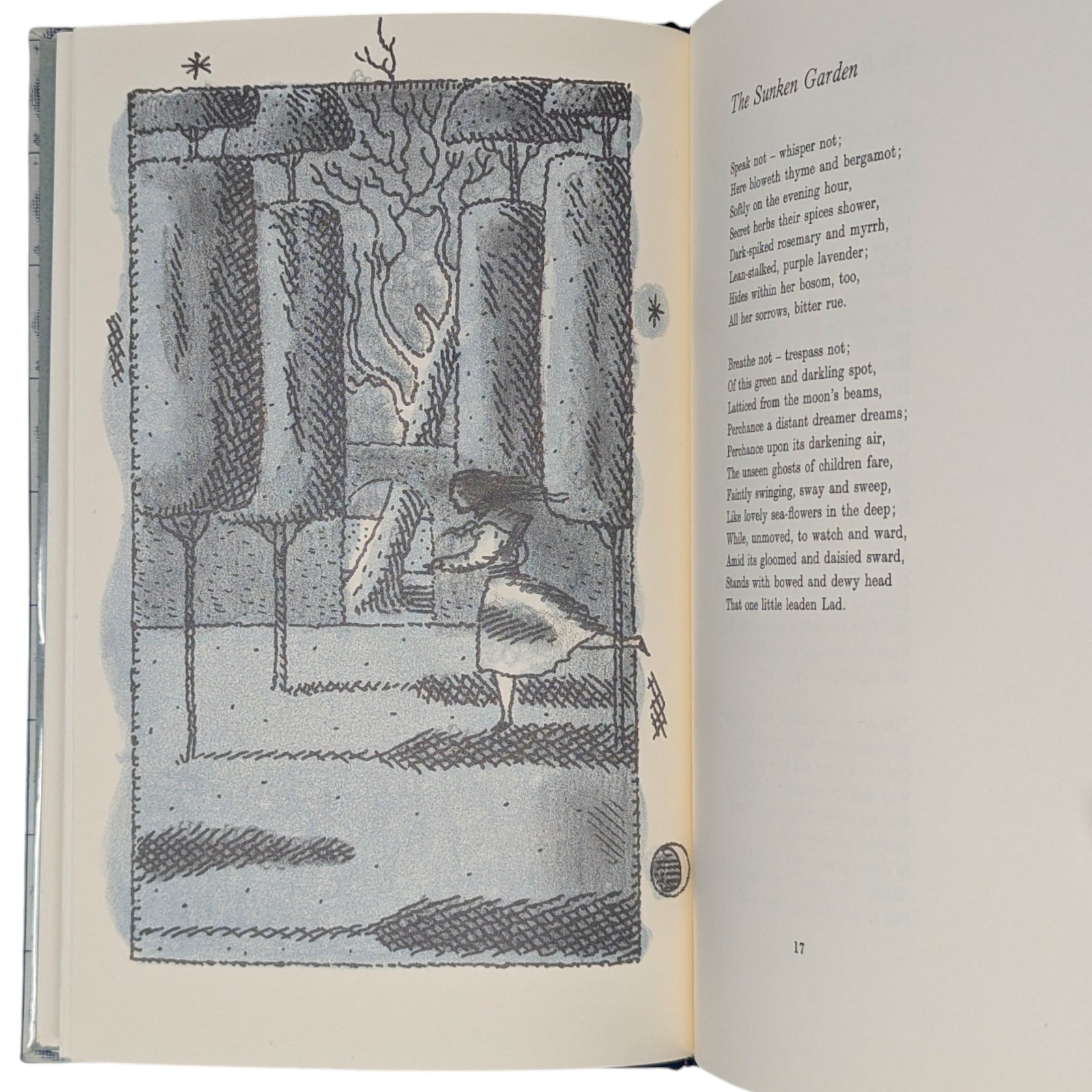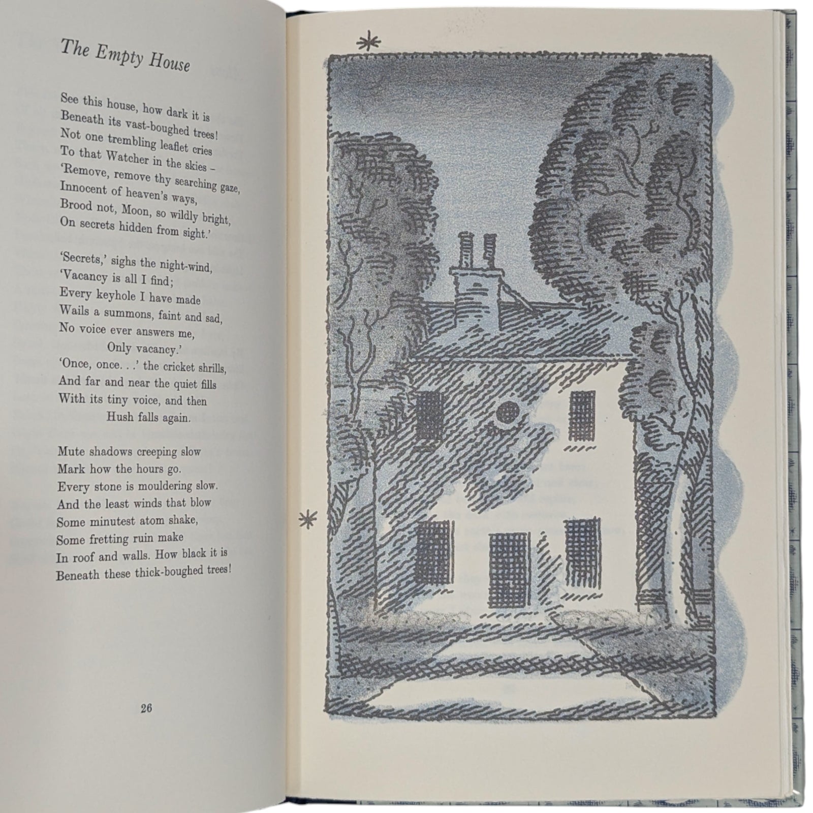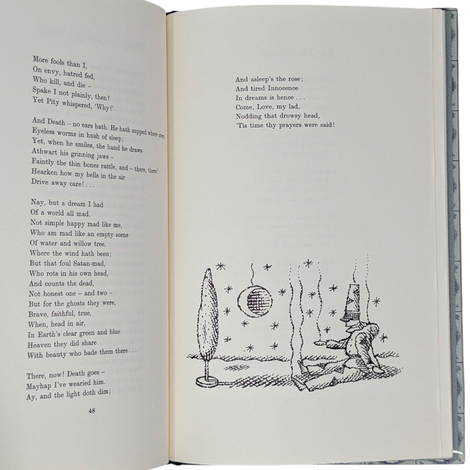 Introduction by Giles de la Mare, lithographs by Ian Archie Beck. Typographical design by Sebastian Carter. 250 × 162 × 14 mm. Pp. [1–4] 5–63 [64]: [7] leaves of two-colour plates (facing pp. [3], 17, 26, 33, 57, 63 and between pp. 52–53). Type: Modern No. 7. Printed (with the title-page in dark blue and black) on white Magnani mould-made paper by the Stamperia Valdonega, the lithographs by the Senecio Press. Bound by Legatoria Torriani in quarter dark blue cloth, white paper boards with a repeat pattern in blue-green and blue by Beck; blue-green endleaves. Transparent plastic dust-jacket. In addition to the plates, which are printed in blue-grey and grey, there are five smaller decorations, printed in the text from line-blocks (three being repeated).