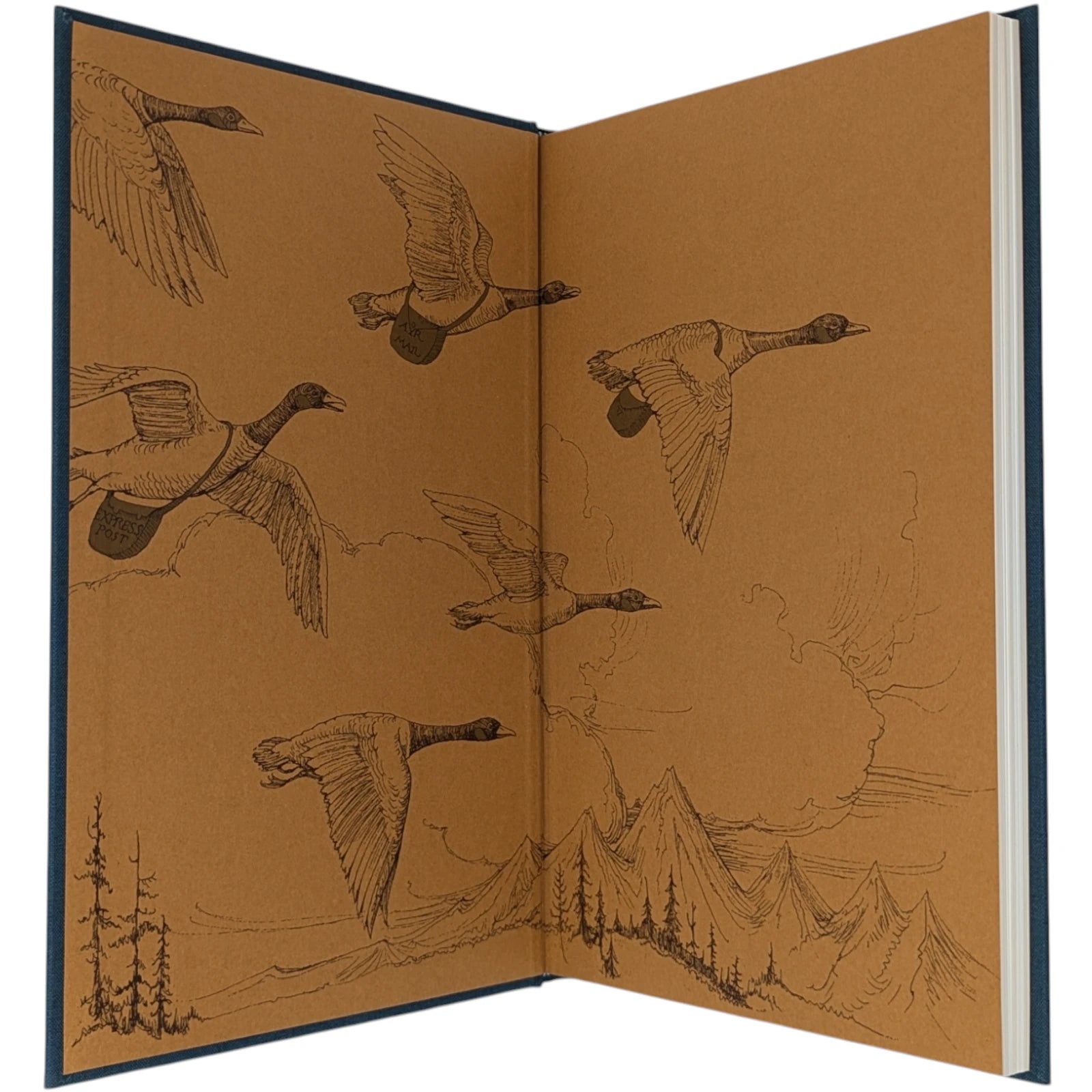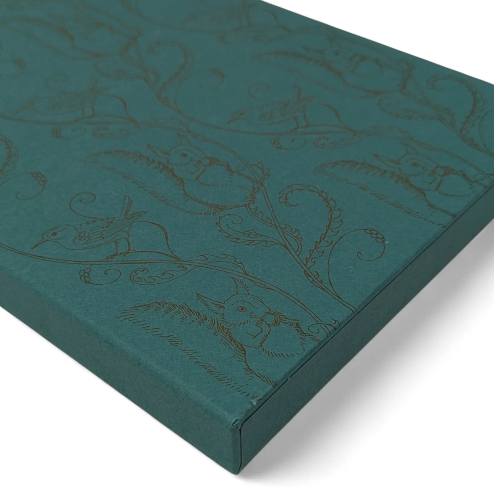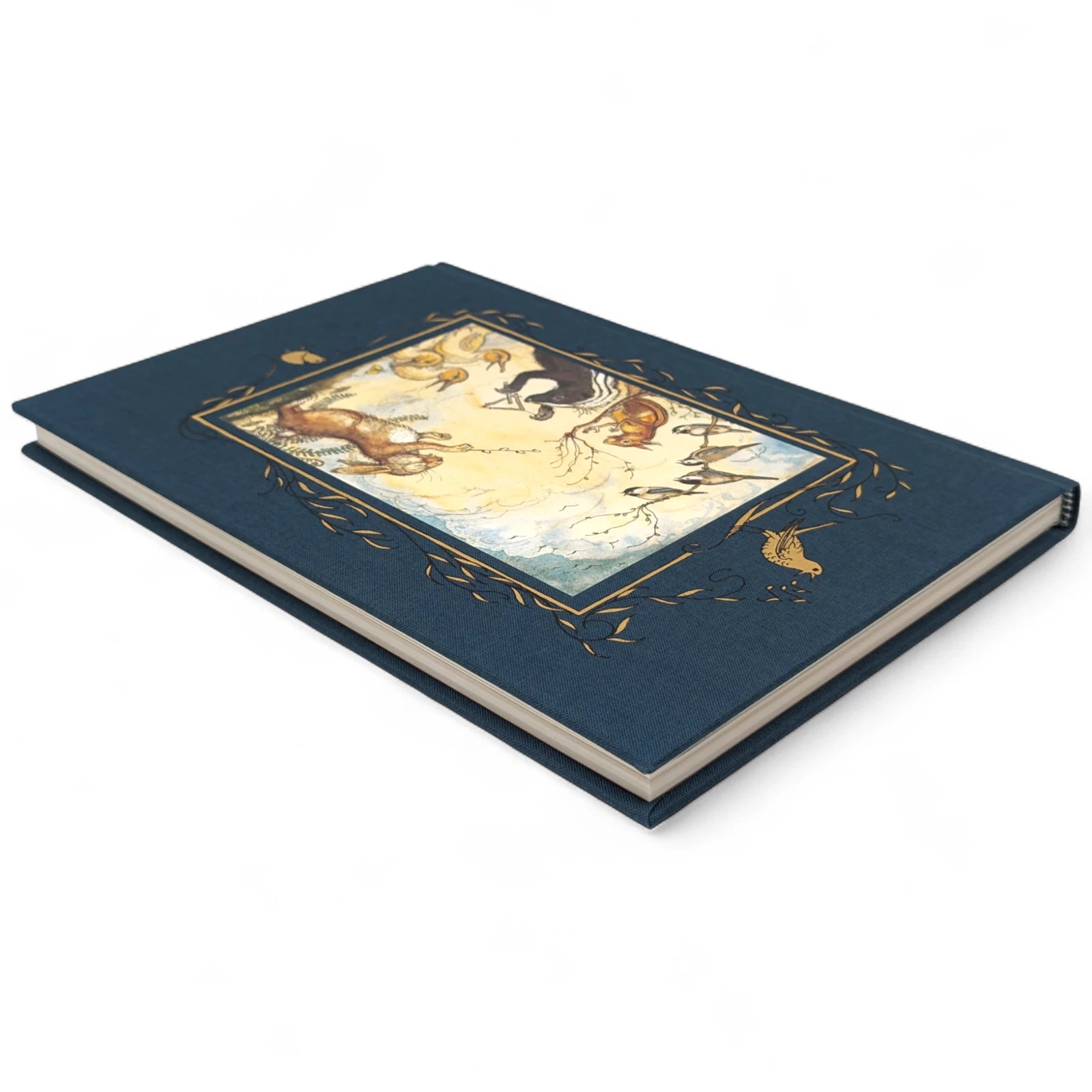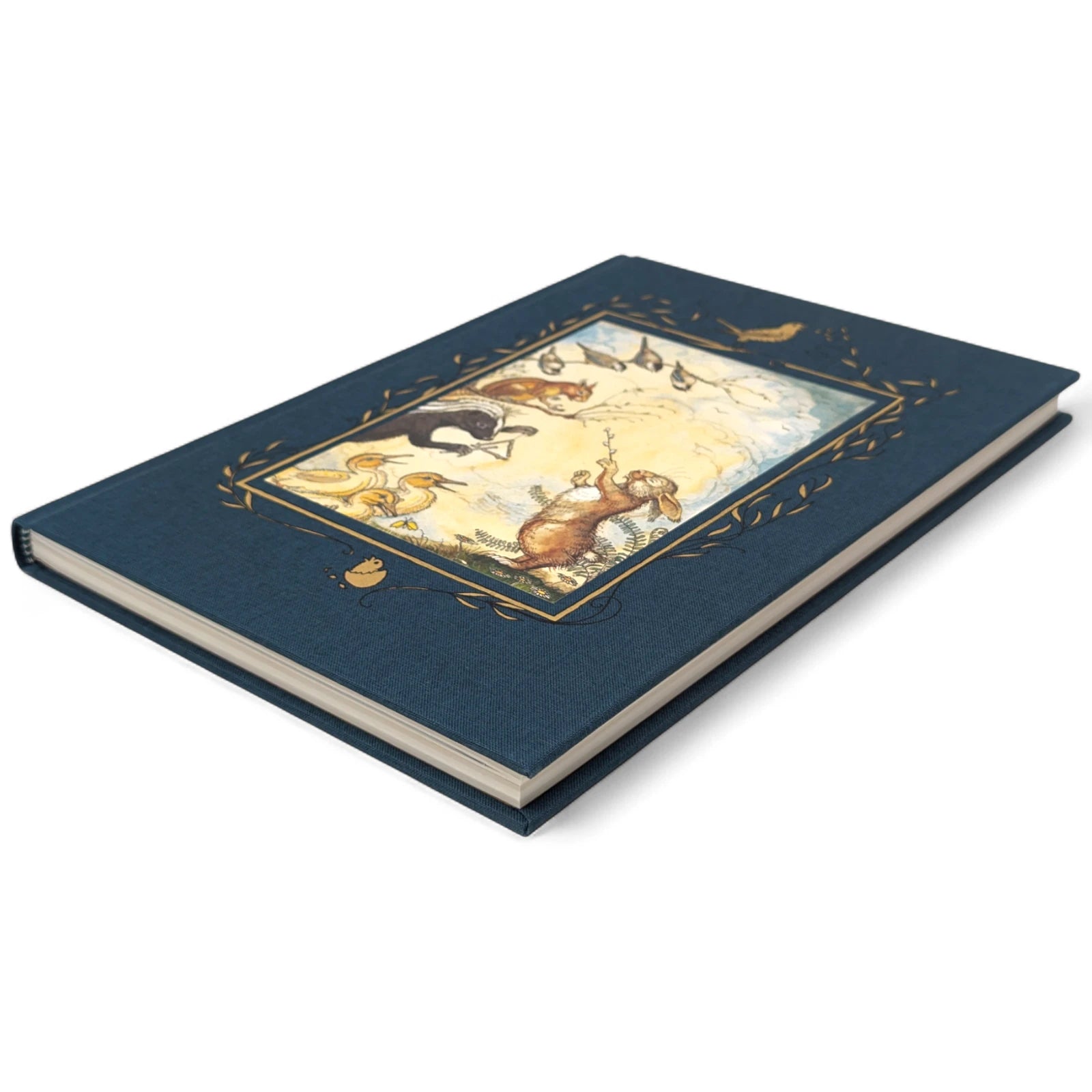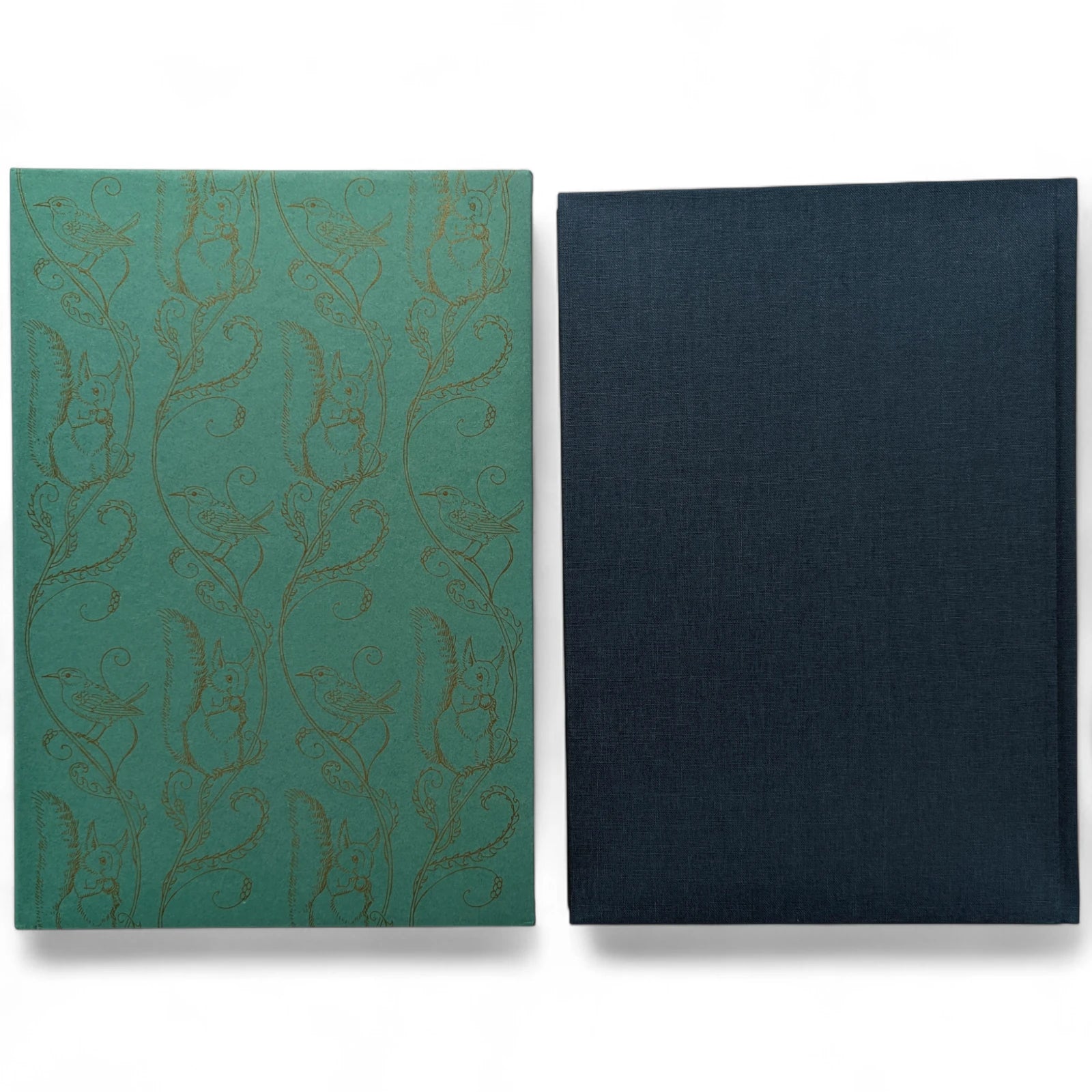 253 × 175 × 17 mm. Pp. [1–6] 7–109 [110–112]. Type: William Morris’s Golden with hand-drawn lettering. Typeset by Blundell Studios. Printed and bound by L.E.G.O. in full dark green cloth blocked in gold and black with a printed inset illustration; pale brown endleaves printed in black and green. Green slip case printed with repeat design in gold. A fold-out is tipped in on page [41] and extends to three leaves. Contains two animal tales and three poems, originally produced in small editions and here accompanied by further illustrations and tail-pieces. The typesetter is Joe Whitlock Blundell, the now retired Folio Production Director.