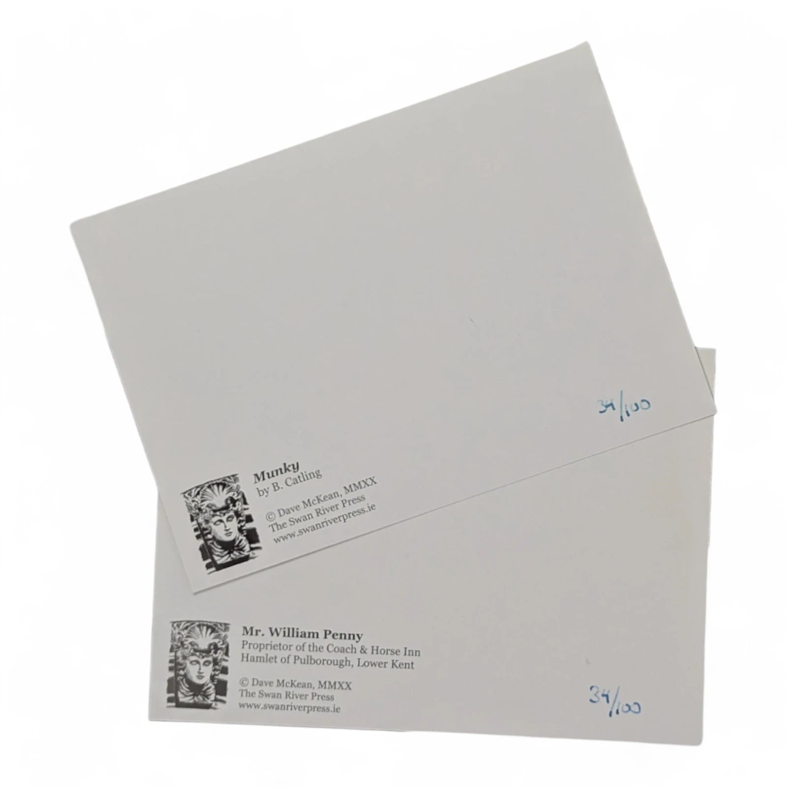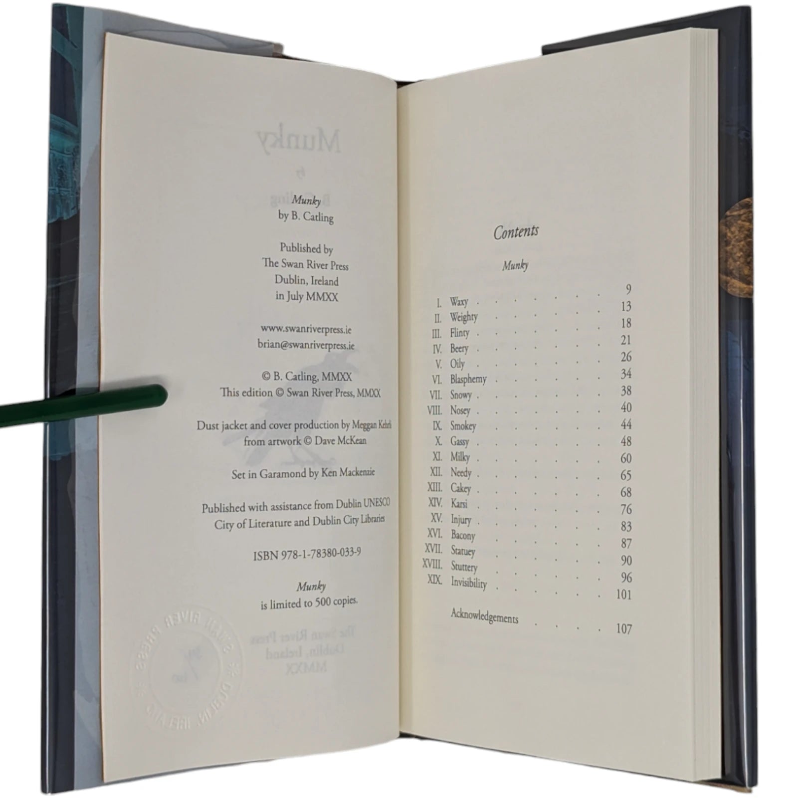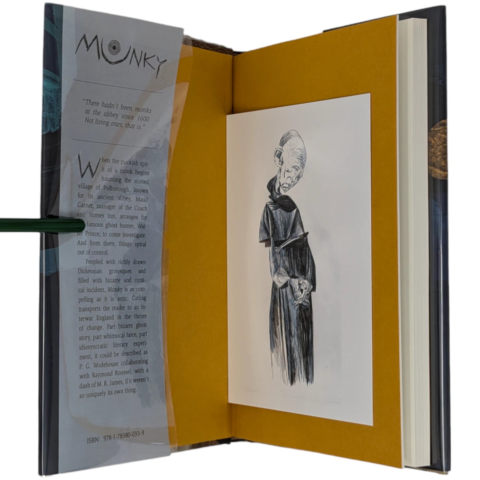 Munky by B. Catling. Dublin: Swan River Press, 2020. Hardback edition limited to 500 copies out of which the first 100 were embossed and hand-numbered. This is number 34, embossed and hand-numbered to title page. Signed by both author Brian Catling and illustrator Dave McKean. Now out of print as a hardback. Rare to find one of the first 100.