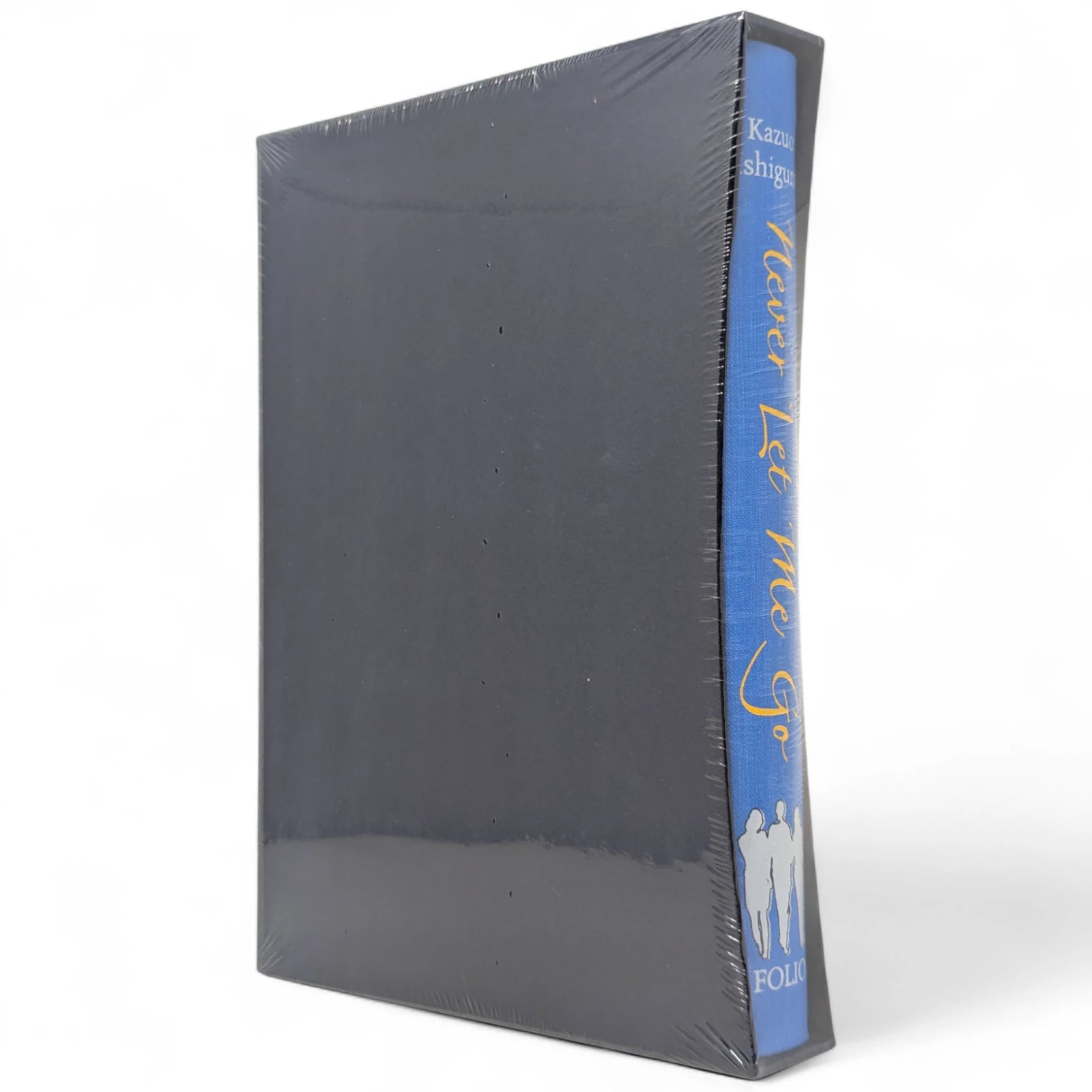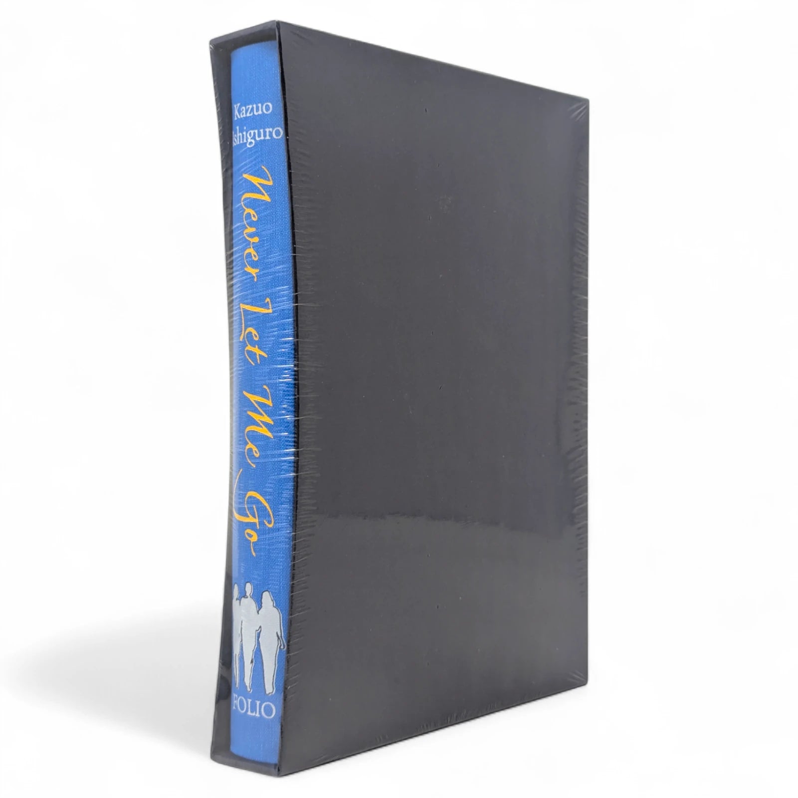 Kazuo Ishiguro, Never Let Me Go. London: The Folio Society, 2012. First printing thus. Introduced by Claire Messud, illustrated by Kate Miller. 229 × 161 × 30 mm. Pp. [i–iv] v–xiv [xv–xvi], [1–6] 7–272: [9] leaves of colour plates (facing pp. [iii], 48, 65, 128, 160, 193, 208, 224 and 241). Type: Figural. Printed by Martins of Berwick. Bound by Hunter and Foulis in full blue cloth blocked in yellow, grey and black with design by Miller; dark blue endleaves. Dark blue slip case.