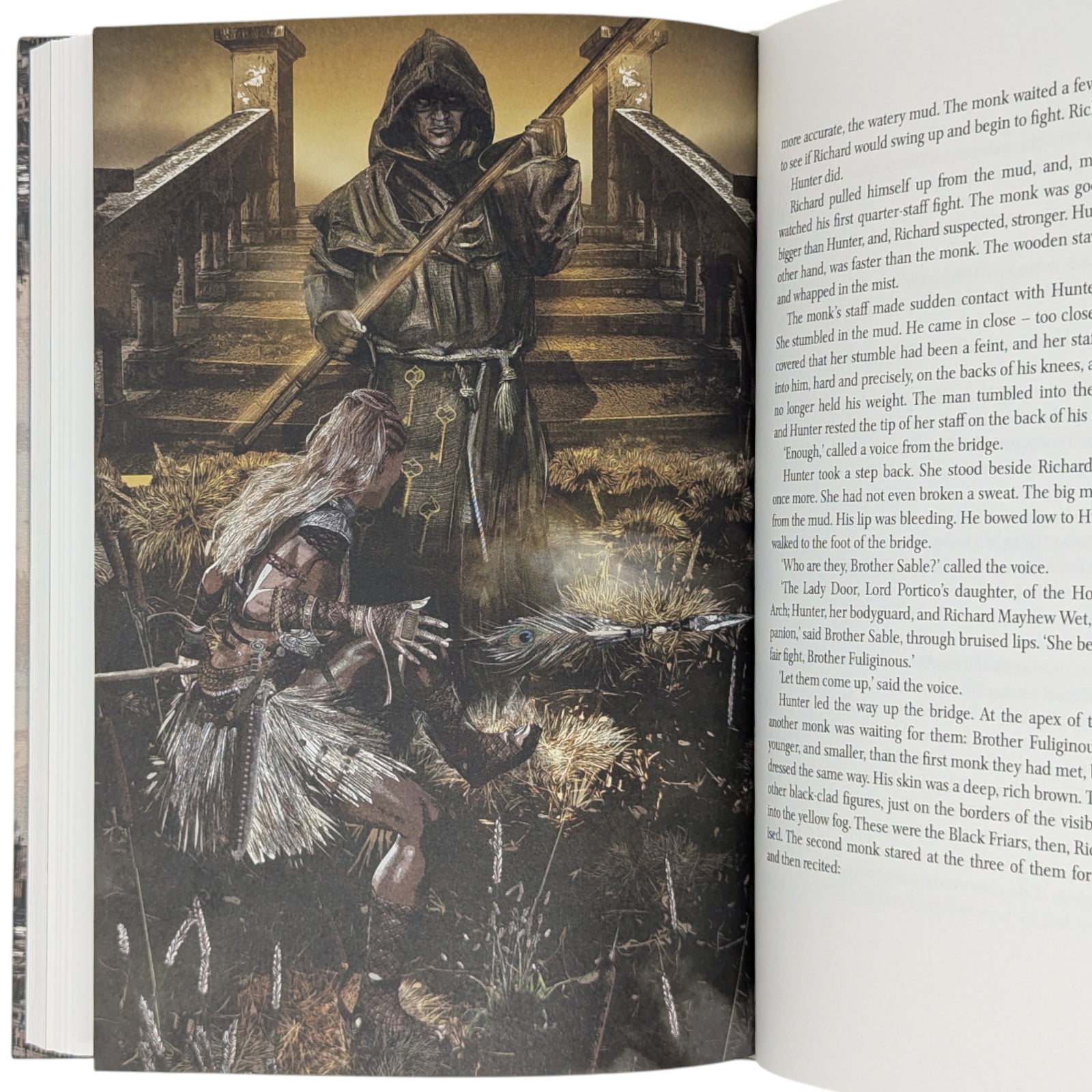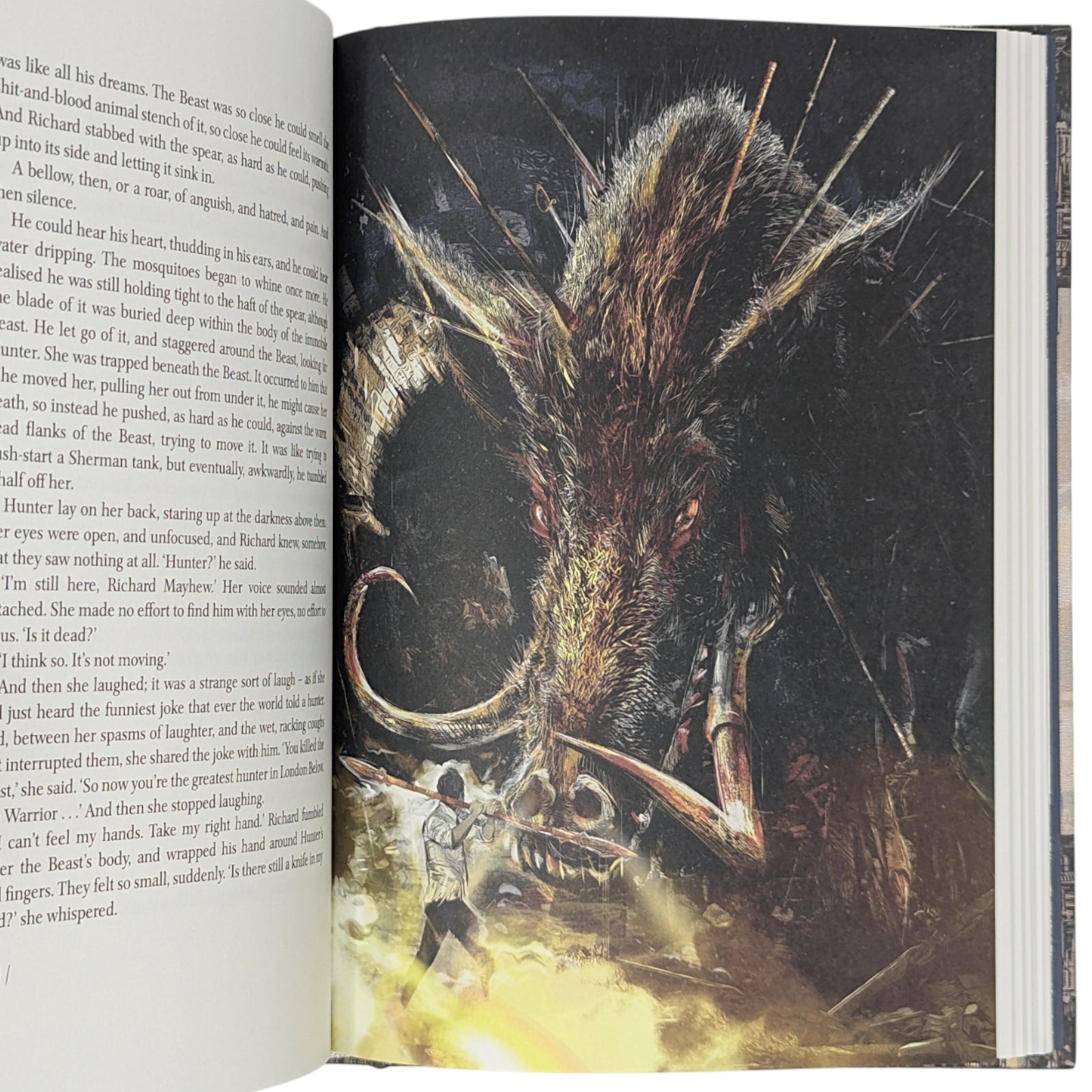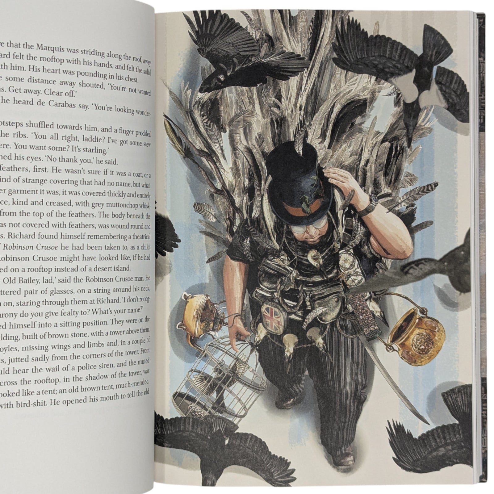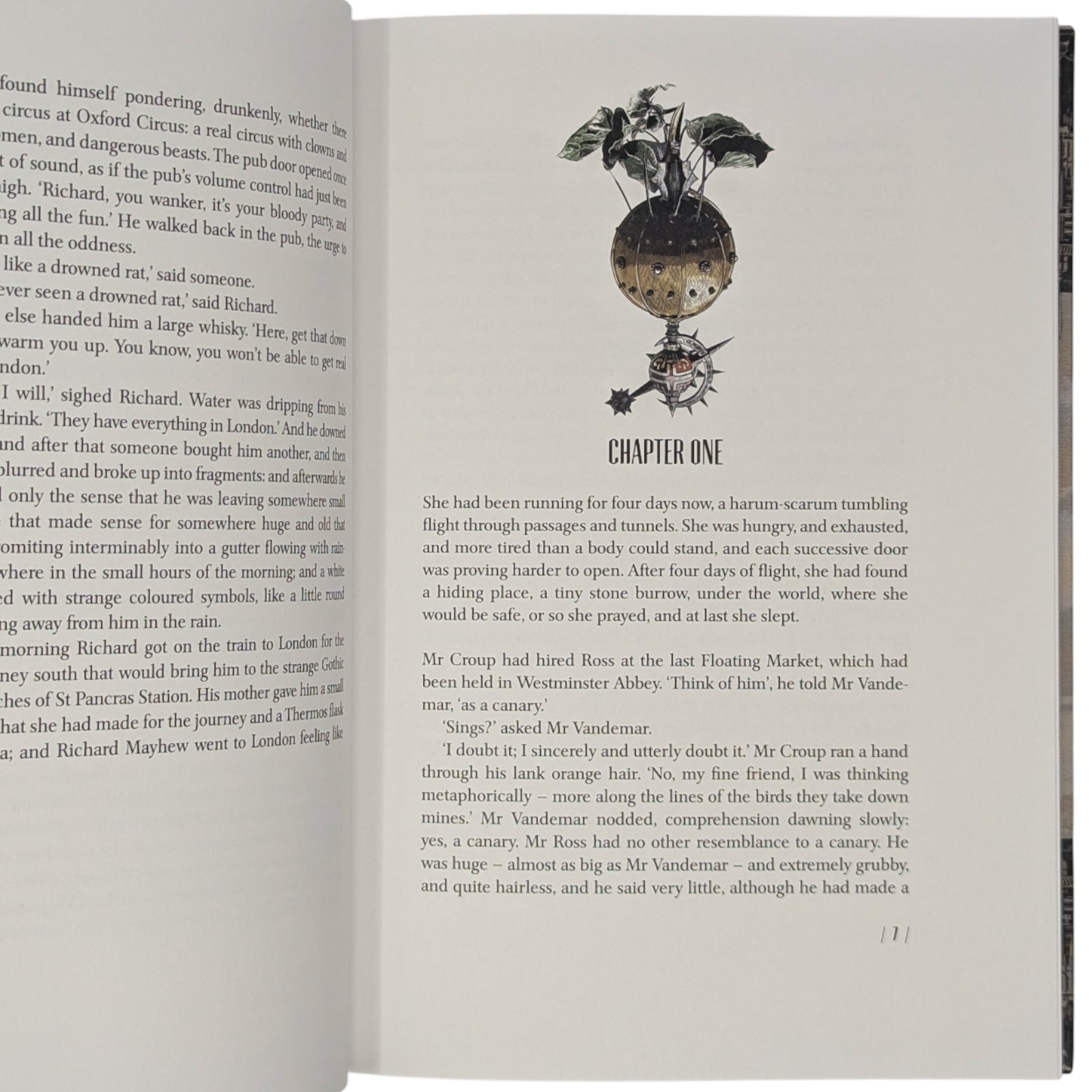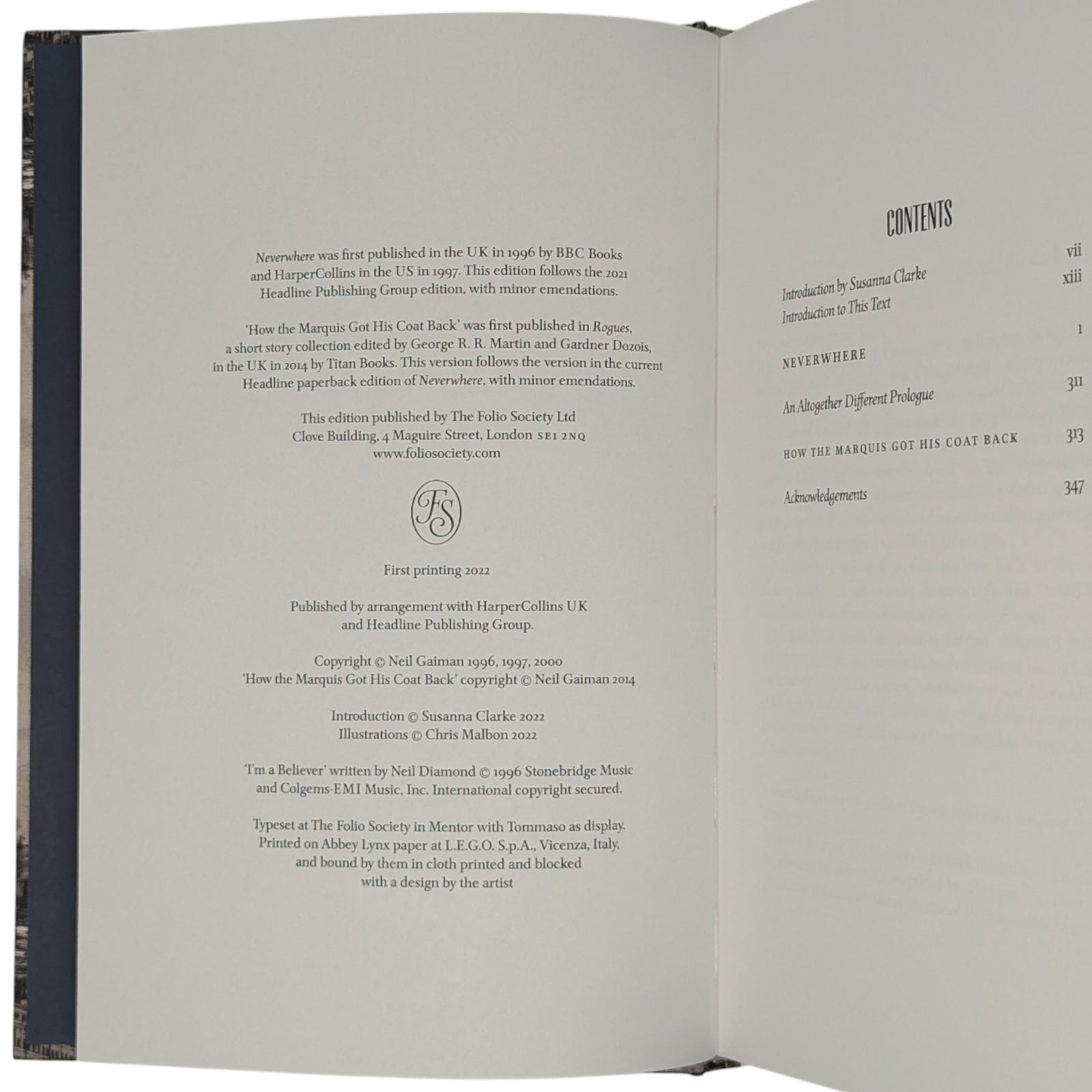 Neverwhere, Neil Gaiman. London: The Folio Society, 2022. First printing thus. Introduced by Susanna Clarke. Illustrated by Chris Malbon. 253 × 176 × 36 mm. Pp. [1–4], [i–iv] v–xiv [xv–xviii], [1–2] 3–347 [348–352]: [9] leaves of colour plates (facing pp. 44, 84, 119, 166, 193, 264, 346, and between pp. 228–229). Type: Mentor with Tommaso for display. Printed and bound by L.E.G.O. in full cloth printed and blocked with design by Malbon. Dark grey-blue endleaves. Printed and blocked slip case. One of the plates is a double-page spread. In addition to the plates, binding and slip case, Malbon has provided a title-page spread, chapter headings plus a double-page spread of a City of London roofscape which opens and closes the book. Concludes with Gaiman’s short story 'How the Marquis Got His Coat Back'.