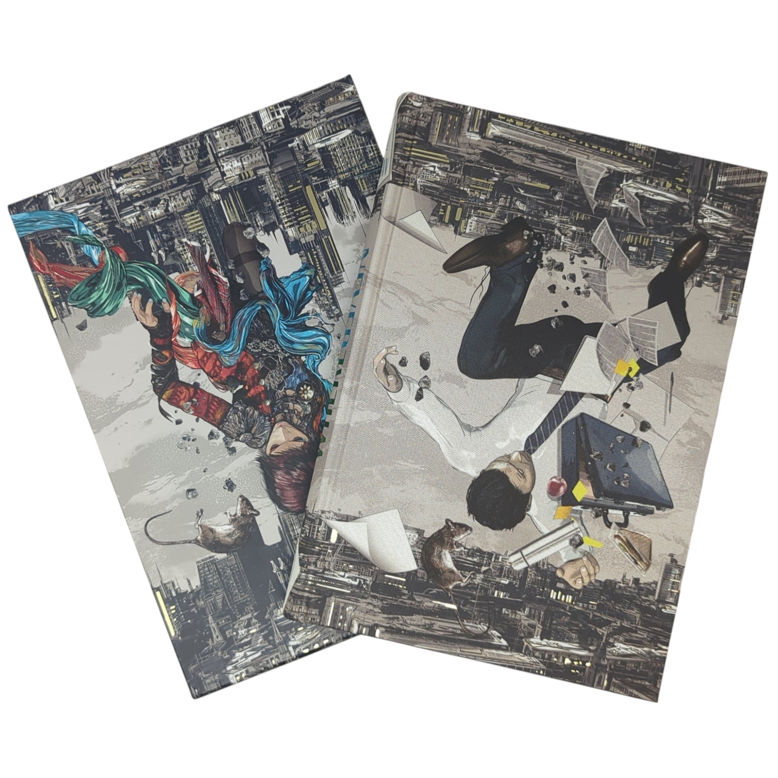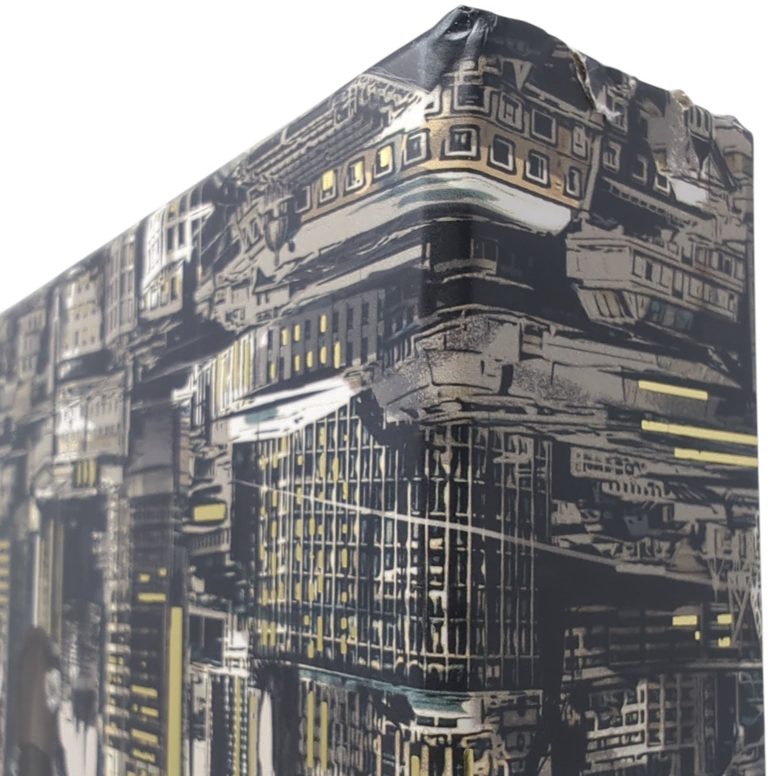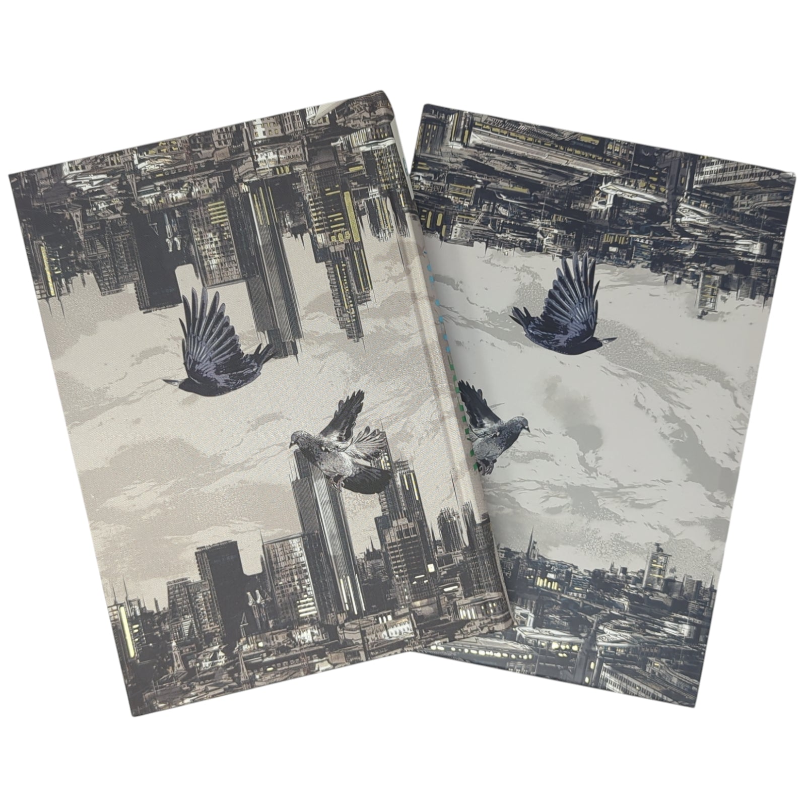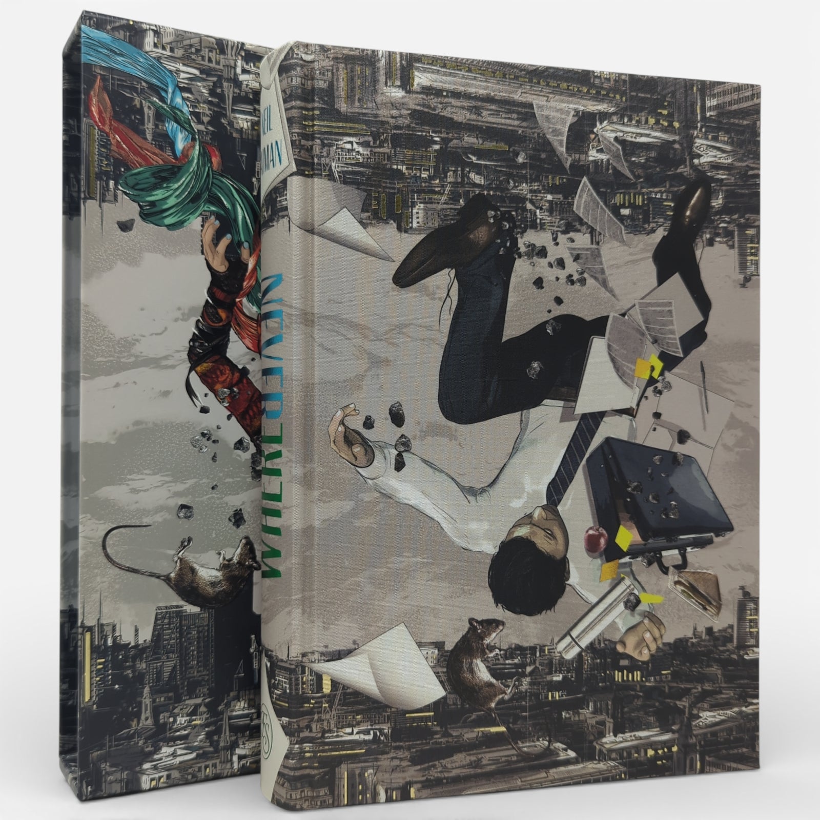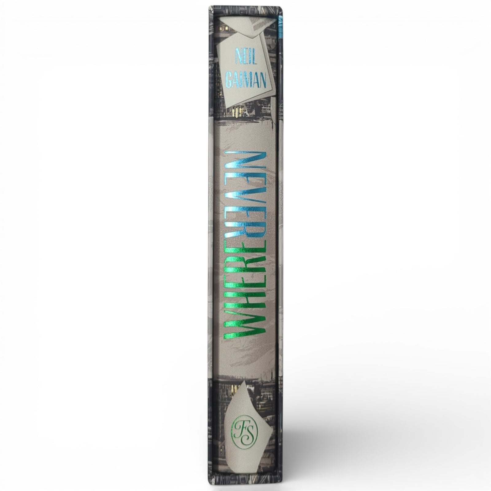 Neverwhere, Neil Gaiman. London: The Folio Society, 2022. First printing thus. Introduced by Susanna Clarke. Illustrated by Chris Malbon. 253 × 176 × 36 mm. Pp. [1–4], [i–iv] v–xiv [xv–xviii], [1–2] 3–347 [348–352]: [9] leaves of colour plates (facing pp. 44, 84, 119, 166, 193, 264, 346, and between pp. 228–229). Type: Mentor with Tommaso for display. Printed and bound by L.E.G.O. in full cloth printed and blocked with design by Malbon. Dark grey-blue endleaves. Printed and blocked slip case. One of the plates is a double-page spread. In addition to the plates, binding and slip case, Malbon has provided a title-page spread, chapter headings plus a double-page spread of a City of London roofscape which opens and closes the book. Concludes with Gaiman’s short story 'How the Marquis Got His Coat Back'.