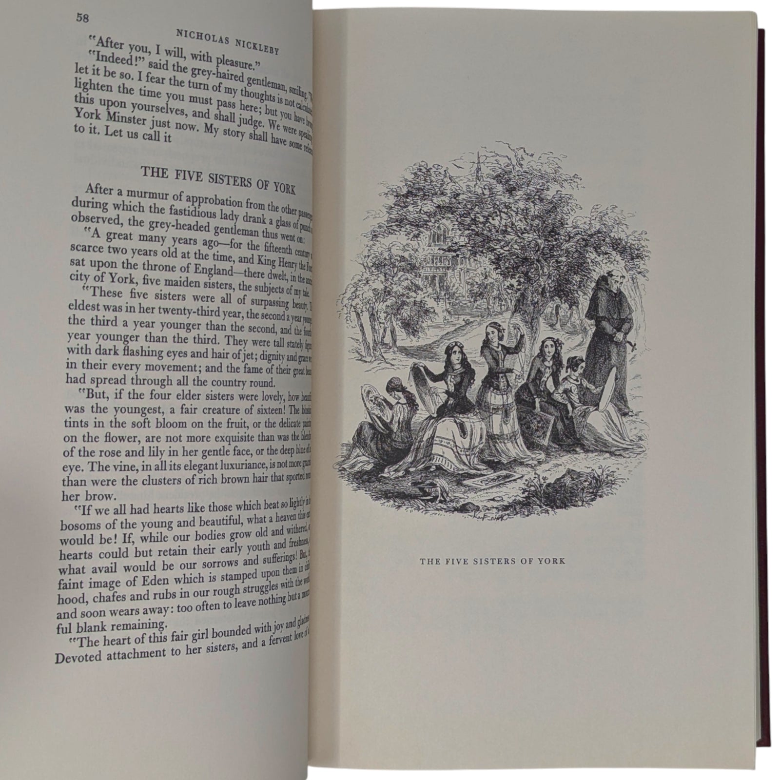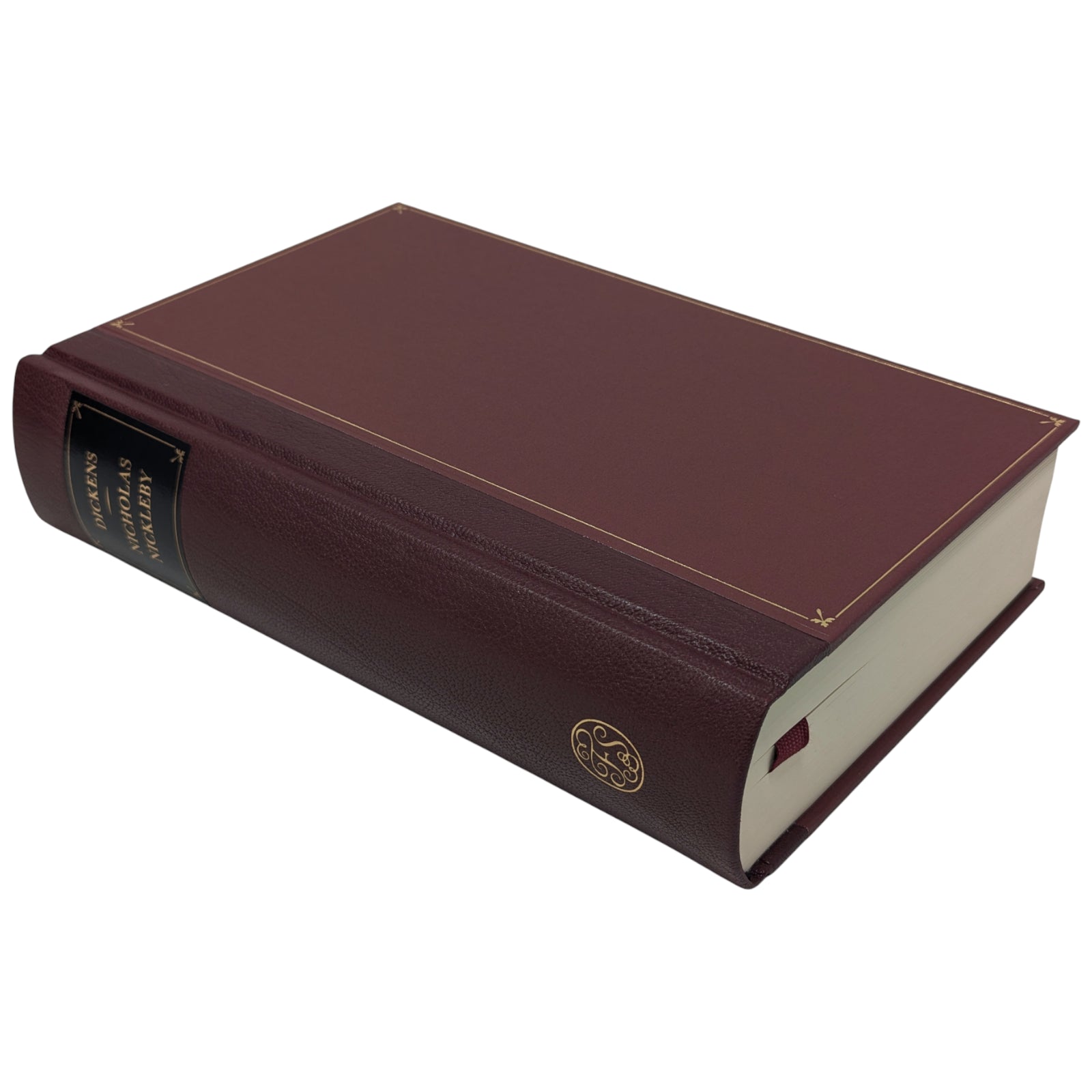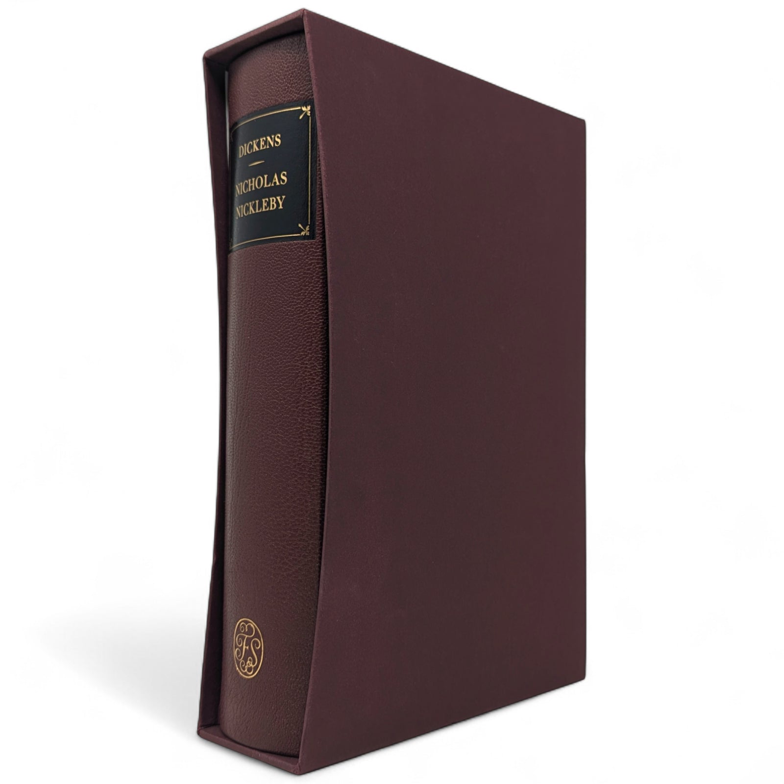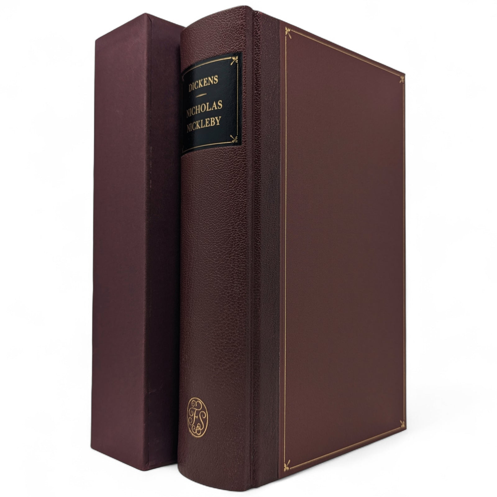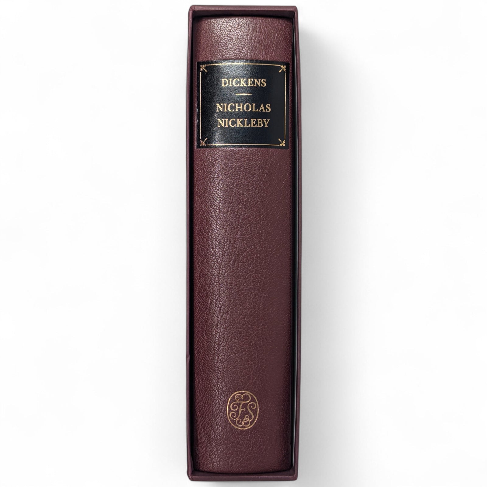 Charles Dickens, Nicholas Nickleby. London: The Folio Society, [2005]. With the original illustrations by “Phiz” [Hablot K. Browne], introduction by Simon Callow. 262 × 172 × 57 mm. Pp. [i–iv] v–xxxix [xl–xlii], 1–835 [836–838]: [40] leaves of ‘plates’. Type: Bulmer with Verdi for display. Typeset by R. and R. Clark for the Nonesuch Press in 1938 (the preliminaries by Folio), printed by the Saint Edmundsbury Press. Bound by Real Lachenmaier in series binding. The frontispiece is not by Browne, but is a reproduction of an engraving by ‘Finden’ (signifying either Richard or Edward Finden, or the firm they founded together) after a painting by Daniel Maclis.