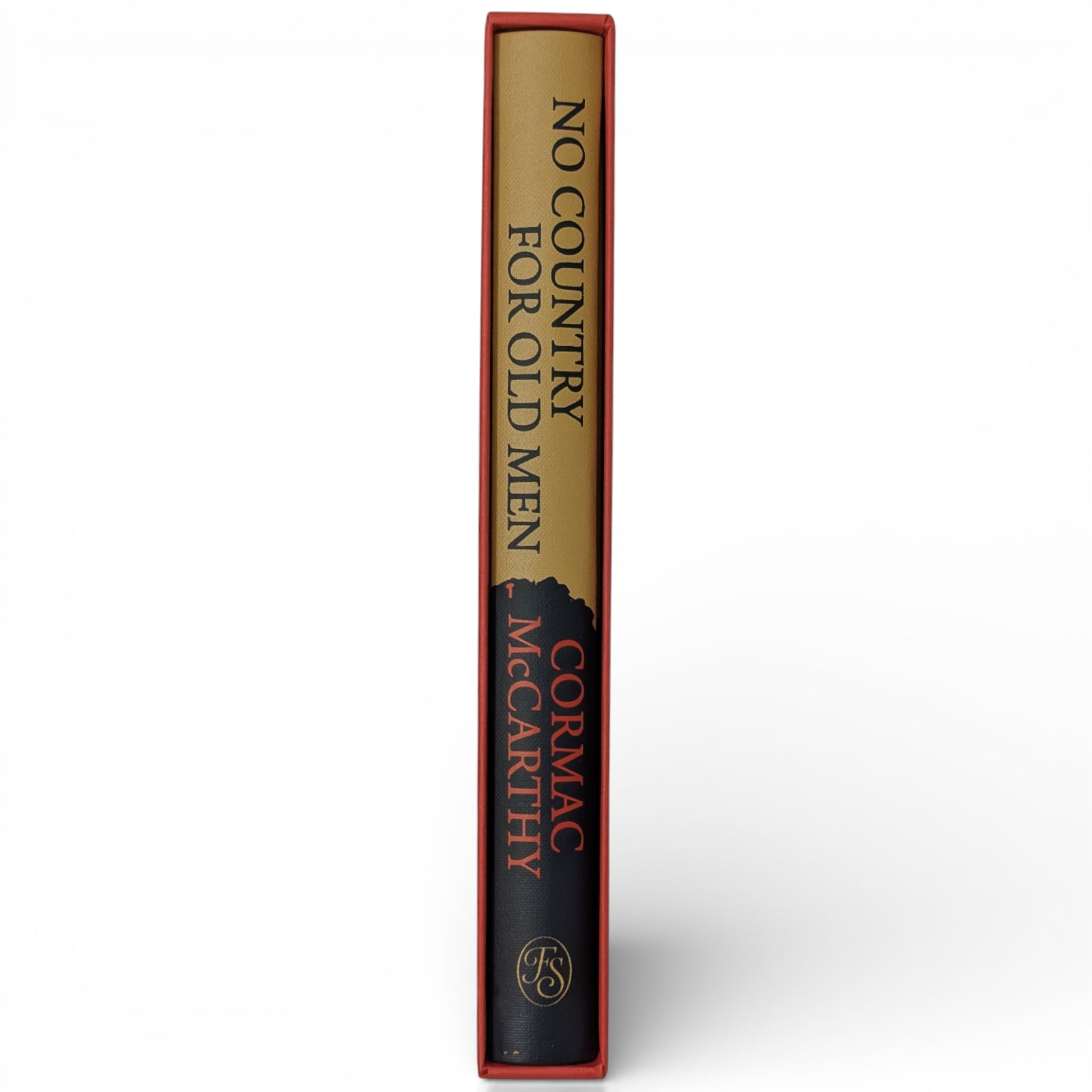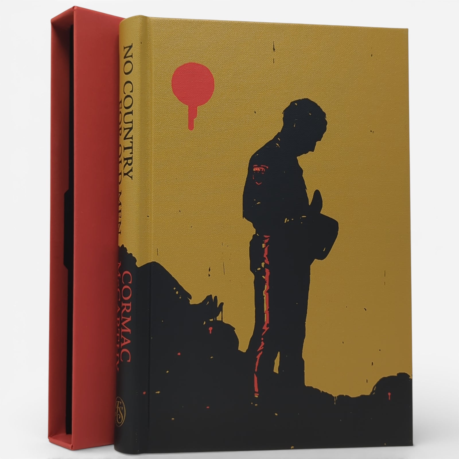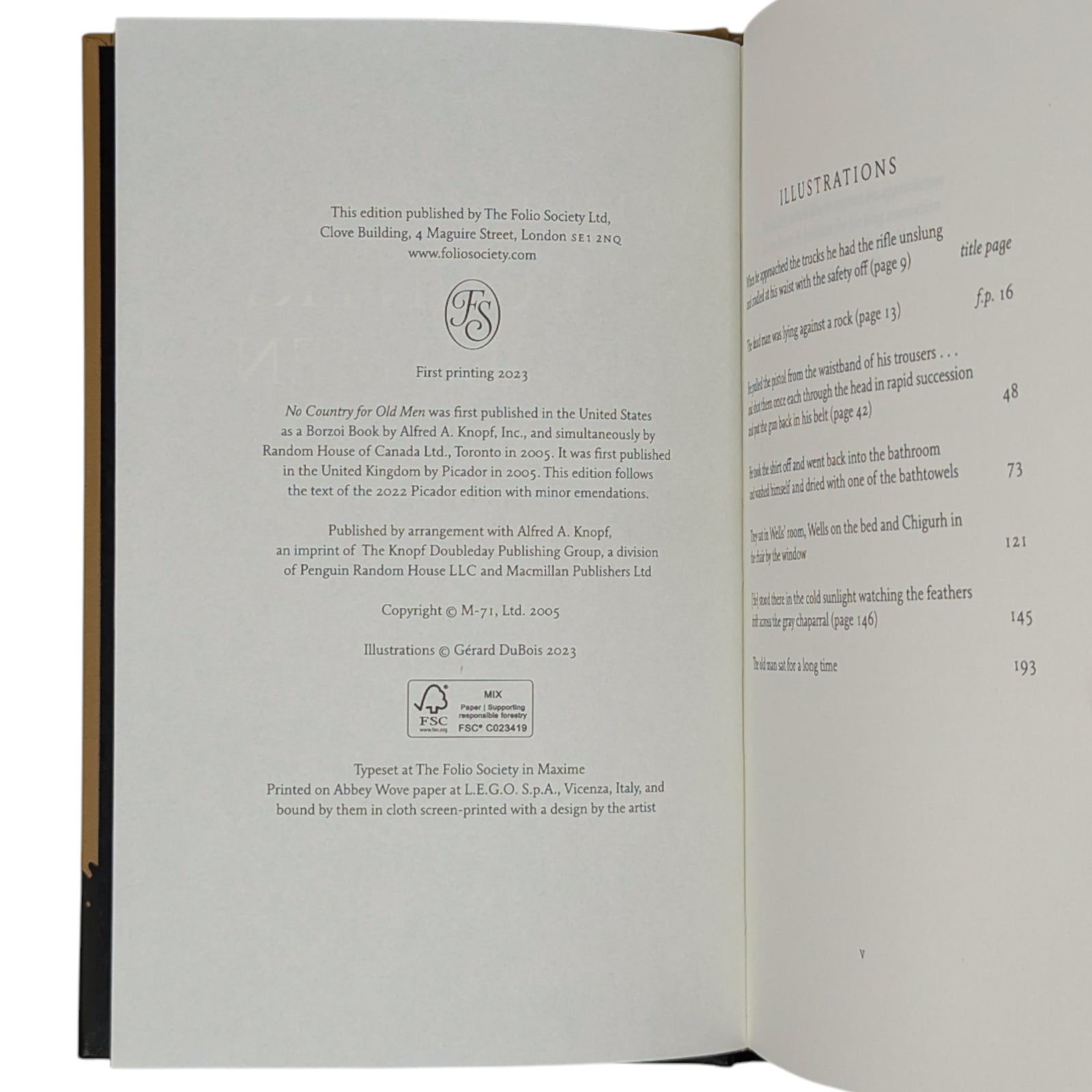 Cormac McCarthy, No Country for Old Men. London: The Folio Society, 2023. First Printing Thus. Illustrated by Gérard DuBois. 229 × 151 × 24 mm. Pp. [i–iv] v [vi–viii], [1–2] 3–214 [215–216]: [6] leaves of colour plates (facing pp. 16, 48, 73, 121, 145 and 193). Type: Maxime. Printed and bound by L.E.G.O. in full pale brown cloth printed with a design by DuBois; black endleaves. Red slip case. In addition to the plates, DuBois provided a title-page spread.