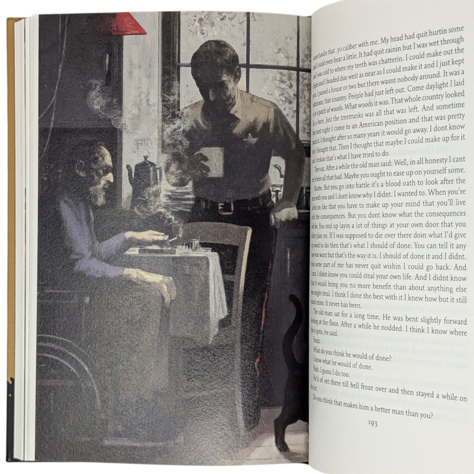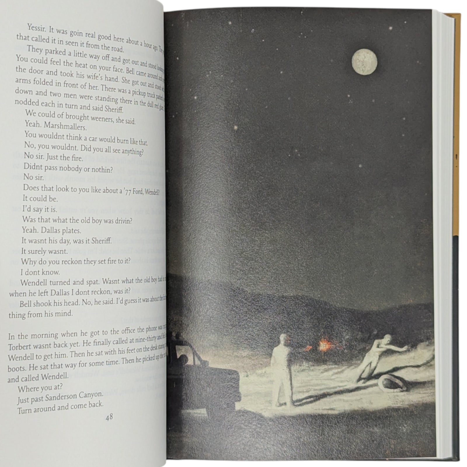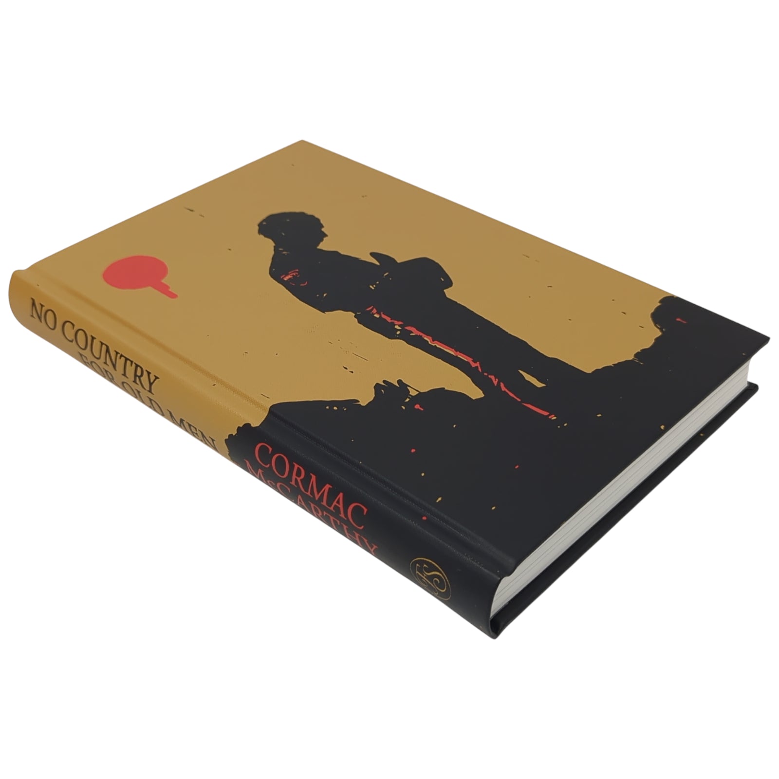 Cormac McCarthy, No Country for Old Men. London: The Folio Society, 2023. First Printing Thus. Illustrated by Gérard DuBois. 229 × 151 × 24 mm. Pp. [i–iv] v [vi–viii], [1–2] 3–214 [215–216]: [6] leaves of colour plates (facing pp. 16, 48, 73, 121, 145 and 193). Type: Maxime. Printed and bound by L.E.G.O. in full pale brown cloth printed with a design by DuBois; black endleaves. Red slip case. In addition to the plates, DuBois provided a title-page spread.