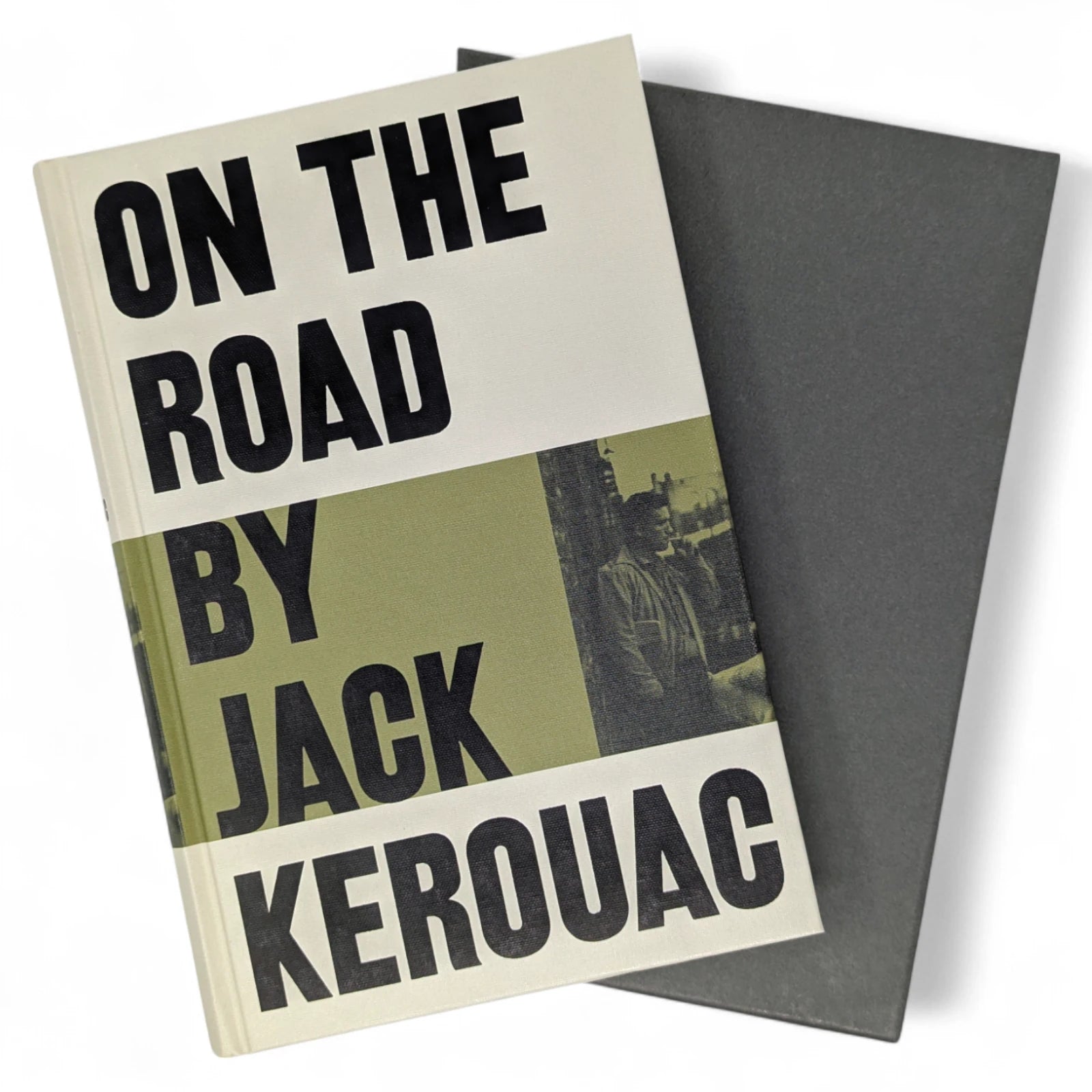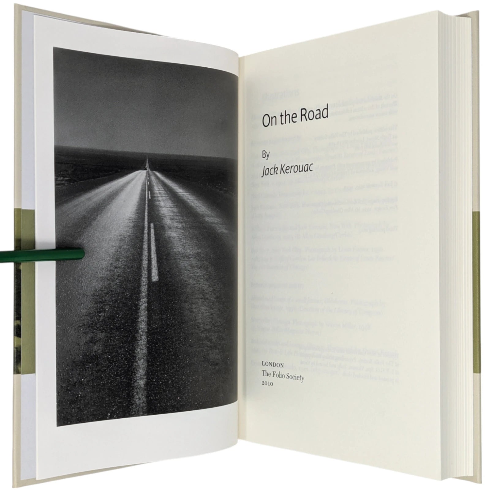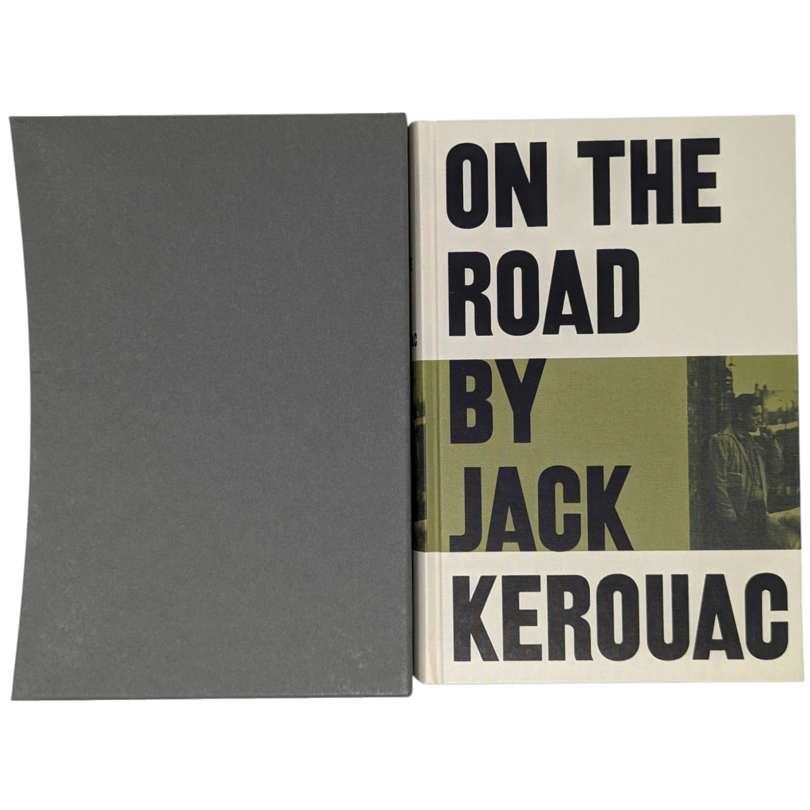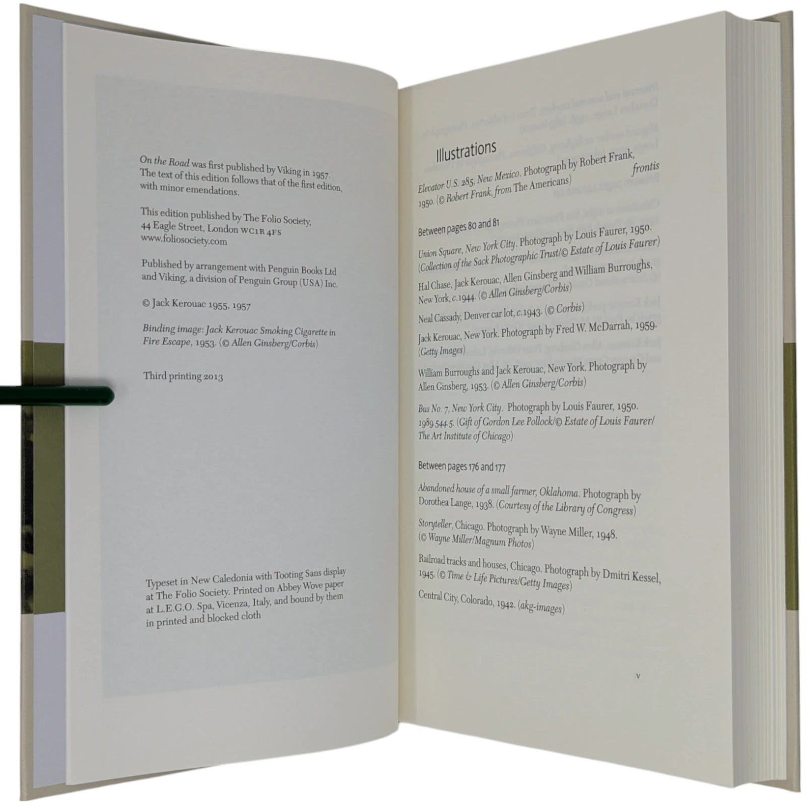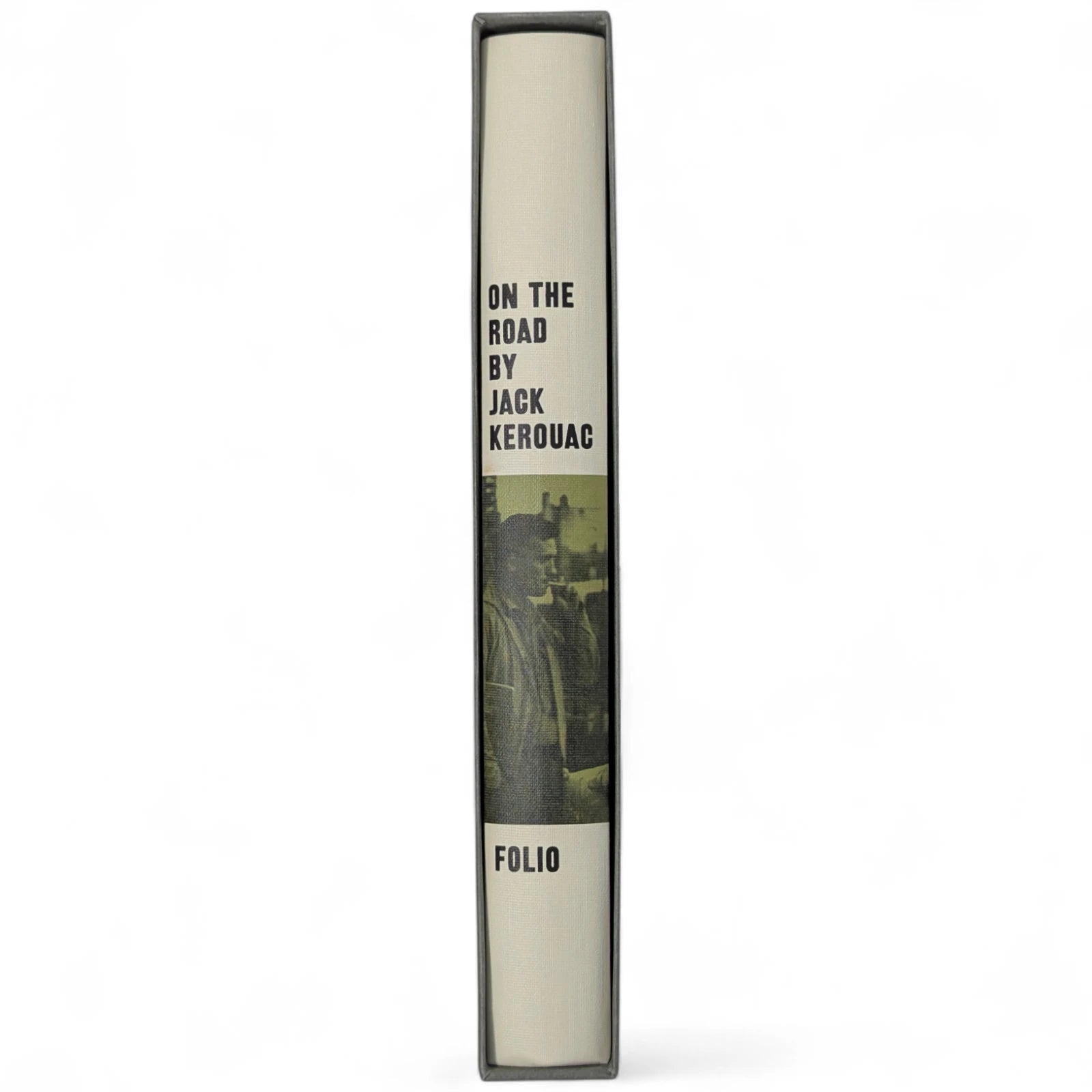 On the Road, by Jack Kerouac. London: The Folio Society, 2010. Third printing thus, 2013. 242 × 163 × 28 mm. Pp. [i–iv] v–vi [vii–viii], [1–2] 3–275 [276–280]: [7] leaves of plates (facing p. [iii] and between pp. 80–81, 176–177 and 240–241). Type: New Caledonia with Tooting Sans for display. Printed and bound by L.E.G.O. in full grey-cream cloth printed and blocked in black and green. Pale grey endleaves with green stripe. Grey slip case.