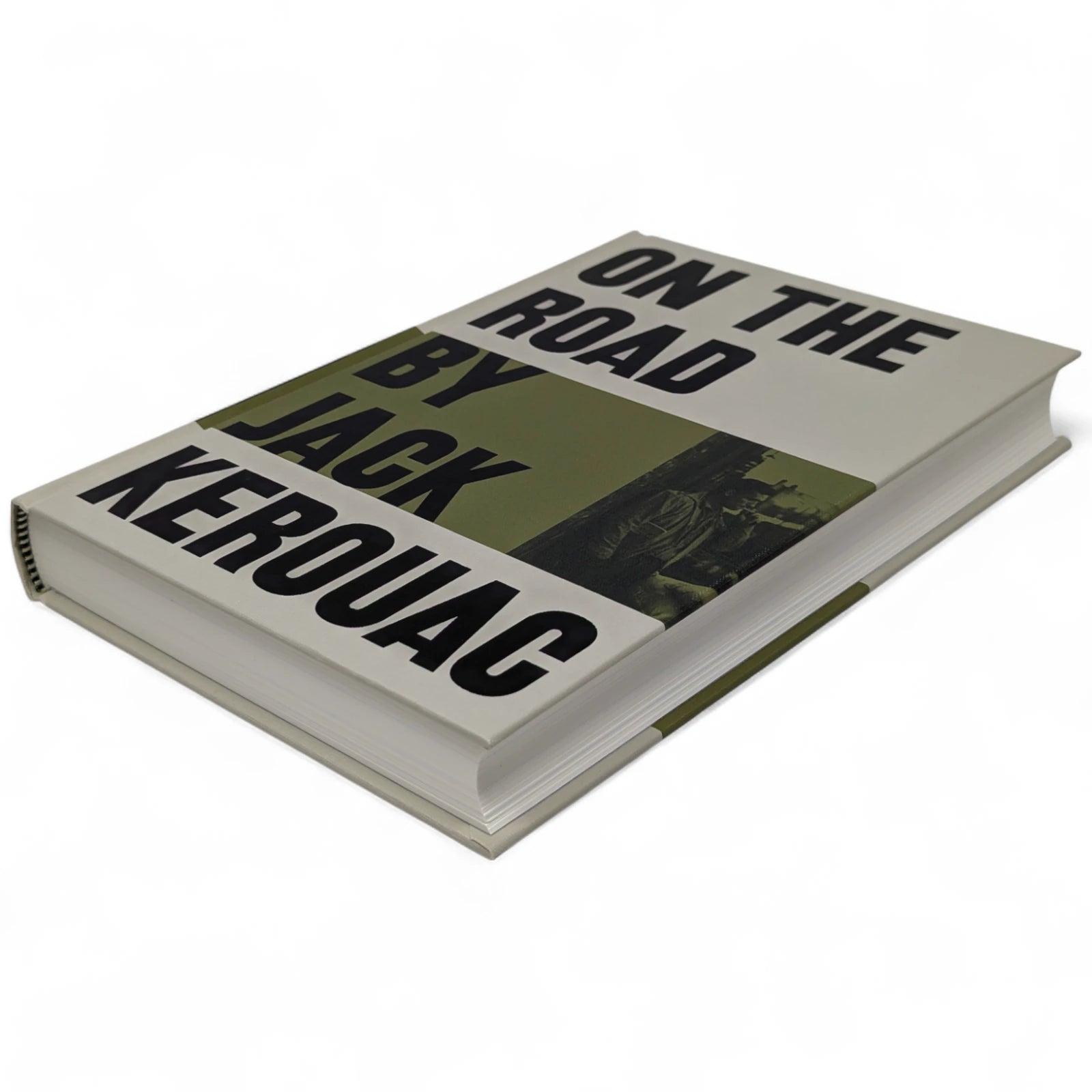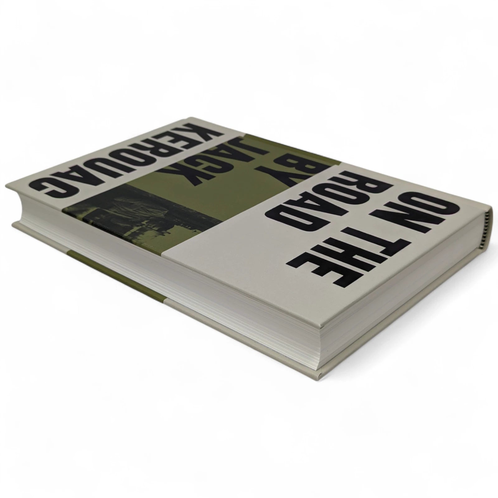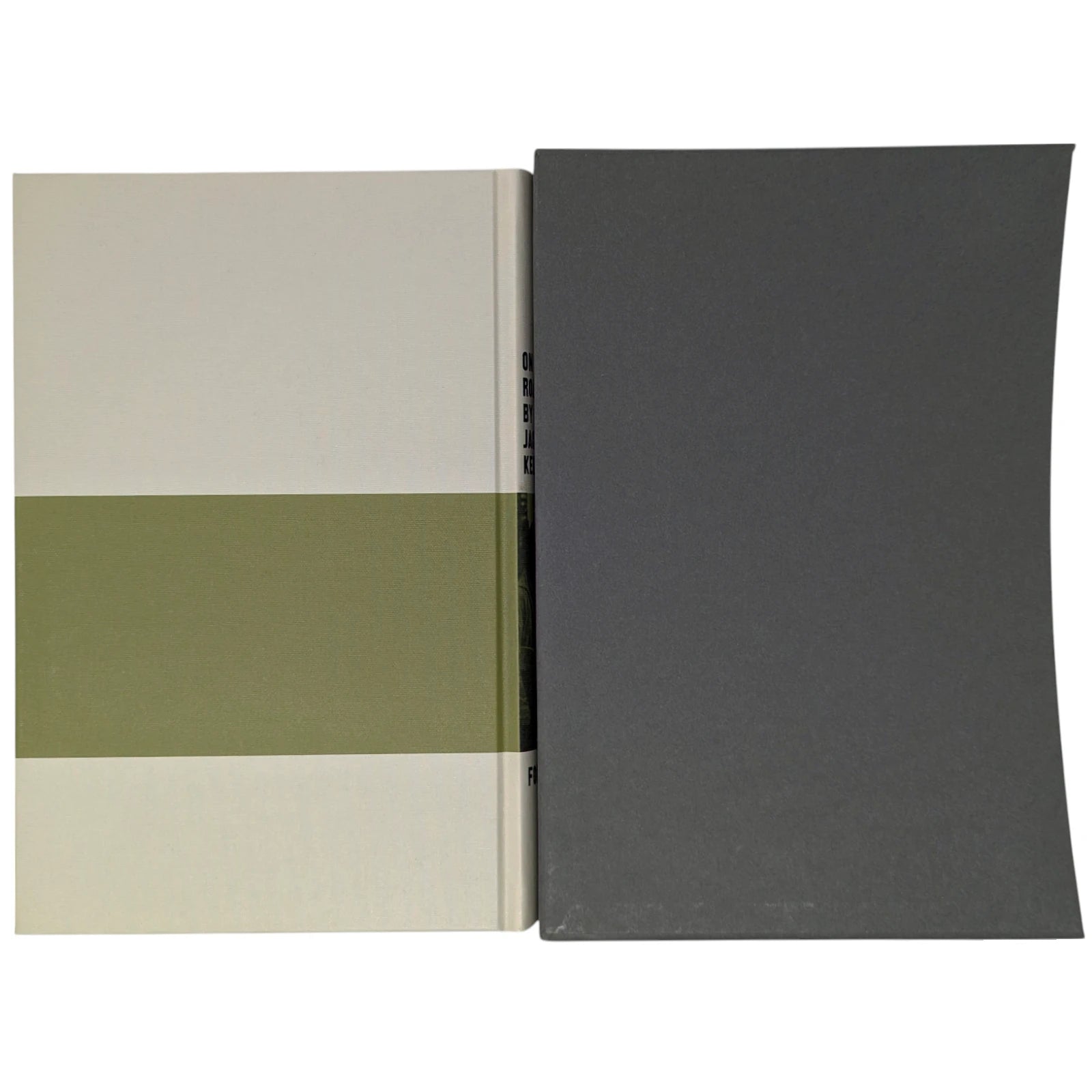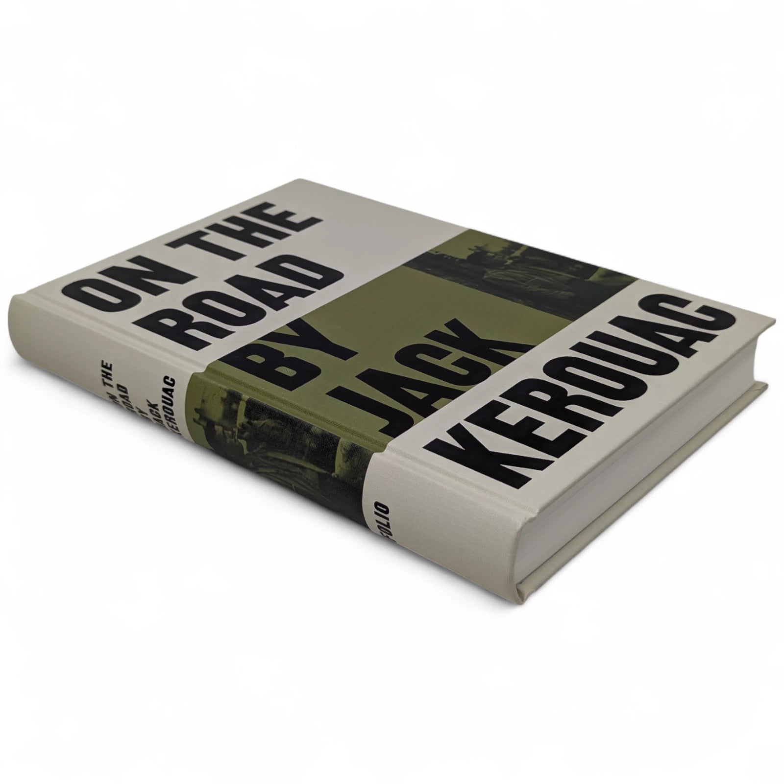 On the Road, by Jack Kerouac. London: The Folio Society, 2010. Third printing thus, 2013. 242 × 163 × 28 mm. Pp. [i–iv] v–vi [vii–viii], [1–2] 3–275 [276–280]: [7] leaves of plates (facing p. [iii] and between pp. 80–81, 176–177 and 240–241). Type: New Caledonia with Tooting Sans for display. Printed and bound by L.E.G.O. in full grey-cream cloth printed and blocked in black and green. Pale grey endleaves with green stripe. Grey slip case.