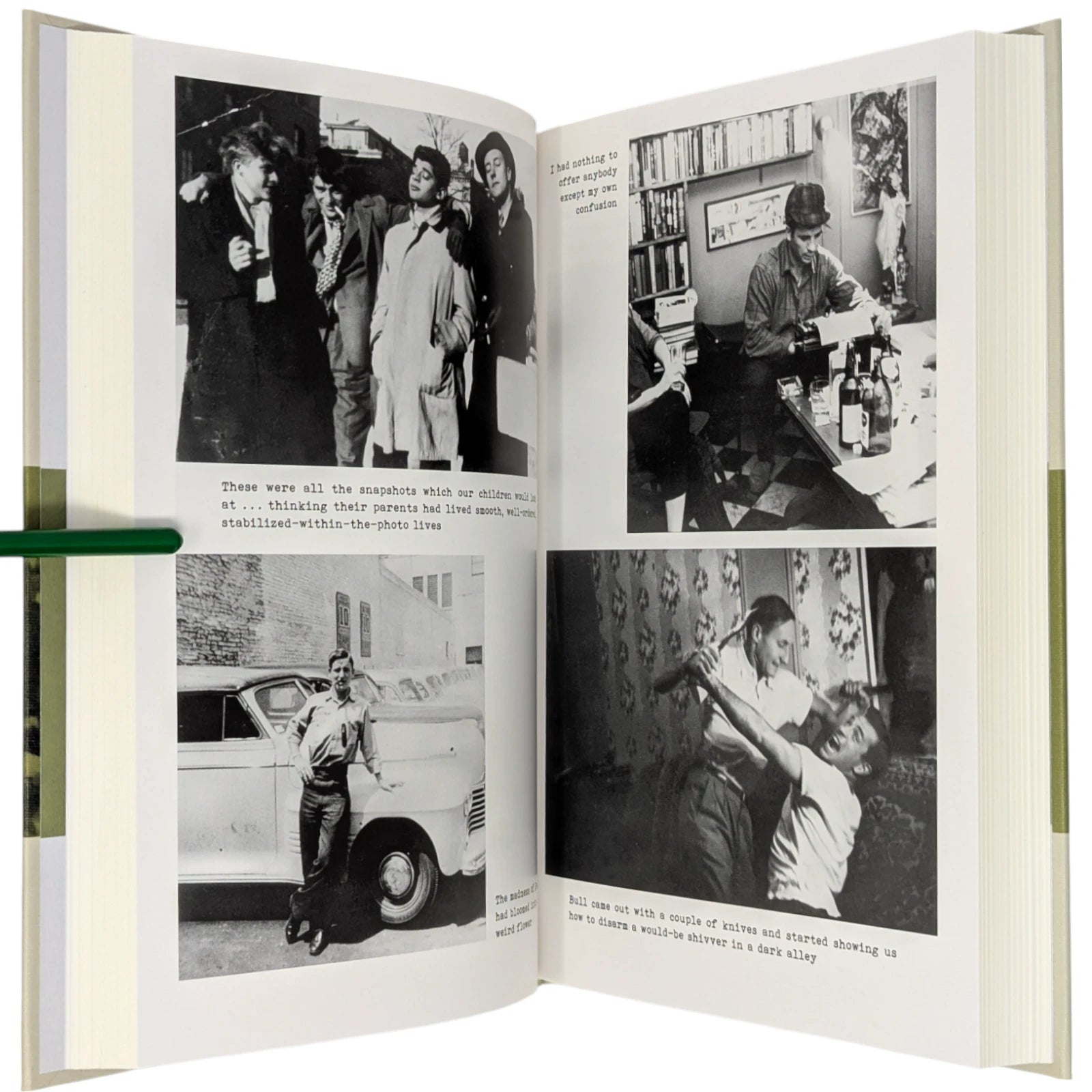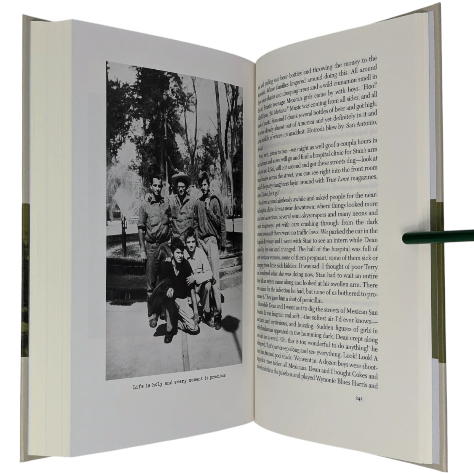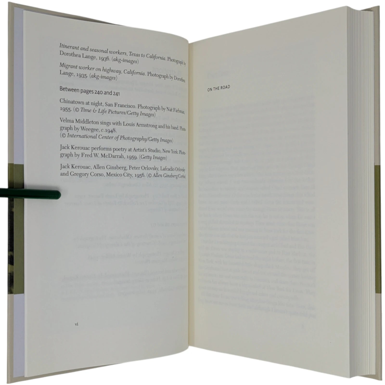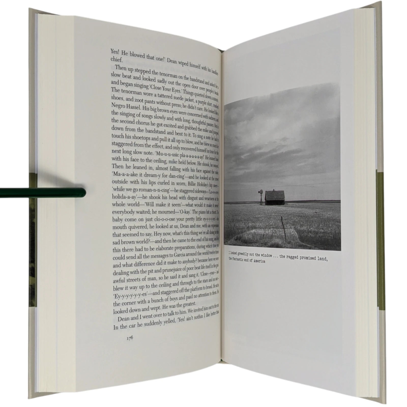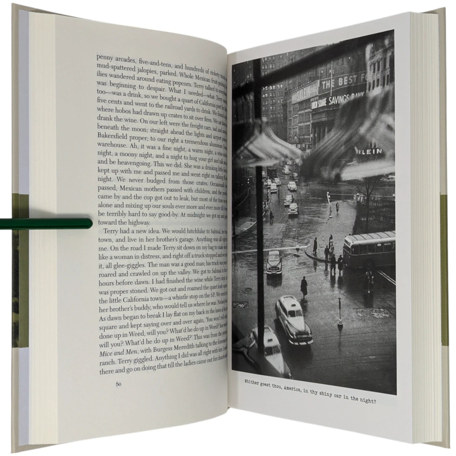 On the Road, by Jack Kerouac. London: The Folio Society, 2010. Third printing thus, 2013. 242 × 163 × 28 mm. Pp. [i–iv] v–vi [vii–viii], [1–2] 3–275 [276–280]: [7] leaves of plates (facing p. [iii] and between pp. 80–81, 176–177 and 240–241). Type: New Caledonia with Tooting Sans for display. Printed and bound by L.E.G.O. in full grey-cream cloth printed and blocked in black and green. Pale grey endleaves with green stripe. Grey slip case.