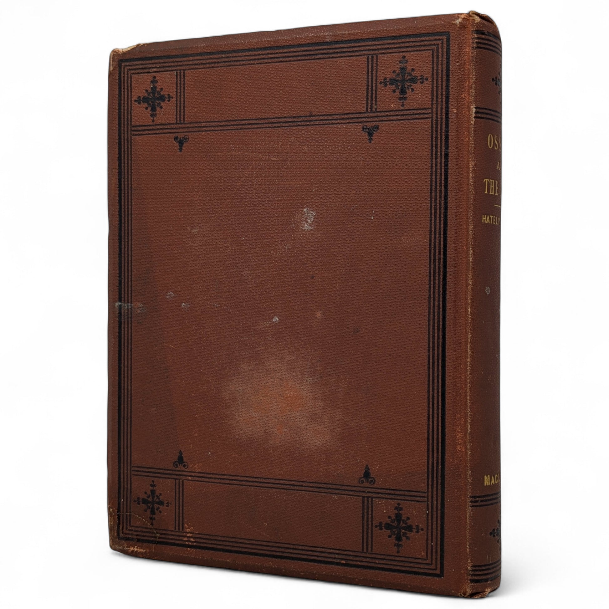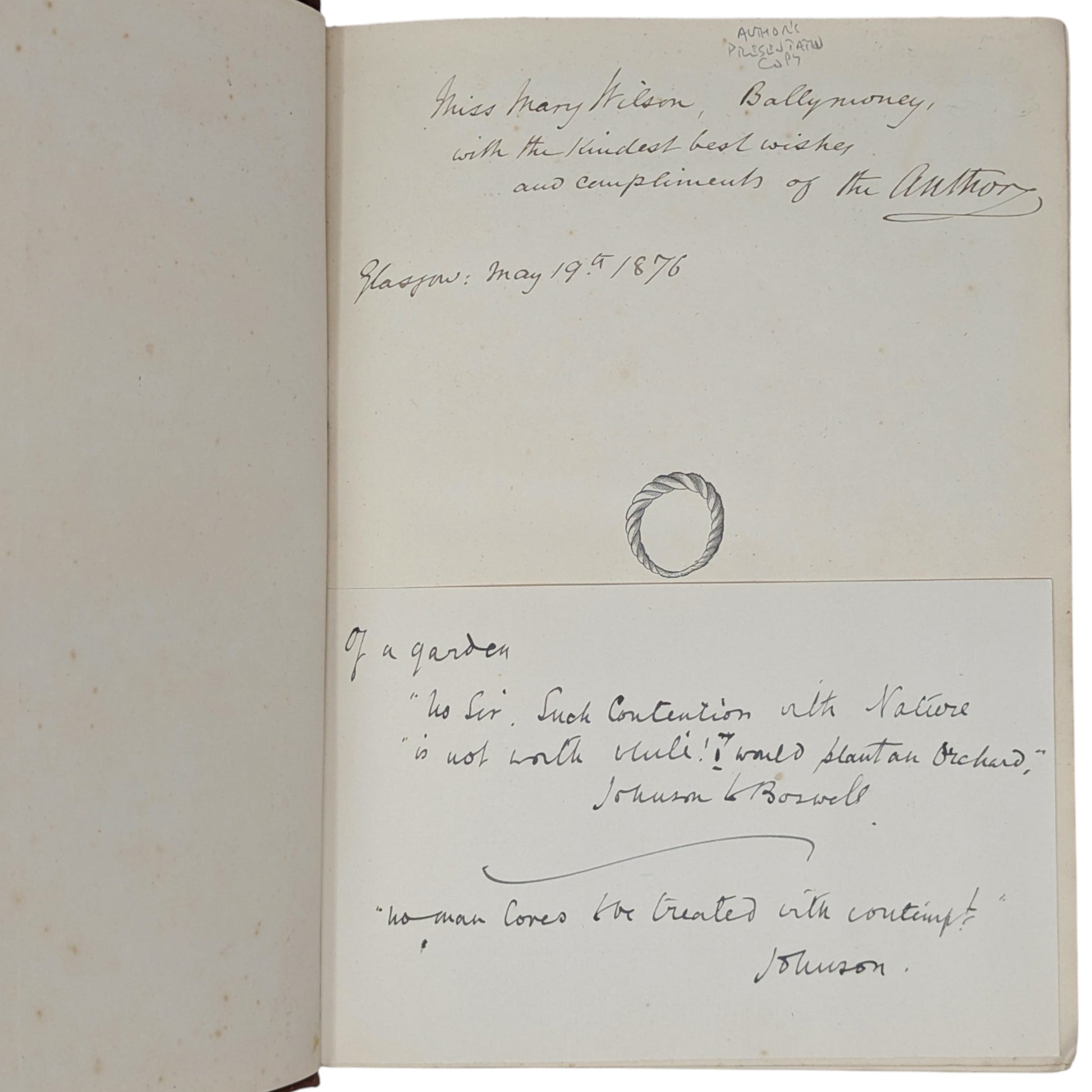 A good copy with binding square and largely firm, with fraying to spine tips and bumping to corners, with some stains and patches of discolouration to the binding, with tanning and a few spots of foxing to the closed text block. Internally, the hinges are shaken and partially broken (but not falling apart), there are a couple of shallow breaks to gutter throughout, and there are some penciled inscriptions in text throughout. The page after FFEP and before the half-title has been inscribed by the author: "Miss Mary Wilson, Ballymoney, with the kindest best wishes and compliments of the author, Glasgow: May 19th 1876".