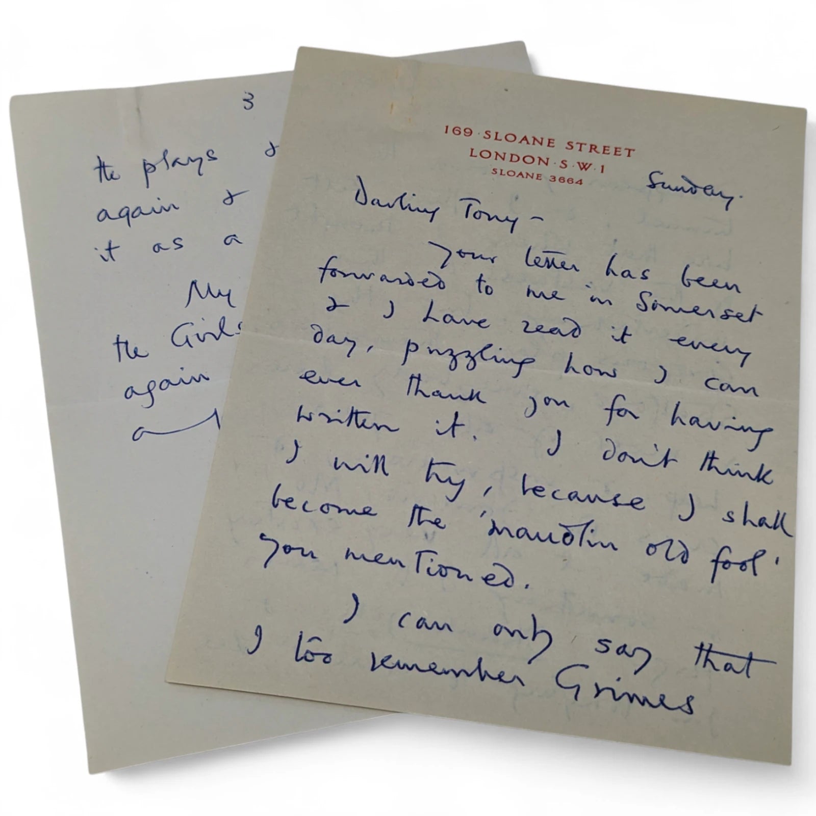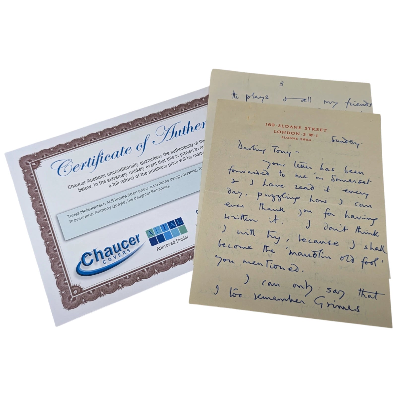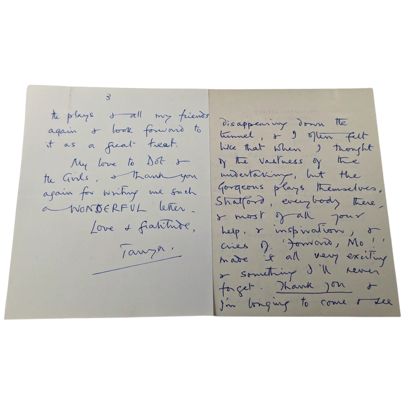Laid in is a warm and personal two-page autograph letter signed “Tanya” (the costume designer whose designs are featured in this edition of 'Othello'), written on headed stationery, to “Darling Tony” (British Actor Sir John Anthony Quayle, well known for his Shakespearian roles that included Falstaff, Othello, Benedick in Much Ado About Nothing, Henry VIII and Aaron in Titus Andronicus with Laurence Olivier). In the letter, Tanya recalls shared experiences (“... the gorgeous plays themselves, Stratford, everybody there, & most of all your help & inspiration... made it all very exciting & something I’ll never forget”) and reflects on the excitement and inspiration she drew from Tony’s encouragement, especially his cry of “Forward, Mo!”. Two pages, blue ink, written recto and verso, on headed stationery of 169 Sloane Street, London. Light fold marks and mildly tanned, otherwise very well preserved.