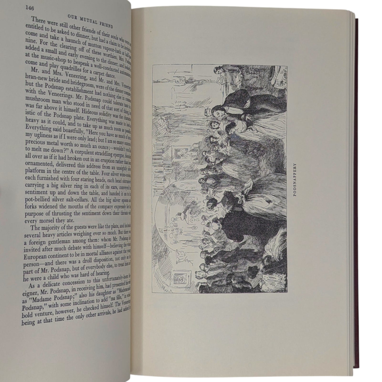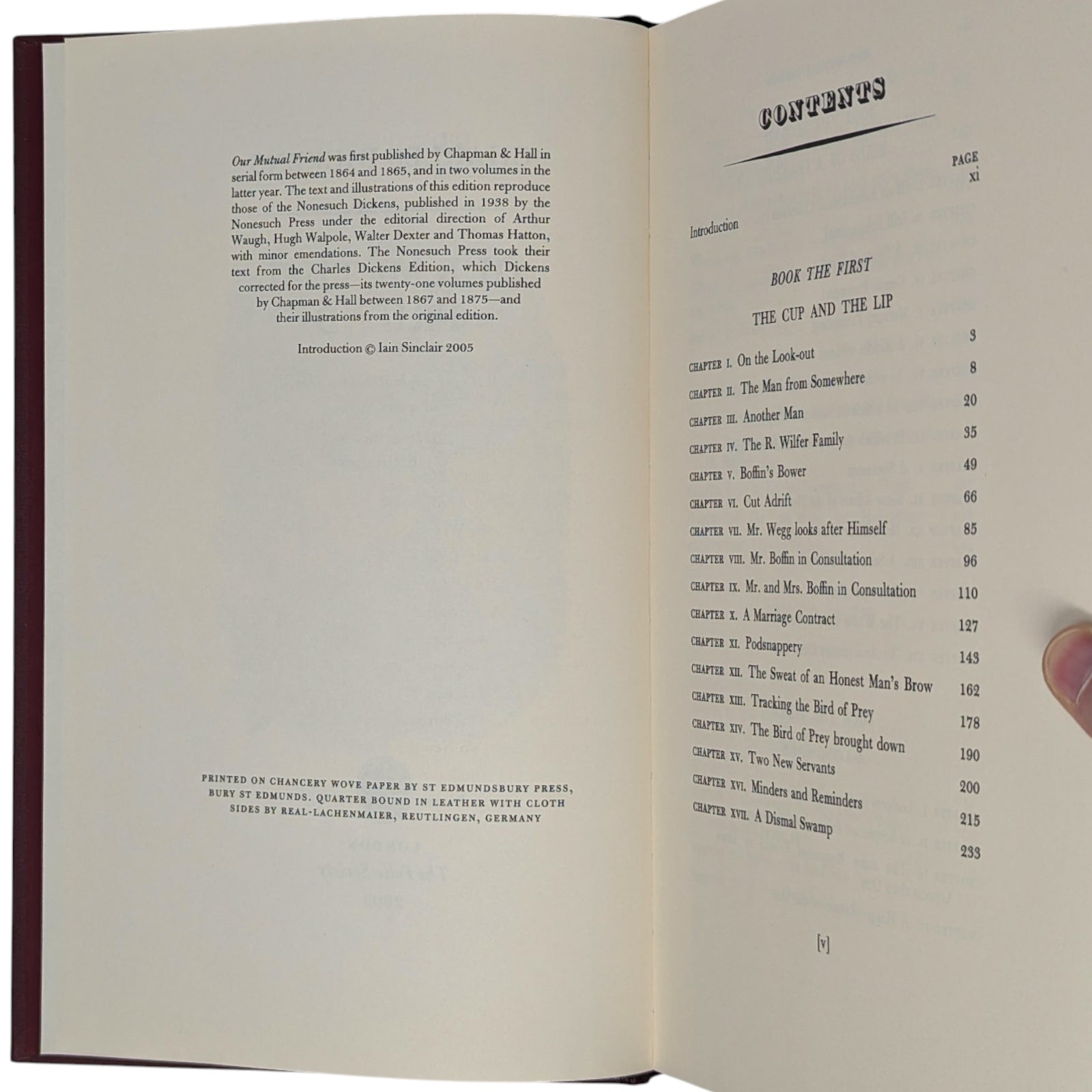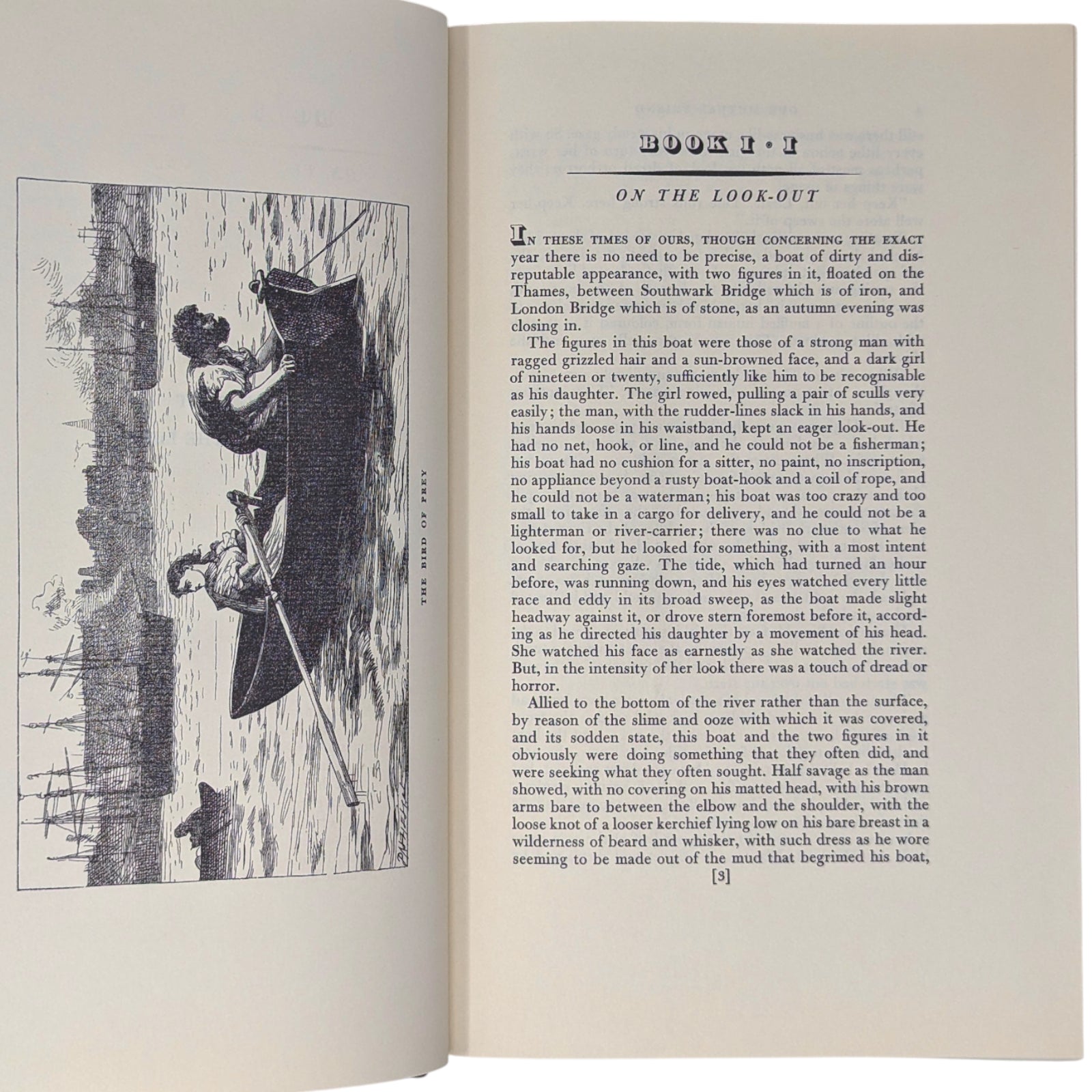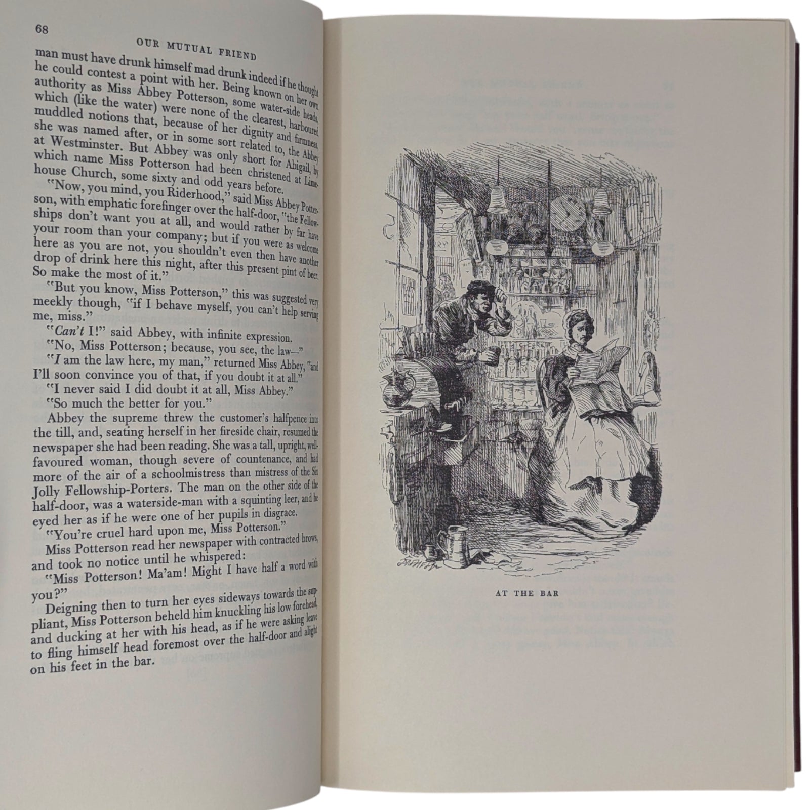DICKENS, Charles. Our Mutual Friend. London: The Folio Society, [2005]. First printing thus. With the original illustrations by Marcus Stone, introduction by Iain Sinclair. 261 × 170 × 58 mm. Pp. [1–2], [i–iv] v–xix [xx–xxii], [1–2] 3–927 [928]. Type: Bulmer with Verdi for display. Typeset by R. and R. Clark for the Nonesuch Press in 1938 (the preliminaries by Folio), printed by the Saint Edmundsbury Press. Bound by Real Lachenmaier in series binding. The 41 plates in this edition (with the exception of the frontispiece) are correctly included in the pagination. This title was the ‘Castaway’s Choice’ of Shirley Hughes and Simon Jenkins.