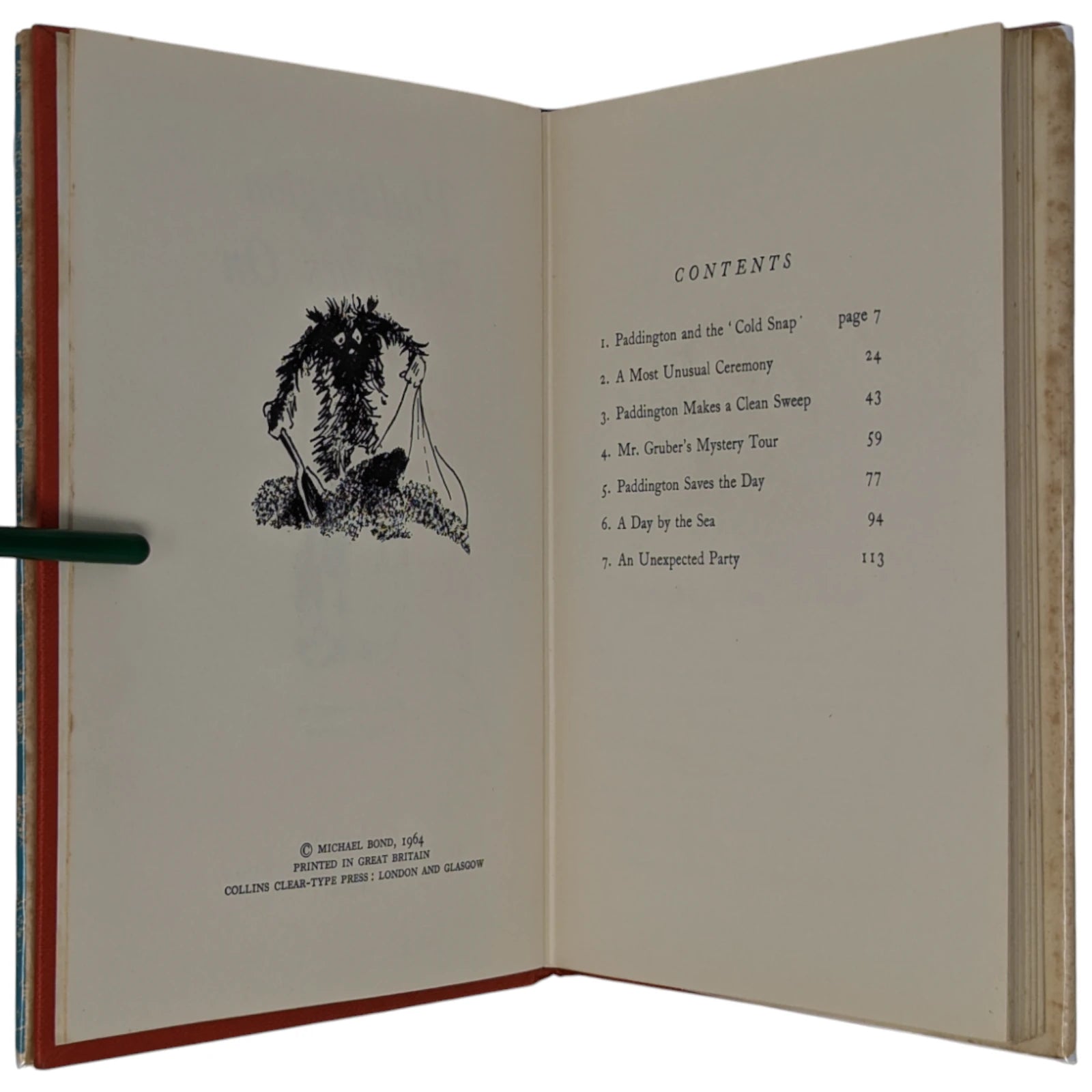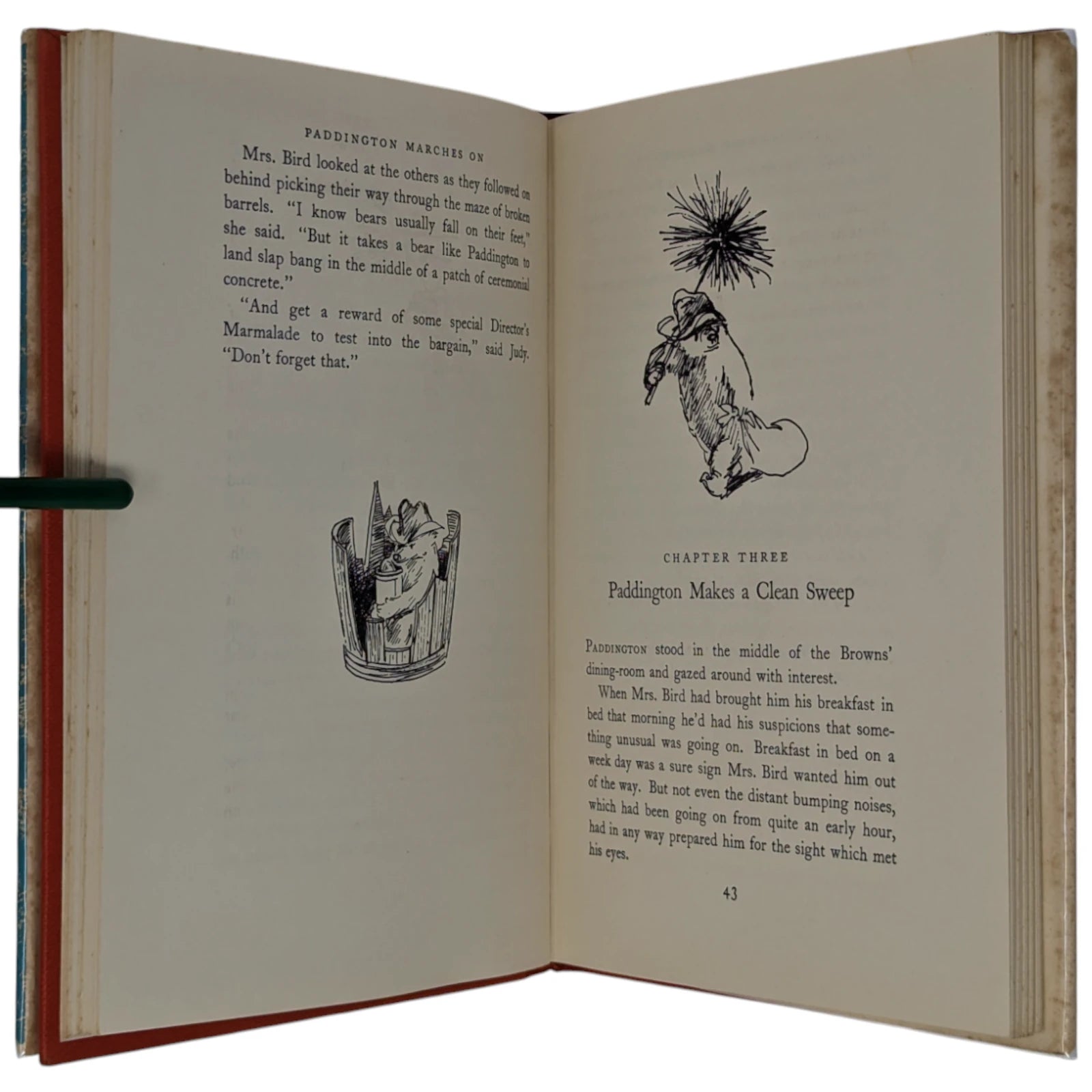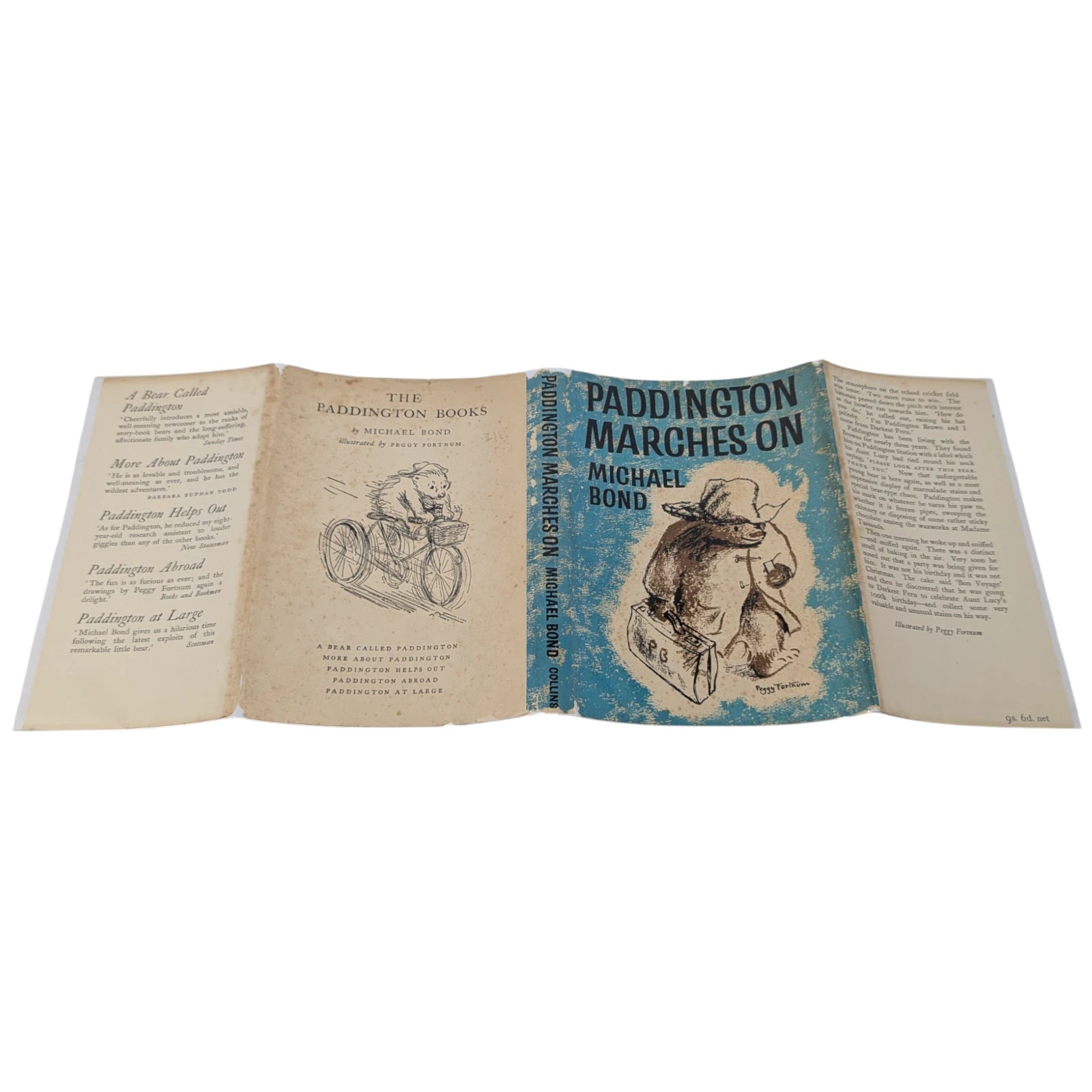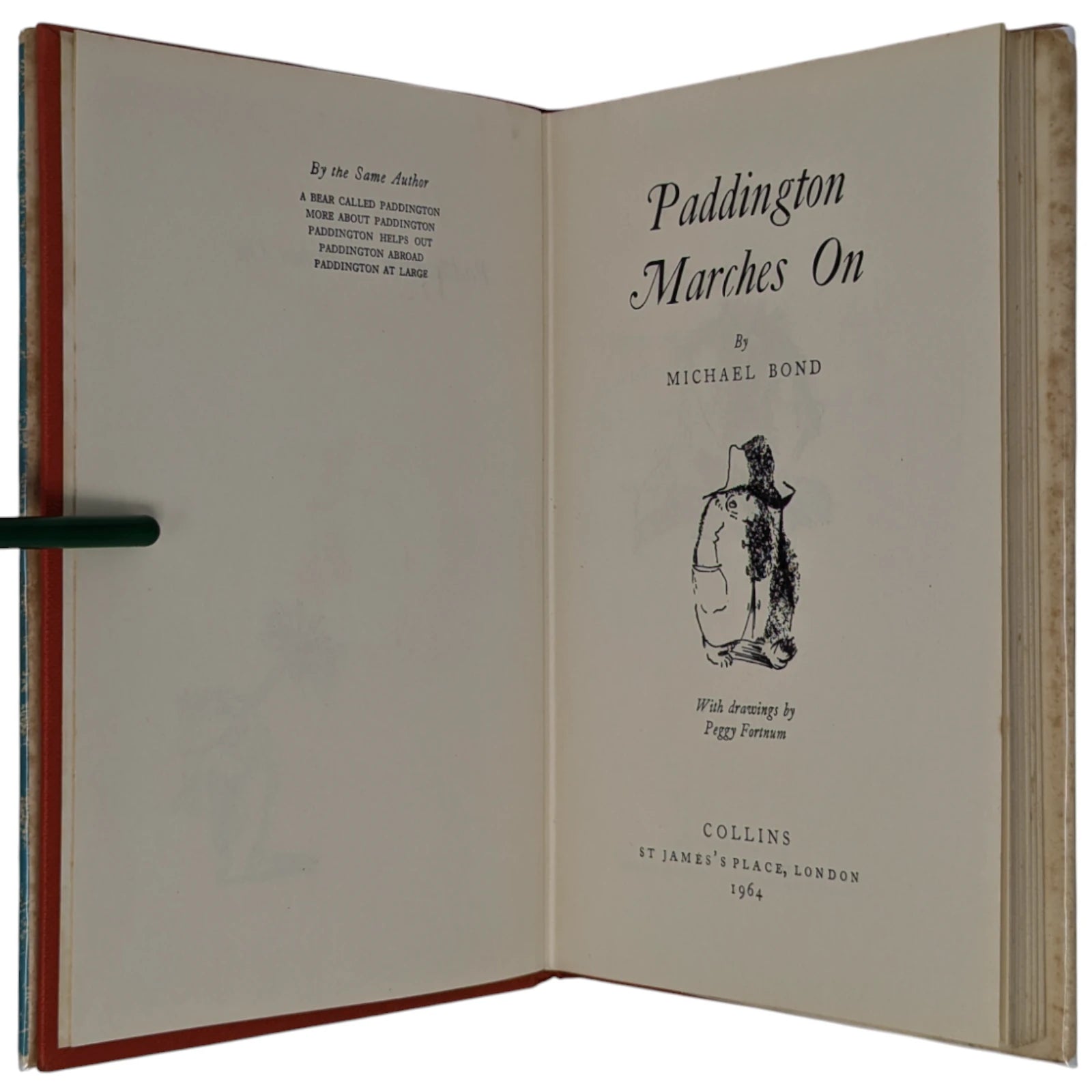 Paddington Marches On, by Michael Bond. London: Collins, 1964. First edition, first impression. Pp. 127. Publisher's binding, silver titles to spine, plain endpapers; in unclipped dust wrapper showing price 9s 6d to front flap.