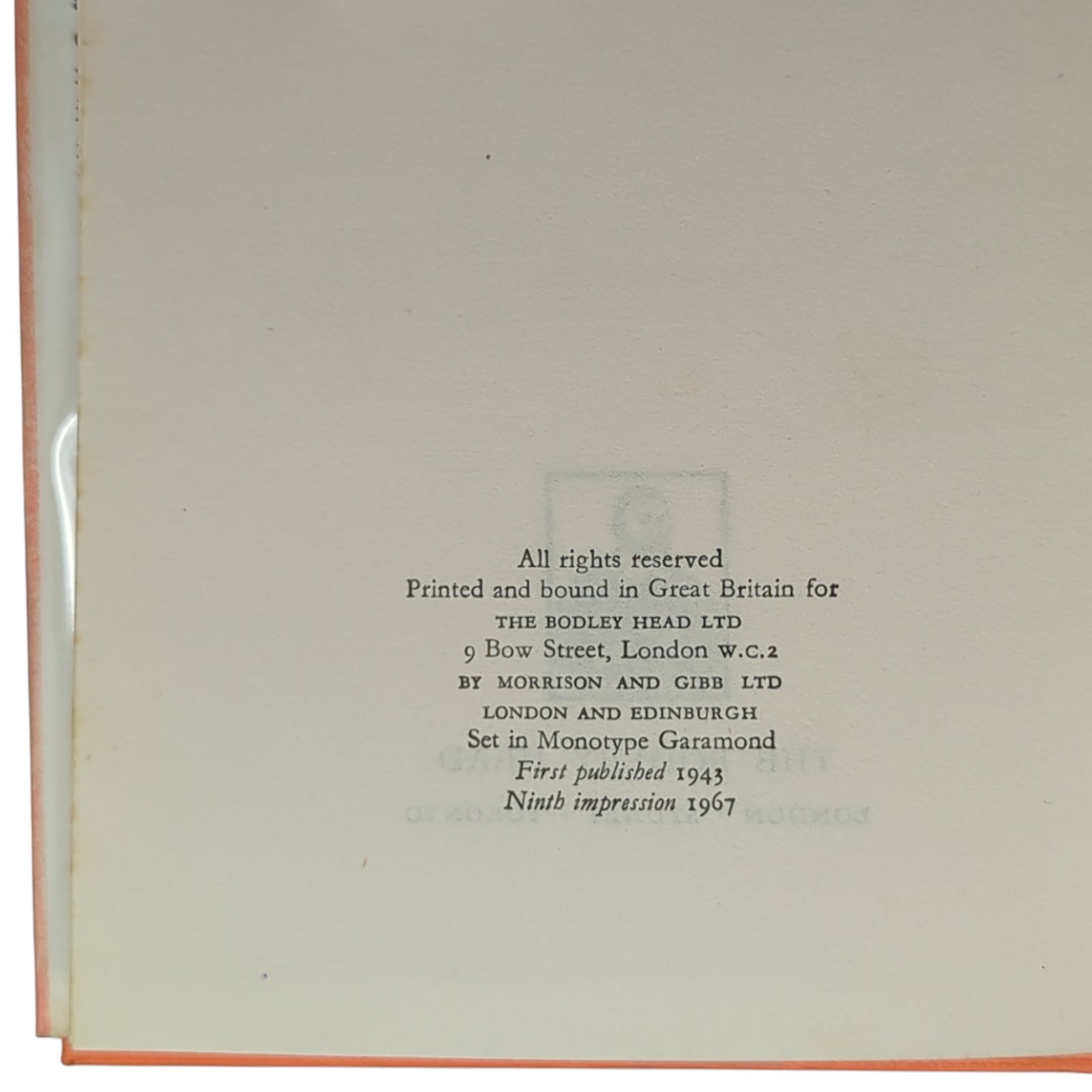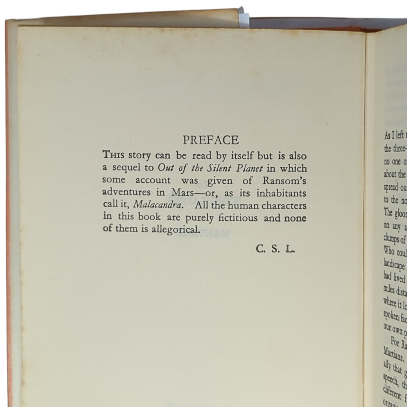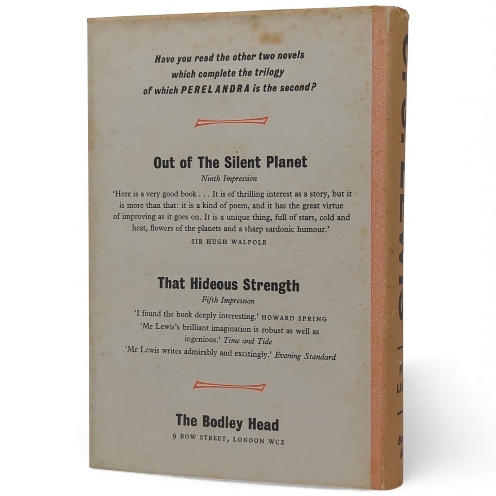 LEWIS, C. S. Perelandra: A Novel. London: The Bodley Head, 1967. Originally published in 1943, this is the ninth impression of the author's second book in the famous Space Trilogy, set on the planet of Perelandra, or Venus. Publisher's salmon-pink binding, black lettering to spine, plain endpapers; with the price-clipped typographical dustwrapper.
