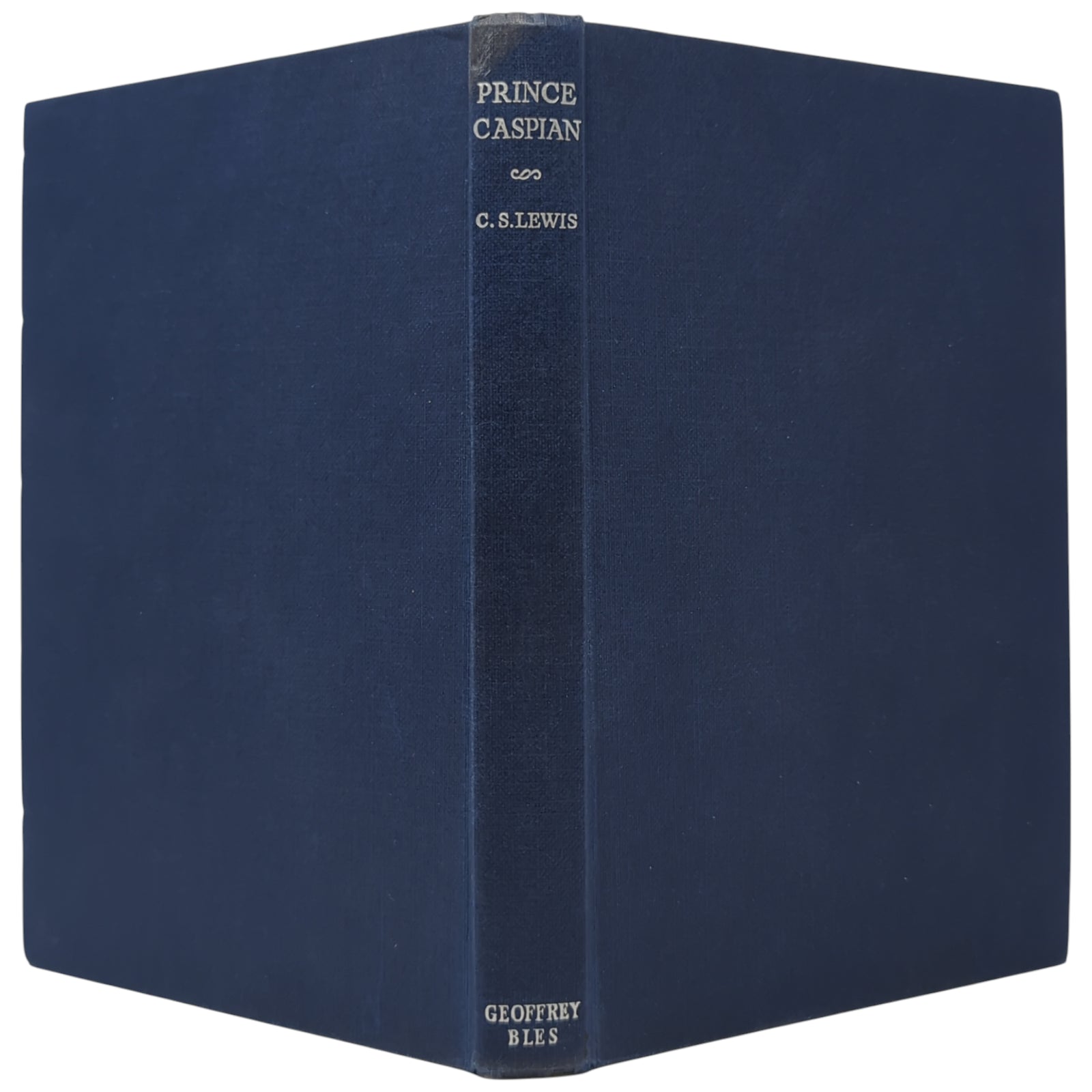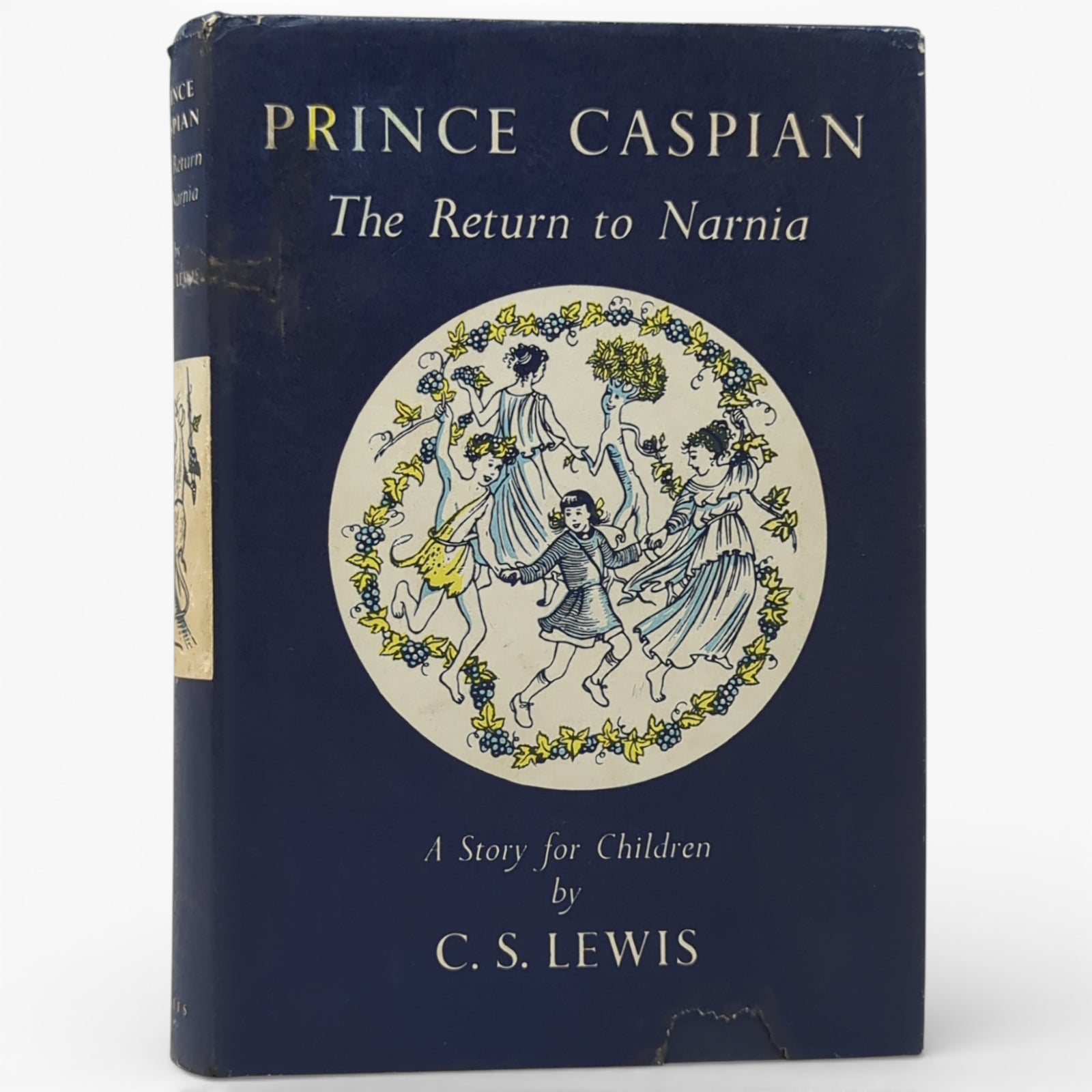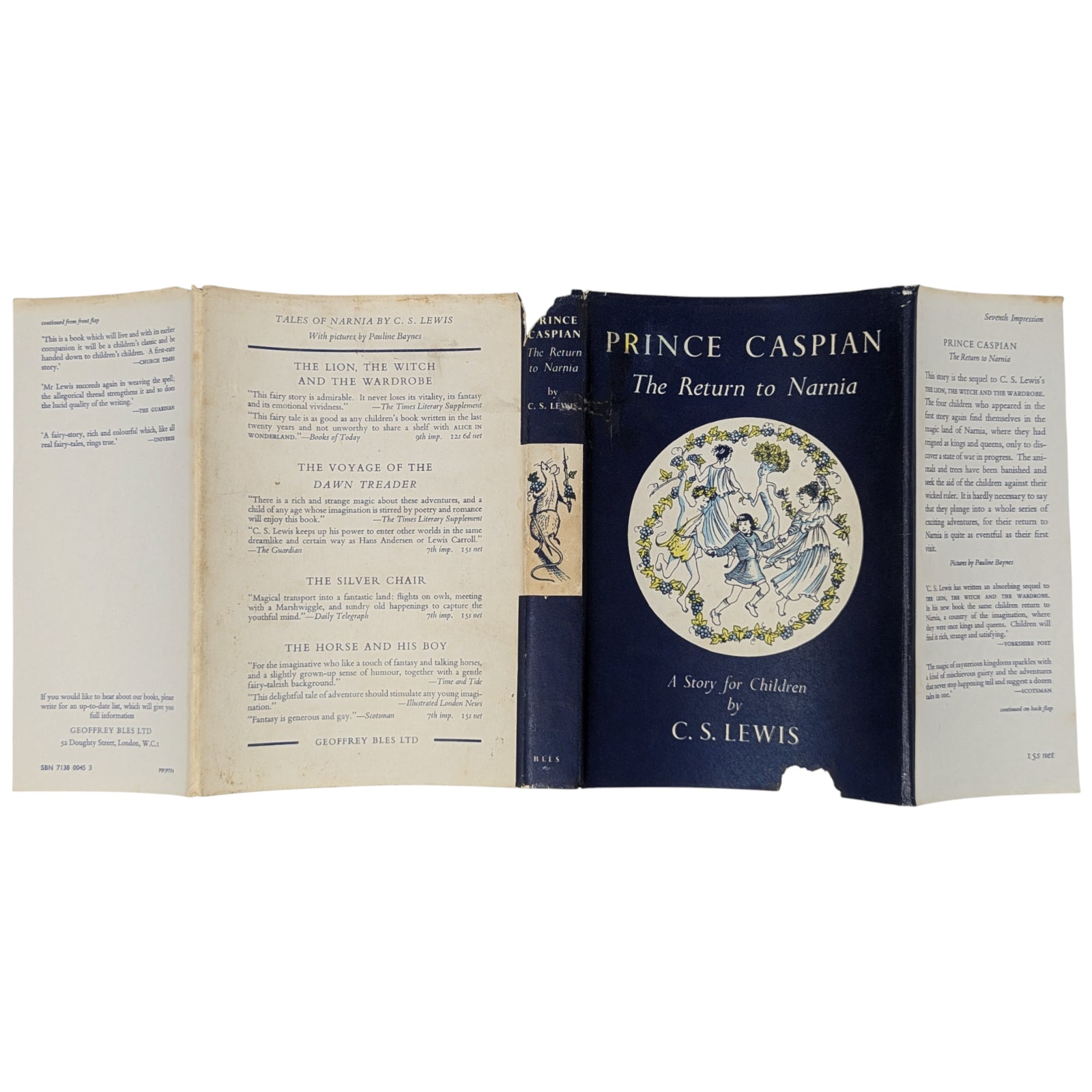 Prince Caspian: The Return to Narnia, by C. S. Lewis. London: Geoffrey Bles, 1951. First edition, seventh printing 1969. Chronologically, the second book in the Chronicles of Narnia series. Publisher's navy blue boards, silver lettering to spine, map endpapers at front; in the unclipped dust jacket priced 15s net to front flap.