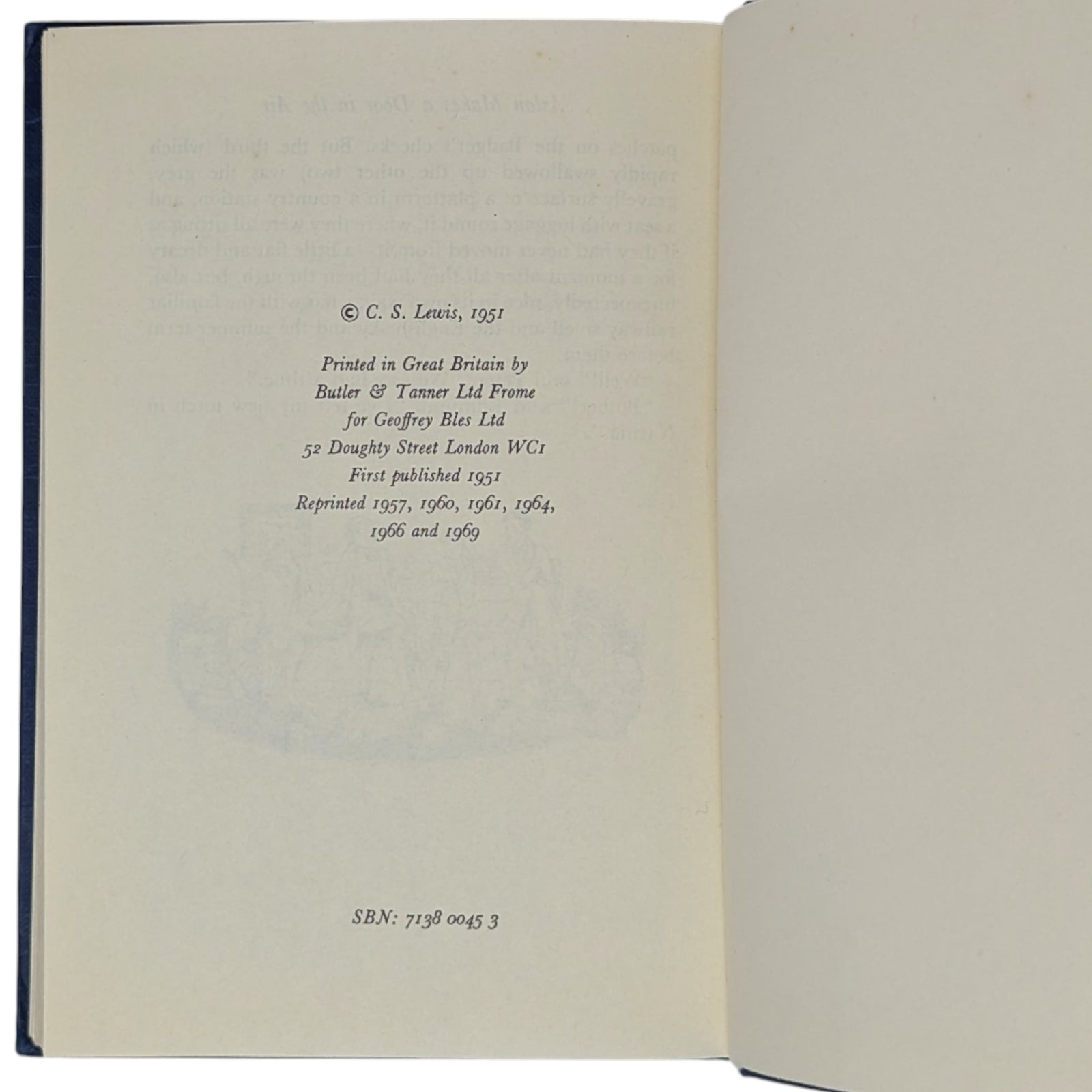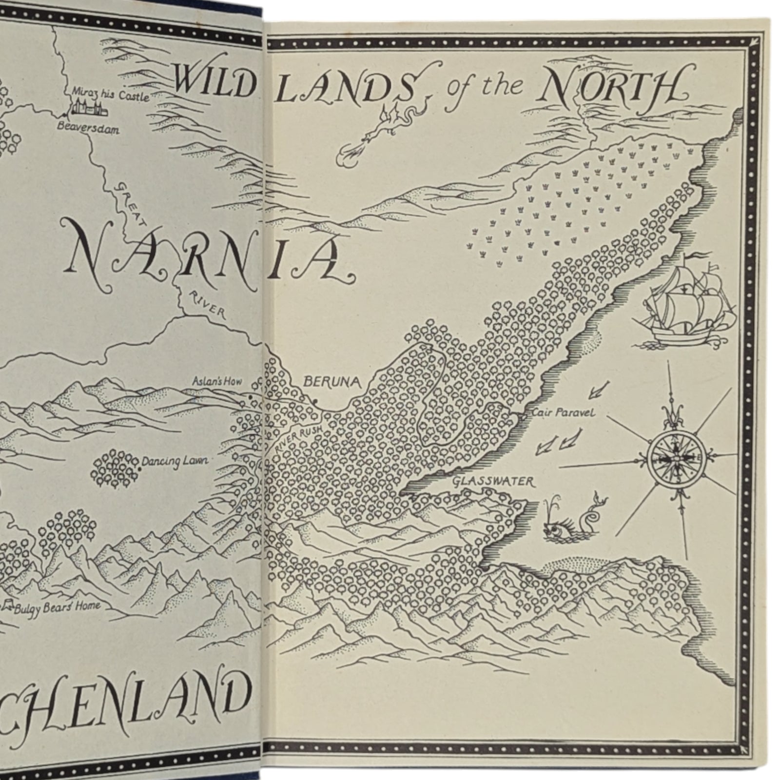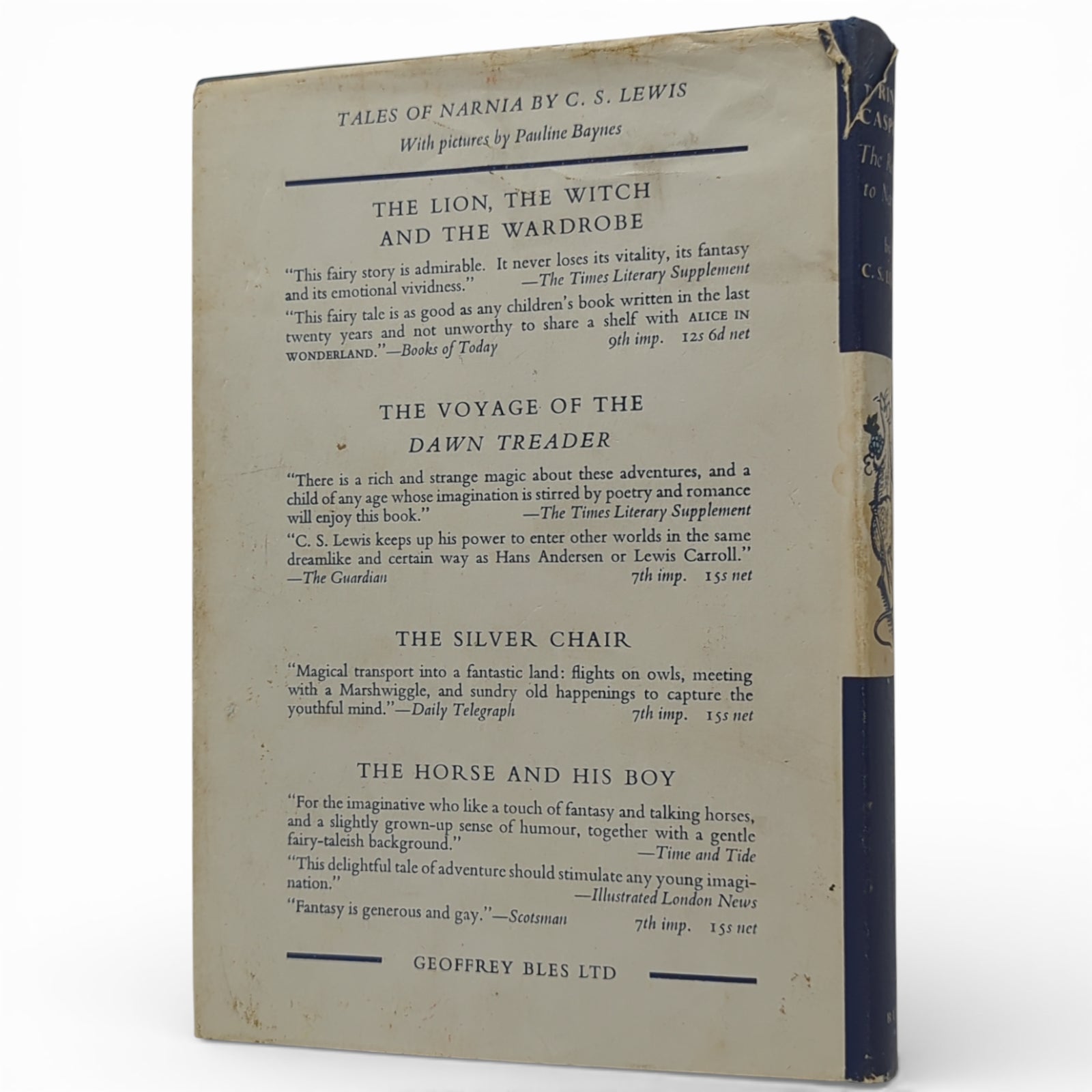 Prince Caspian: The Return to Narnia, by C. S. Lewis. London: Geoffrey Bles, 1951. First edition, seventh printing 1969. Chronologically, the second book in the Chronicles of Narnia series. Publisher's navy blue boards, silver lettering to spine, map endpapers at front; in the unclipped dust jacket priced 15s net to front flap.