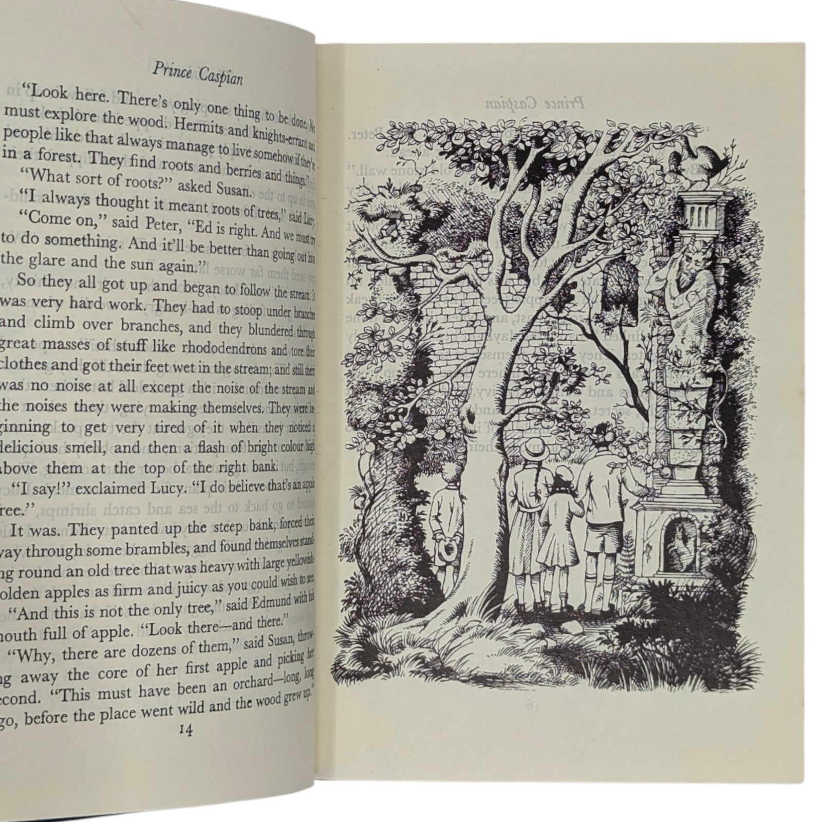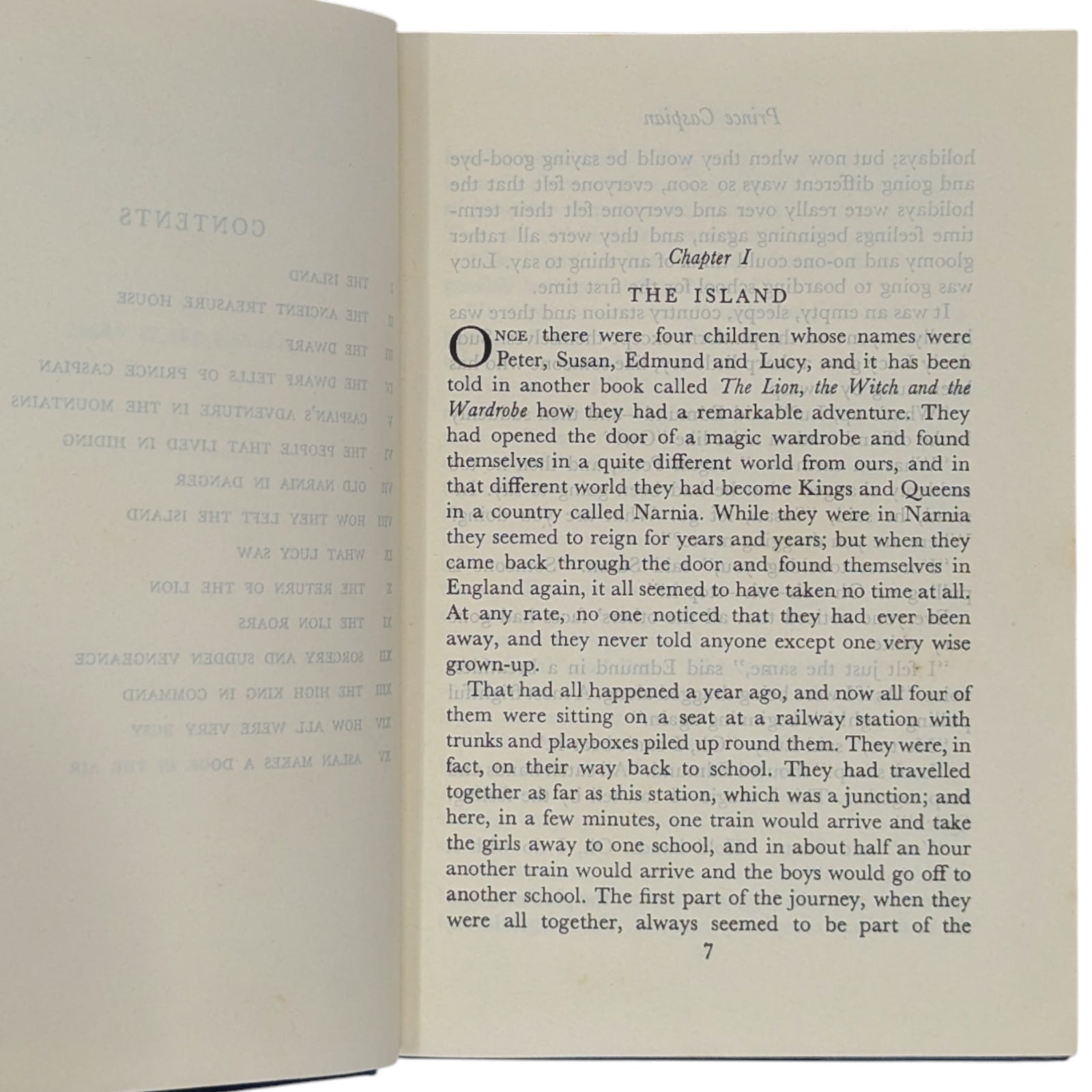 A first edition, seventh printing copy of the story of The Pevensie siblings who return to Narnia to help Prince Caspian reclaim his rightful throne and restore peace to a land under tyranny.