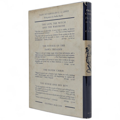 Prince Caspian: The Return to Narnia, by C. S. Lewis. London: Geoffrey Bles, 1951. First edition, seventh printing 1969. Chronologically, the second book in the Chronicles of Narnia series. Publisher's navy blue cloth binding, silver lettering to spine, map front endpapers; in original, price-clipped dust wrapper.