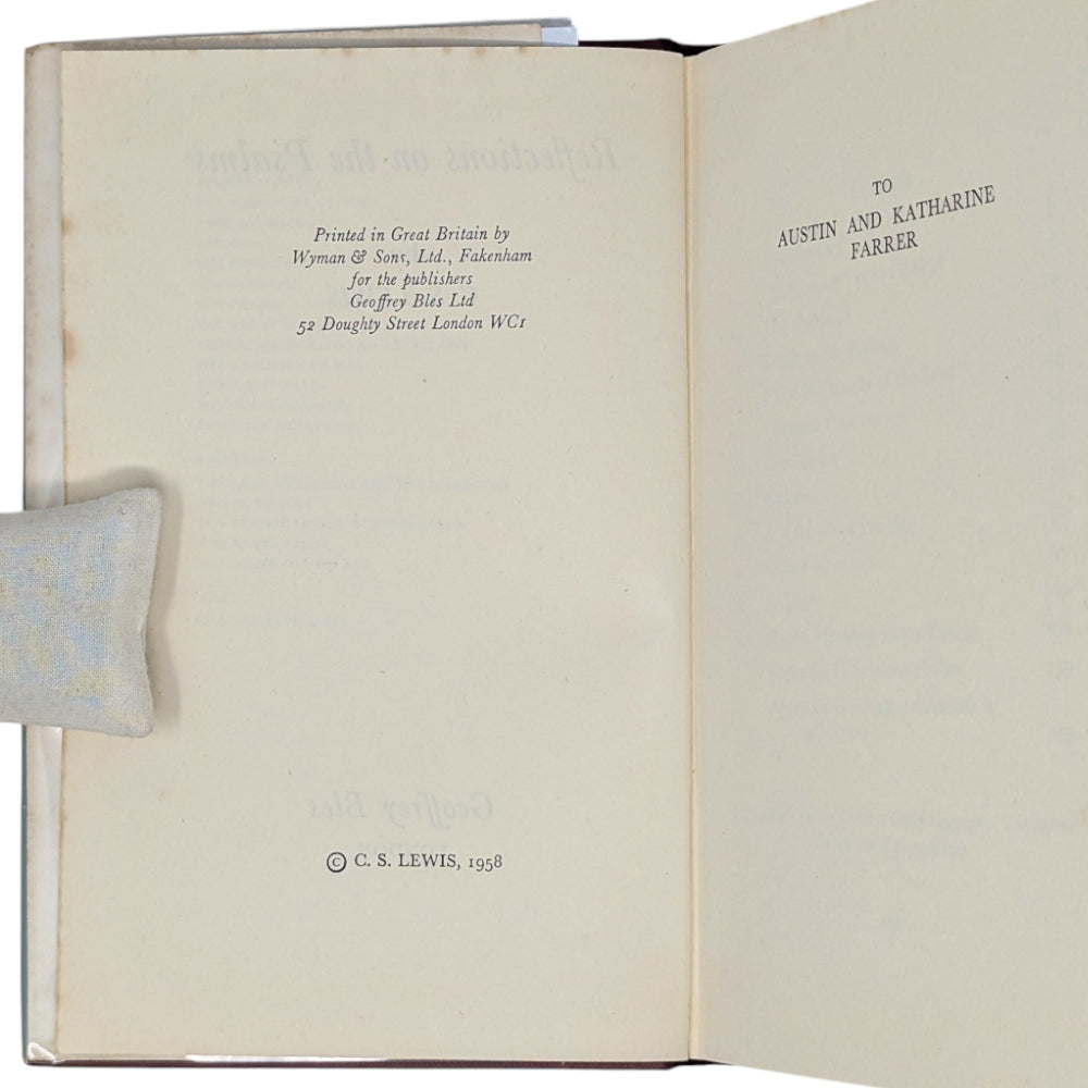 LEWIS, C. S. Reflections on the Psalms. London: Geoffrey Bles, 1958. First edition, first printing, in unclipped (12s. 6d. net) dust wrapper. Publisher's burgundy cloth, gilt titles to spine, plain endpapers; in original dust jacket.