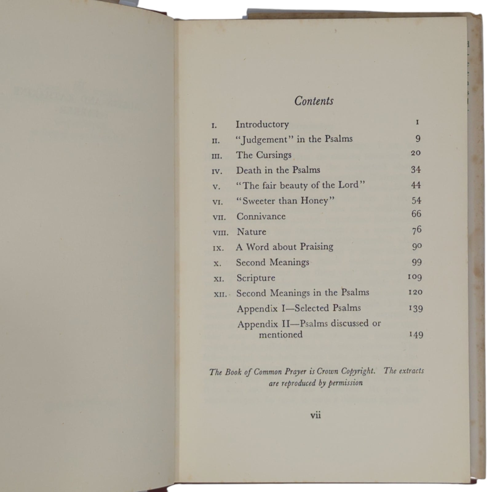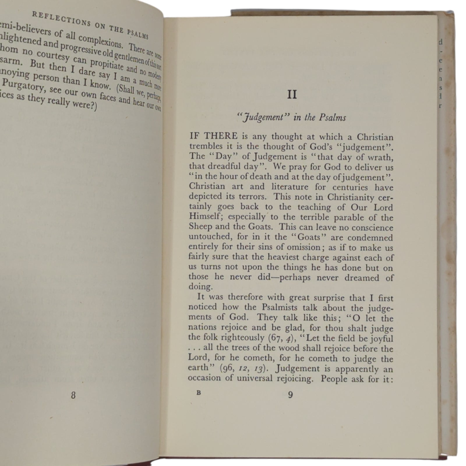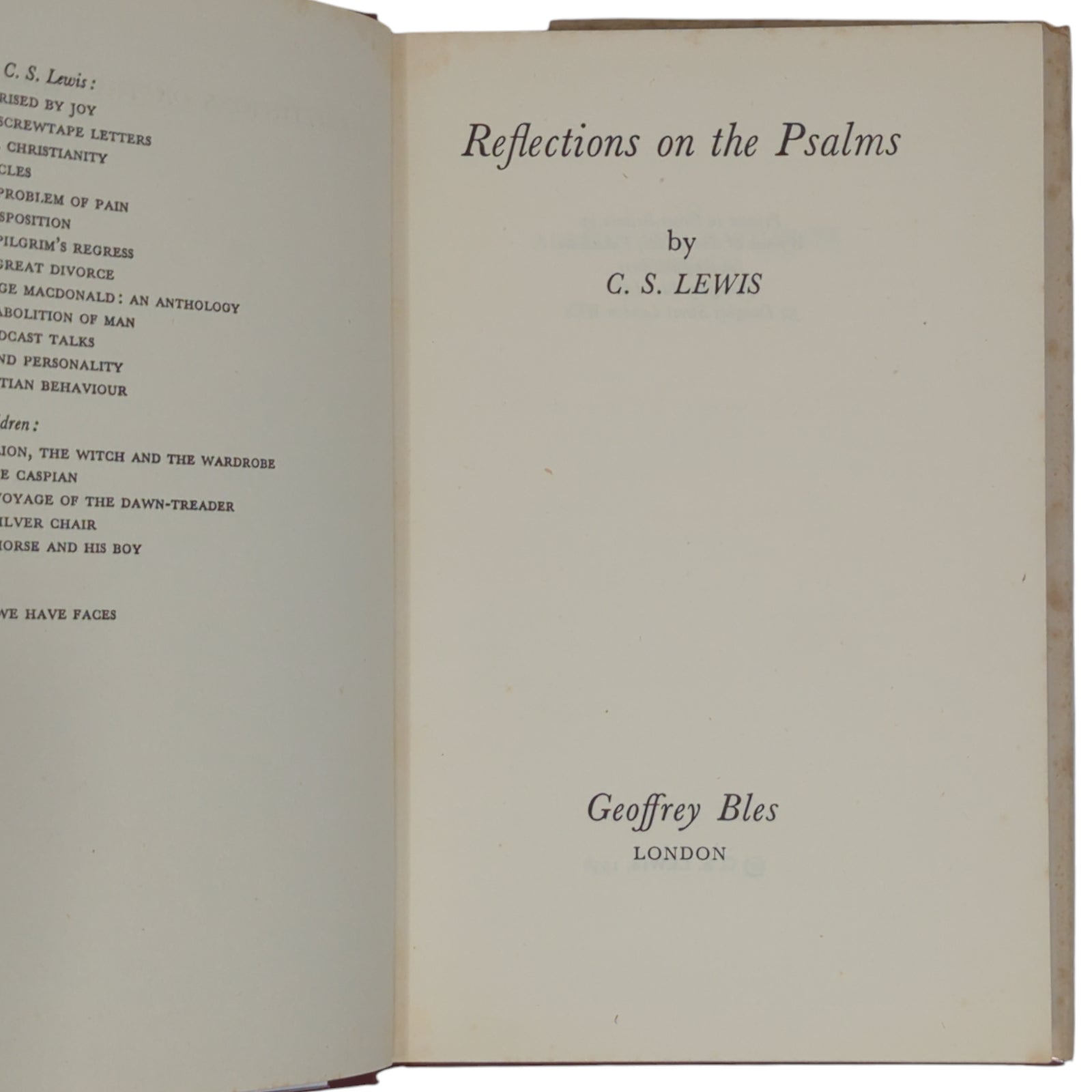 LEWIS, C. S. Reflections on the Psalms. London: Geoffrey Bles, 1958. First edition, first printing, in price-clipped dust wrapper. Publisher's burgundy cloth, gilt titles to spine, plain endpapers; in original dust jacket.