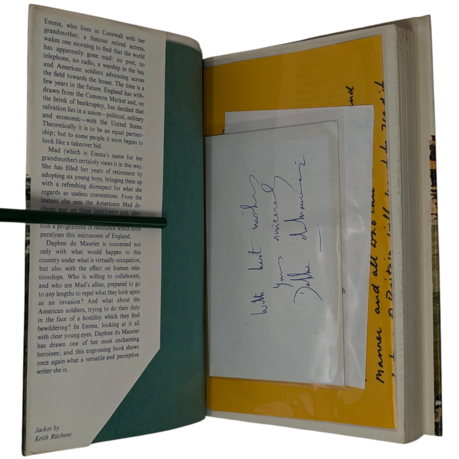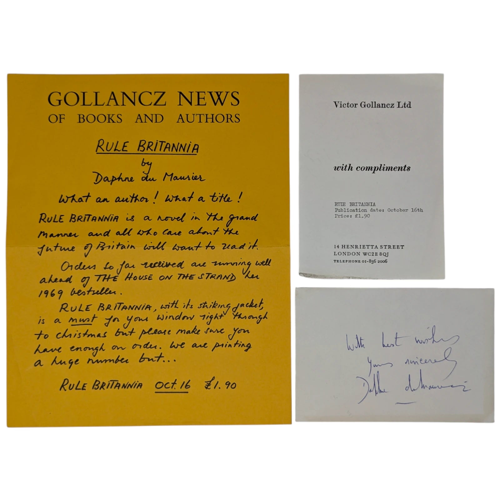 [together with] Loosely inserted envelope inscribed and signed by the author Daphne du Maurier "With best wishes / Yours sincerely / Daphne du Maurier" in blue pen. This envelope came to us separately as part of a large collection of letters, photographs and cards signed by prominent authors and playwriters, amassed in the 1970s and 1980s by collector Neil Walden.