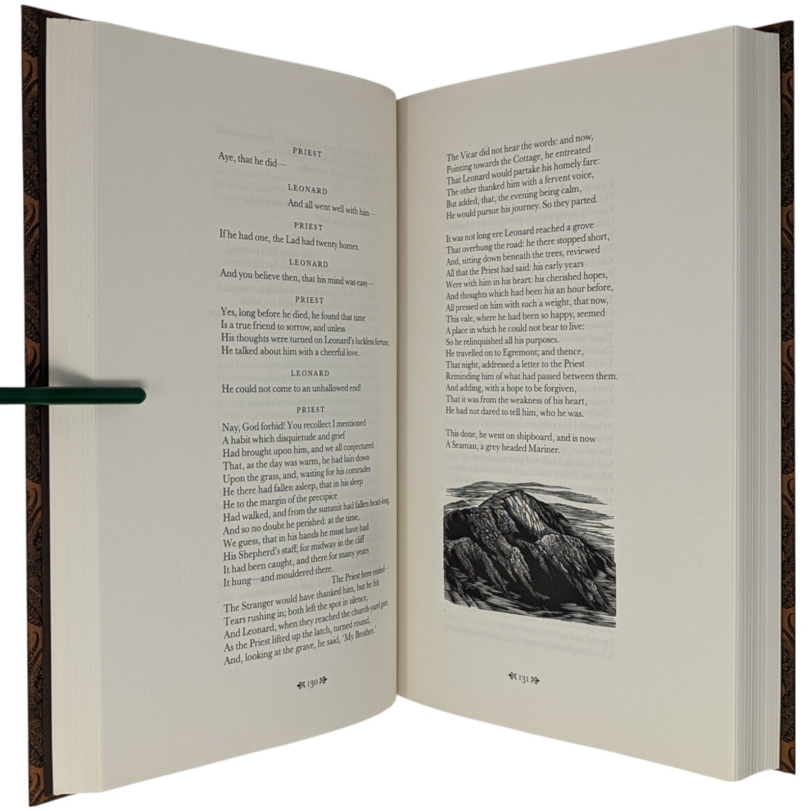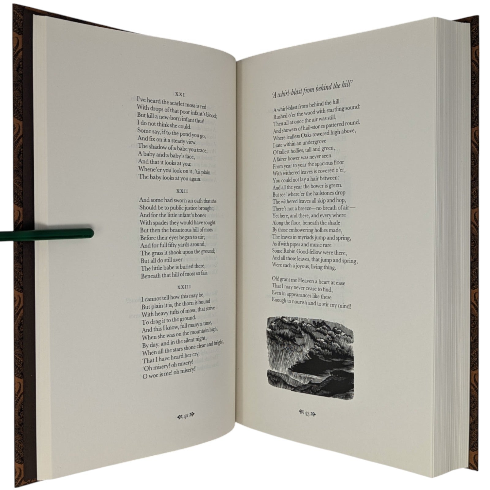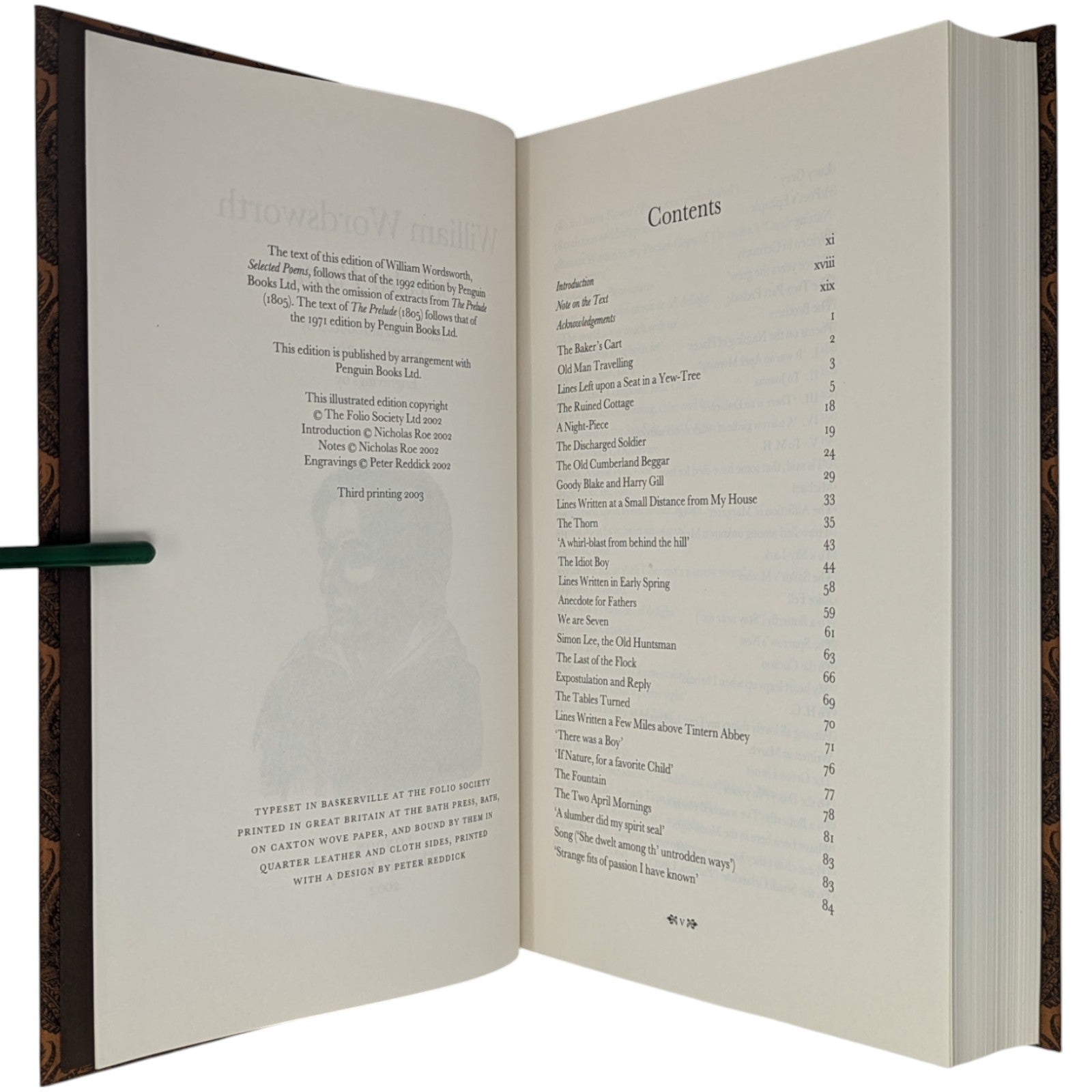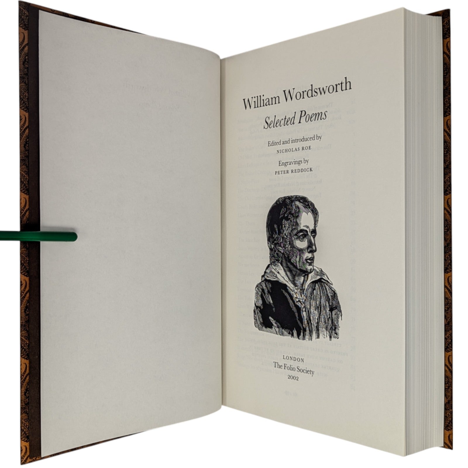William Wordsworth, Selected Poems. London: The Folio Society, 2002. Third printing thus, 2003. Edited and introduced by Nicholas Roe, [wood-] engravings by Peter Reddick. 280 × 188 × 45 mm. Pp. [i–iv] v–xix [xx], 1–495 [496–500]. Type: Baskerville. Printed and bound by the Bath Press. Quarter dark green series binding (see item 1051); dark brown endleaves. Dark brown slip case. In ‘The Folio Poets’ series. There is a total of 85 wood-engravings, often printed as head- and tail-pieces to the poems. At least four of the blocks are repeated and the title-page portrait of Wordsworth is a reprint of the frontispiece from Folio’s 1970 edition of his Poems.