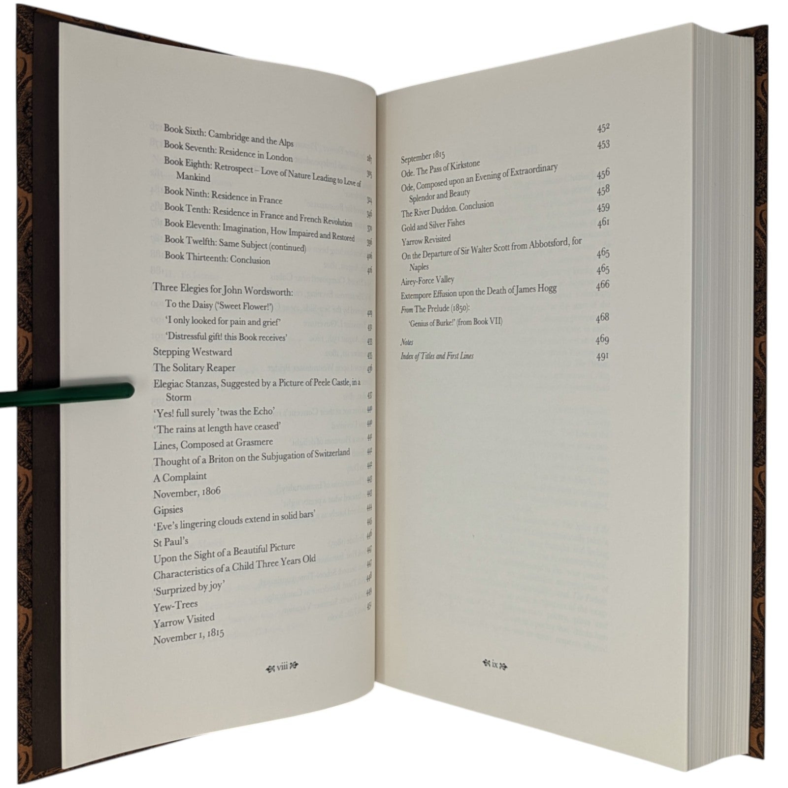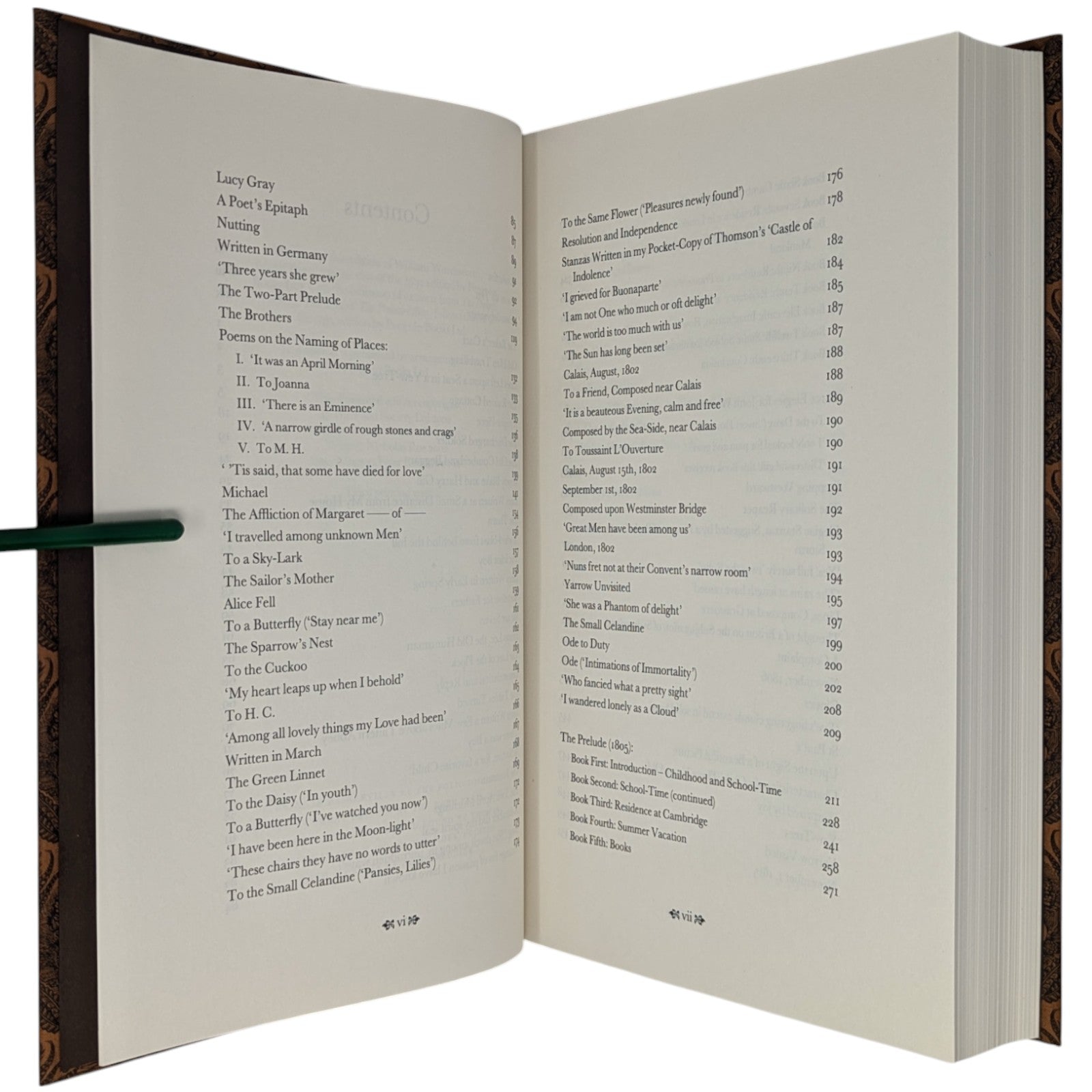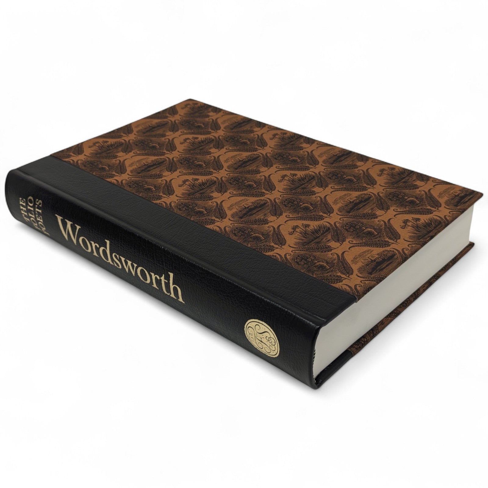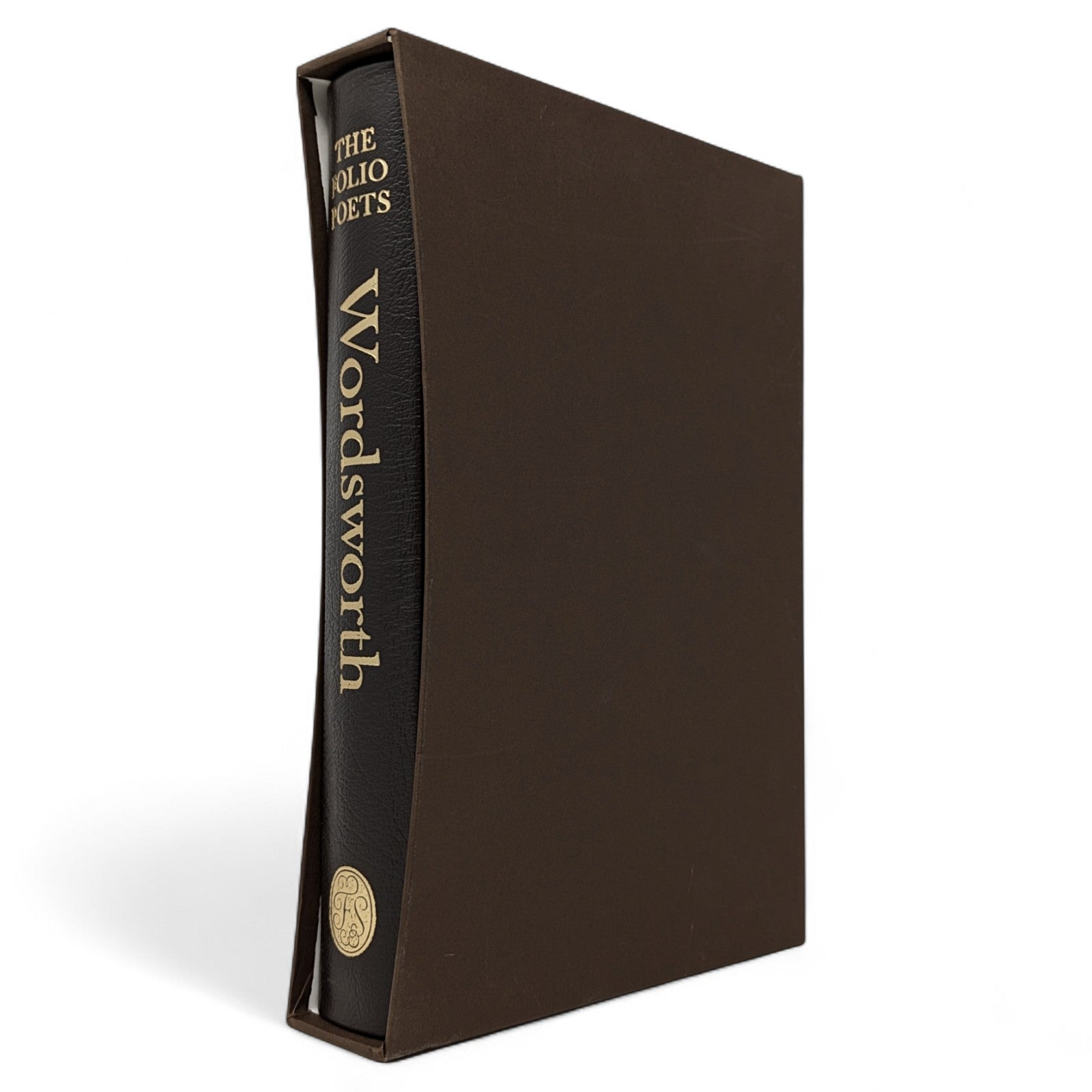 William Wordsworth, Selected Poems. London: The Folio Society, 2002. Third printing thus, 2003. Edited and introduced by Nicholas Roe, [wood-] engravings by Peter Reddick. 280 × 188 × 45 mm. Pp. [i–iv] v–xix [xx], 1–495 [496–500]. Type: Baskerville. Printed and bound by the Bath Press. Quarter dark green series binding (see item 1051); dark brown endleaves. Dark brown slip case. In ‘The Folio Poets’ series. There is a total of 85 wood-engravings, often printed as head- and tail-pieces to the poems. At least four of the blocks are repeated and the title-page portrait of Wordsworth is a reprint of the frontispiece from Folio’s 1970 edition of his Poems.