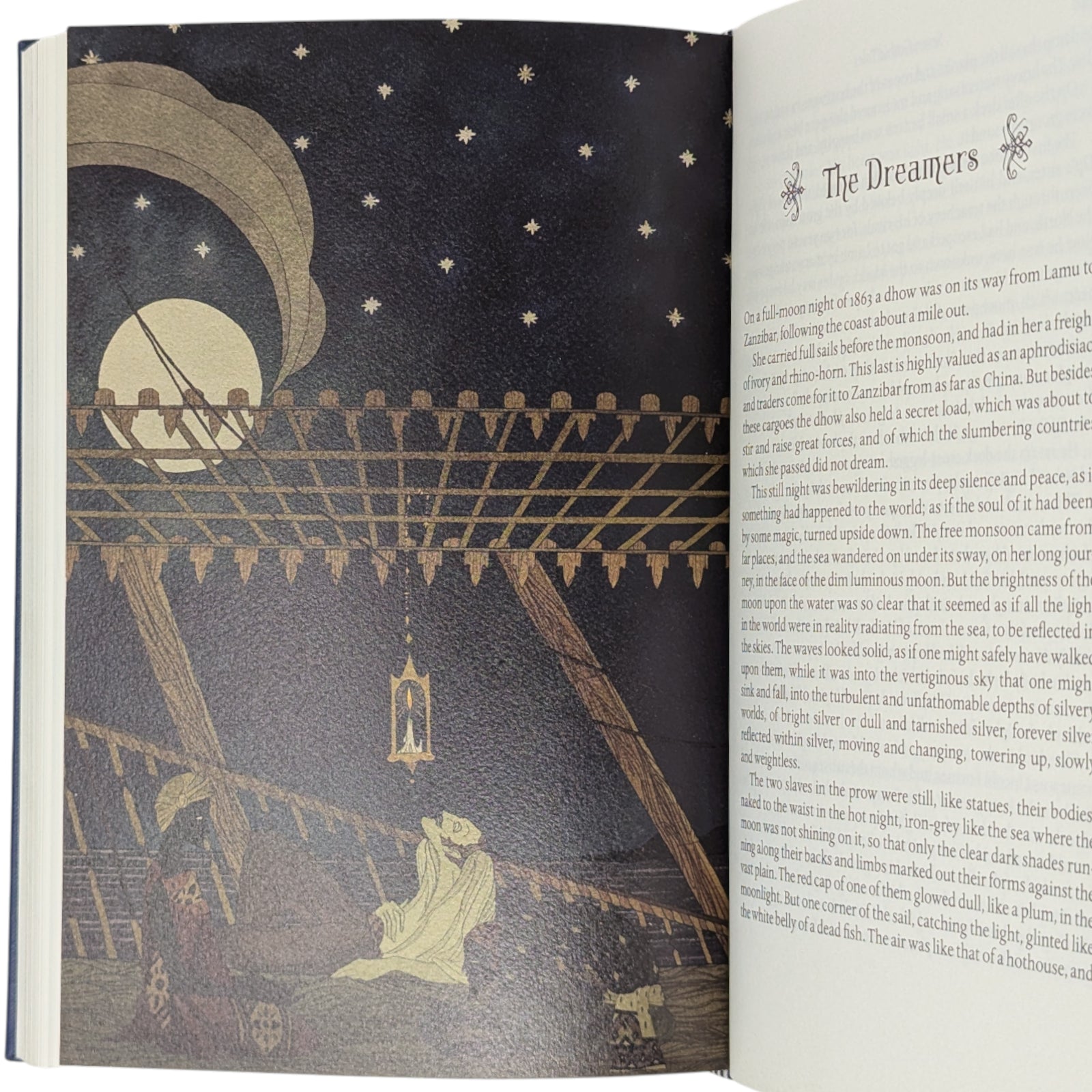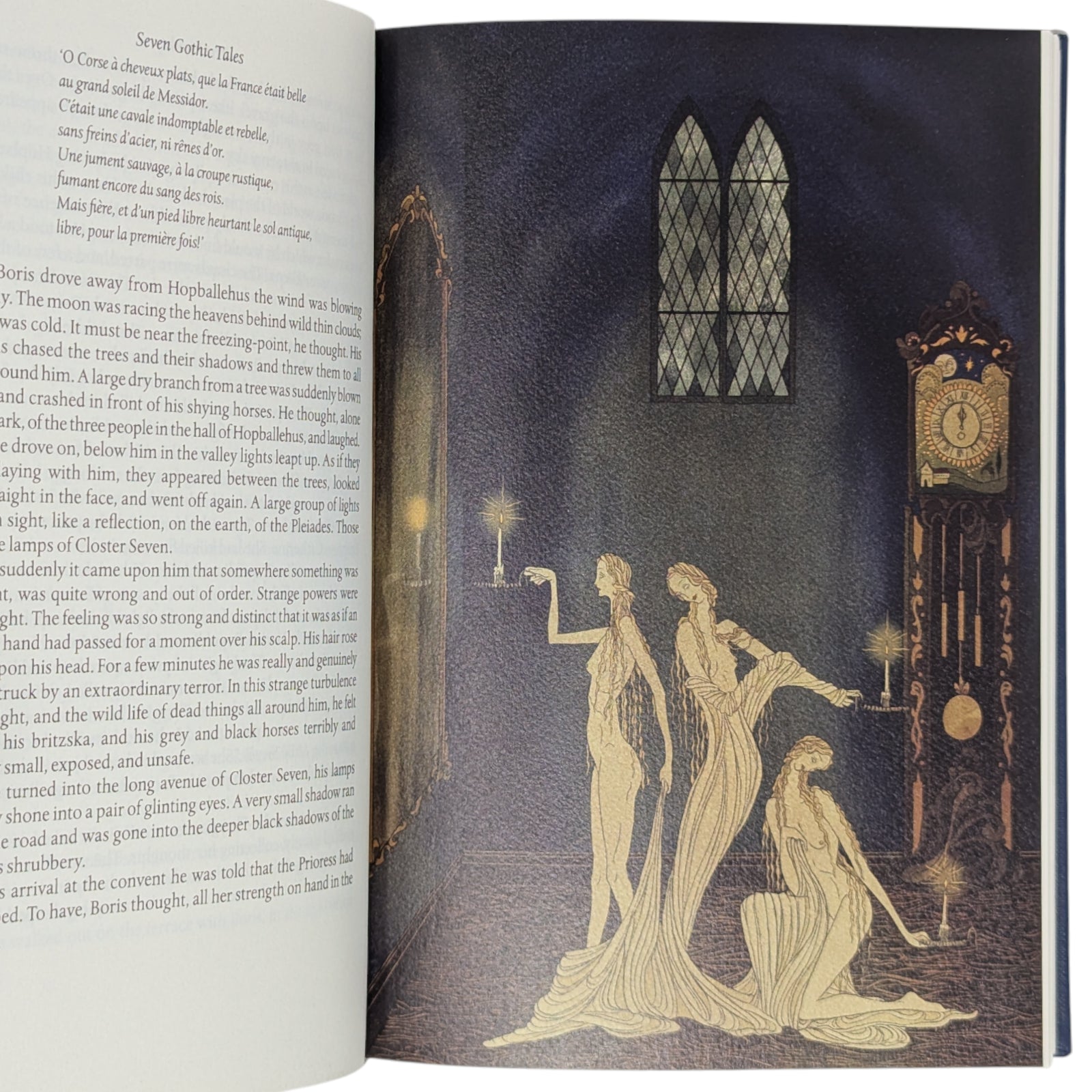 Isaak Dinesen, Seven Gothic Tales. London: The Folio Society, 2013. First Printing Thus. Introduced by Margaret Atwood, illustrations by Kate Baylay. 240 × 164 × 35 mm. Pp. [1–2], [i–xi] xii–xvi, [1–3] 4–370 [371–374]: [10] leaves of colour plates (facing pp. [iii], 47, 62, 94, 111, 159, 222, [239], 286 and 334). Type: Albertina with Gambit Nouveau for display. Printed by Memminger MedienCentrum. Bound by Real Lachenmaier in full dark blue buckram blocked in gold and silver with design by Baylay; dark blue endleaves printed with design in silver. Dark blue slip case with decoration in silver.