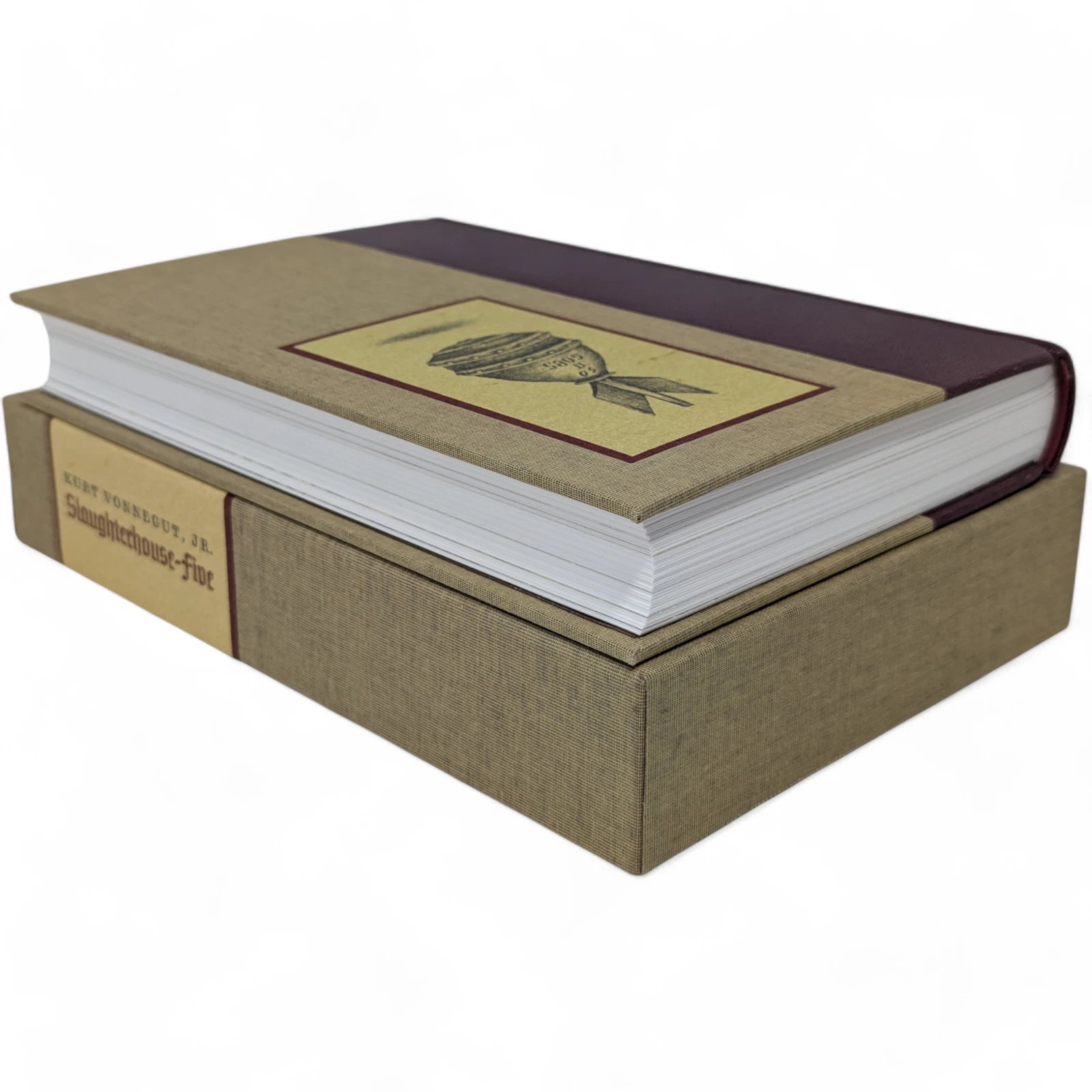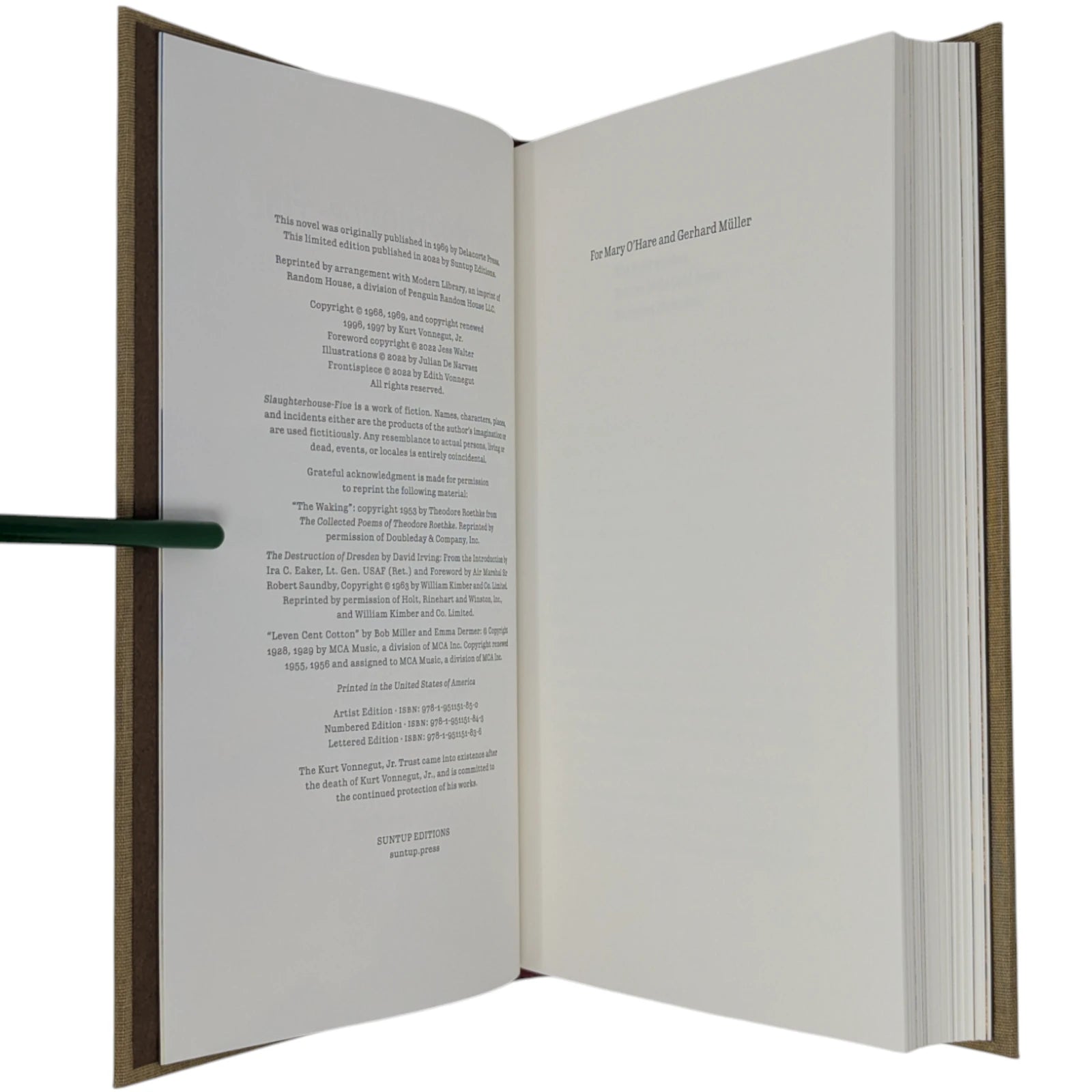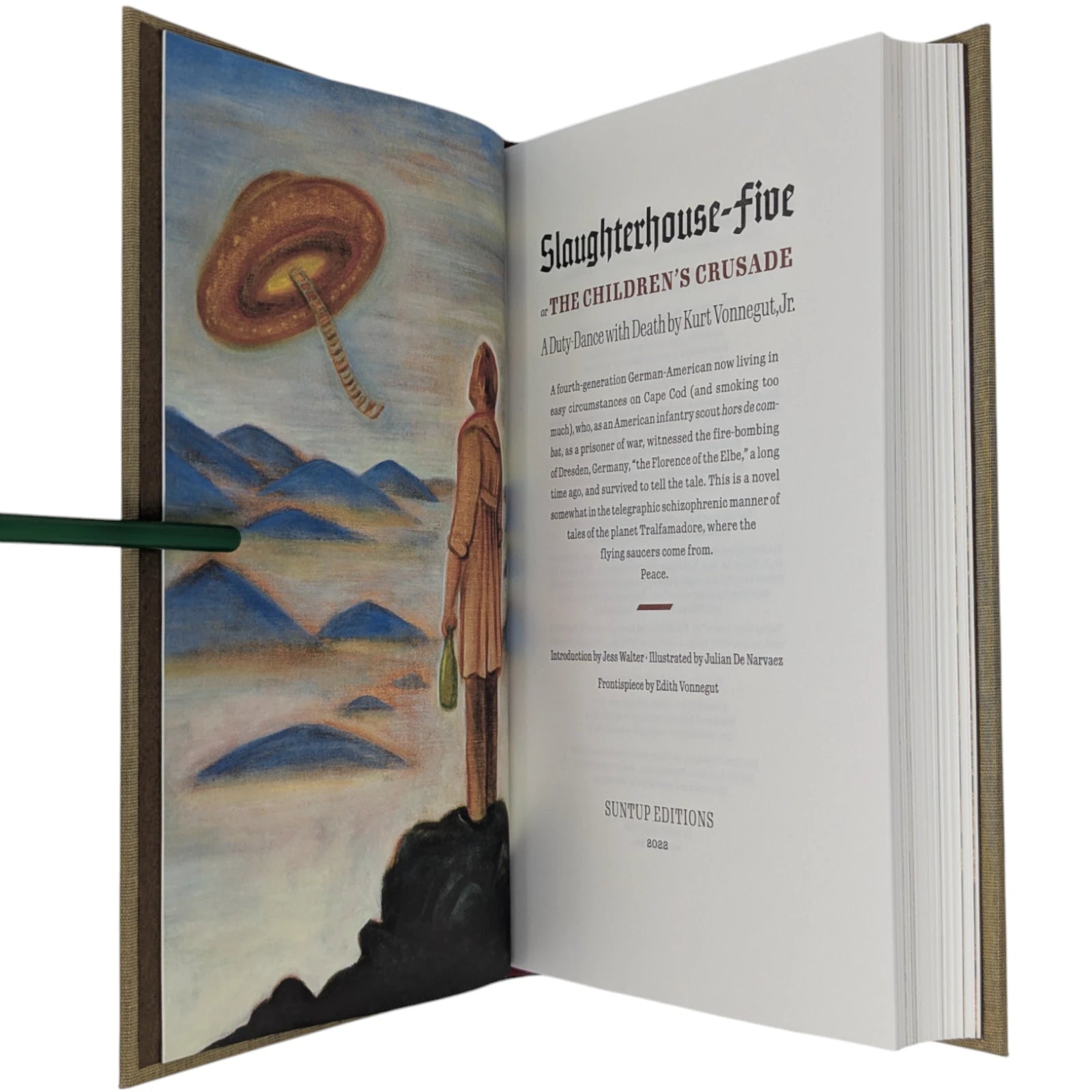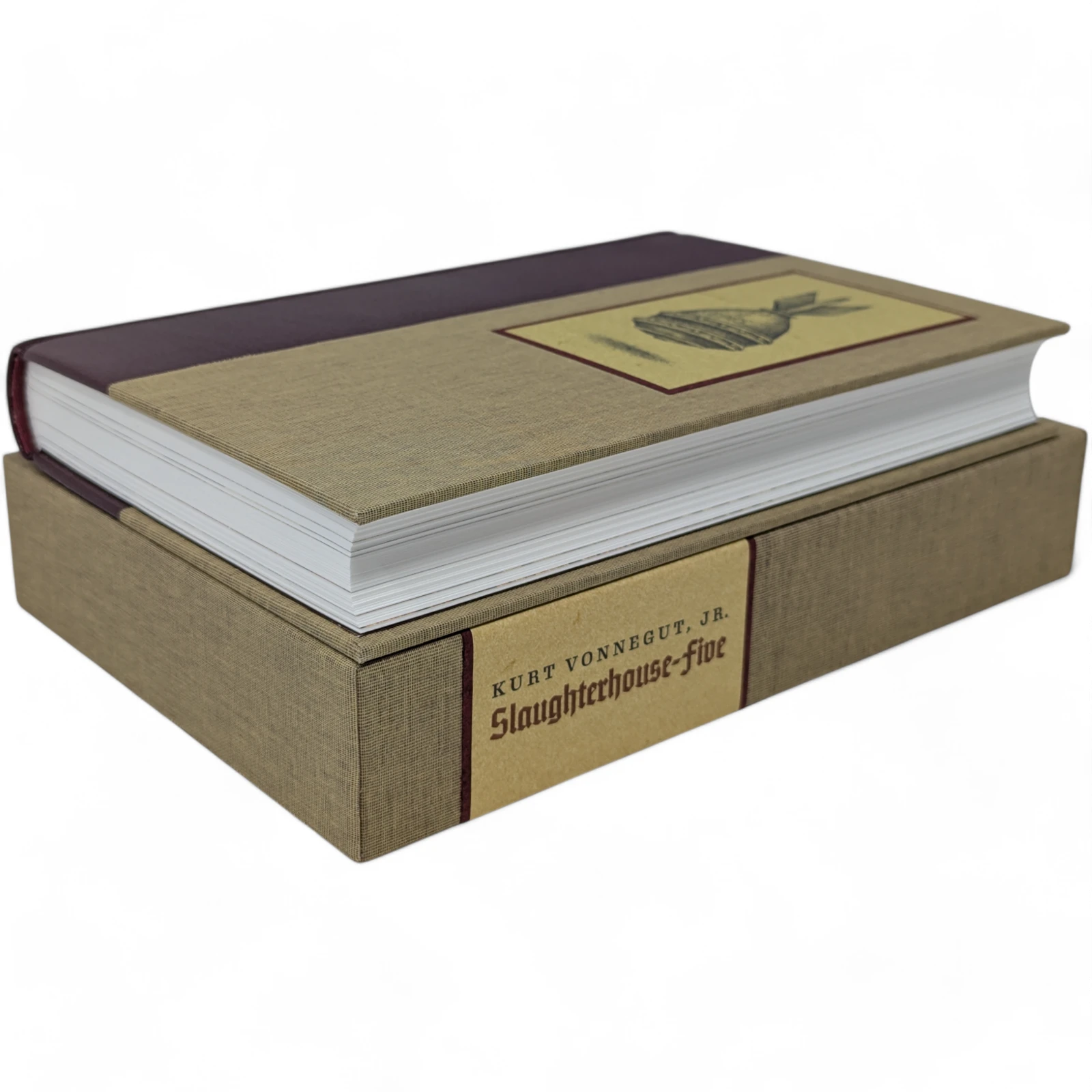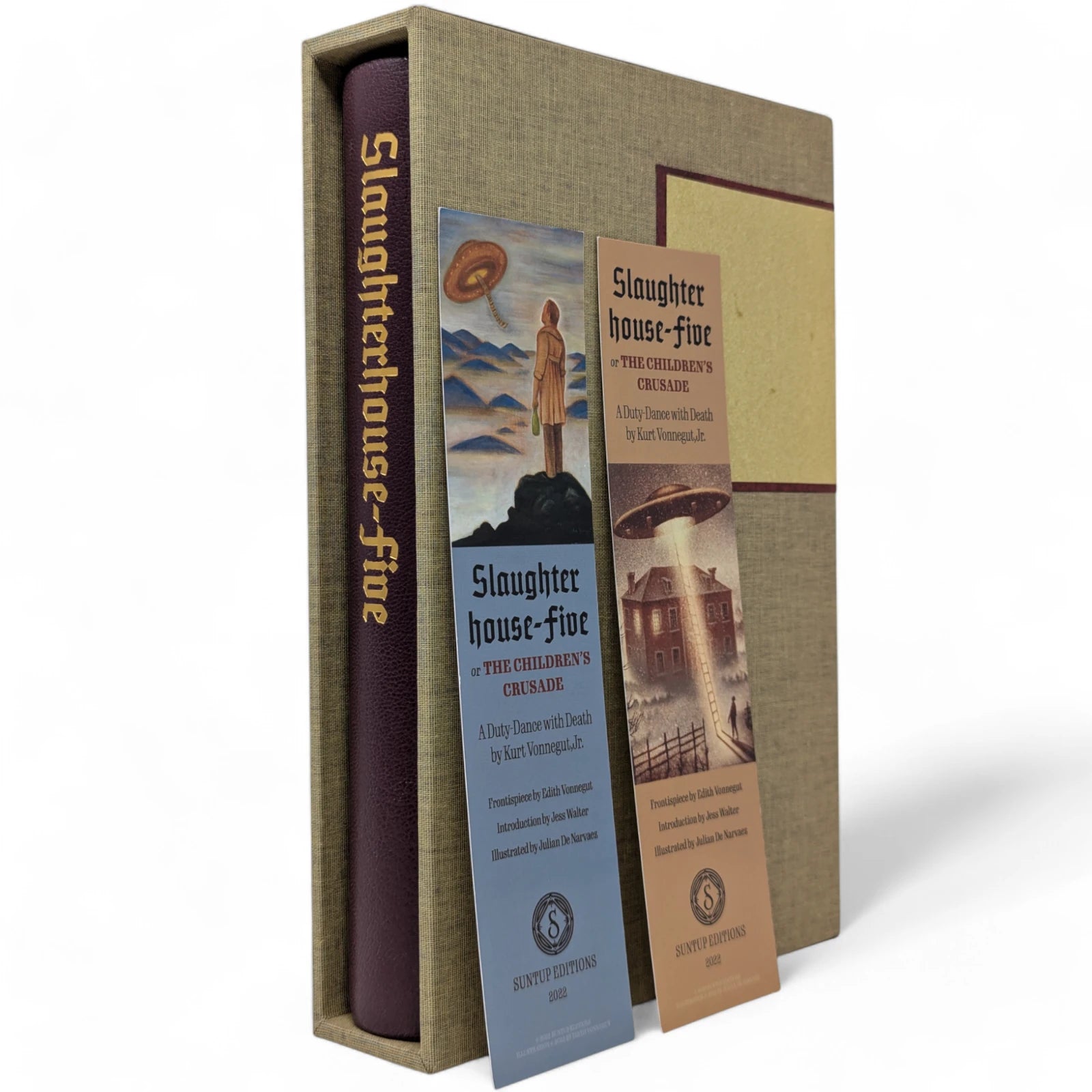 Slaughterhouse-Five, by Kurt Vonnegut Jr. Suntup Editions: 2022. 6” x 9” trim size. 238 pages. Limited to only 350 numbered copies; this being copy number 44. Quarter goatskin binding with duo-tone woven cotton cloth covering the boards. Cover features an inset label printed letterpress. Sculpted headcaps. Handmade headbands. New exclusive introduction by Jess Walter. Frontispiece illustration by Edith Vonnegut. Six full color illustrations by Julian De Narvaez, as well as ten pen and ink vignettes which appear at the head of each chapter. Pen and ink illustrations printed letterpress with the text. Signed by Edith Vonnegut, Jess Walter and Julian De Narvaez. Endsheets are Canson Mi-Teintes. Printed letterpress on Stonehenge cotton paper. Printed in two color on the title and chapter pages. Housed in a slipcase covered with woven cloth and a paper label wrapping the spine and sides. Handbound in the United Kingdom by Roger Grech. Includes original publisher's bookmarks for this edition.