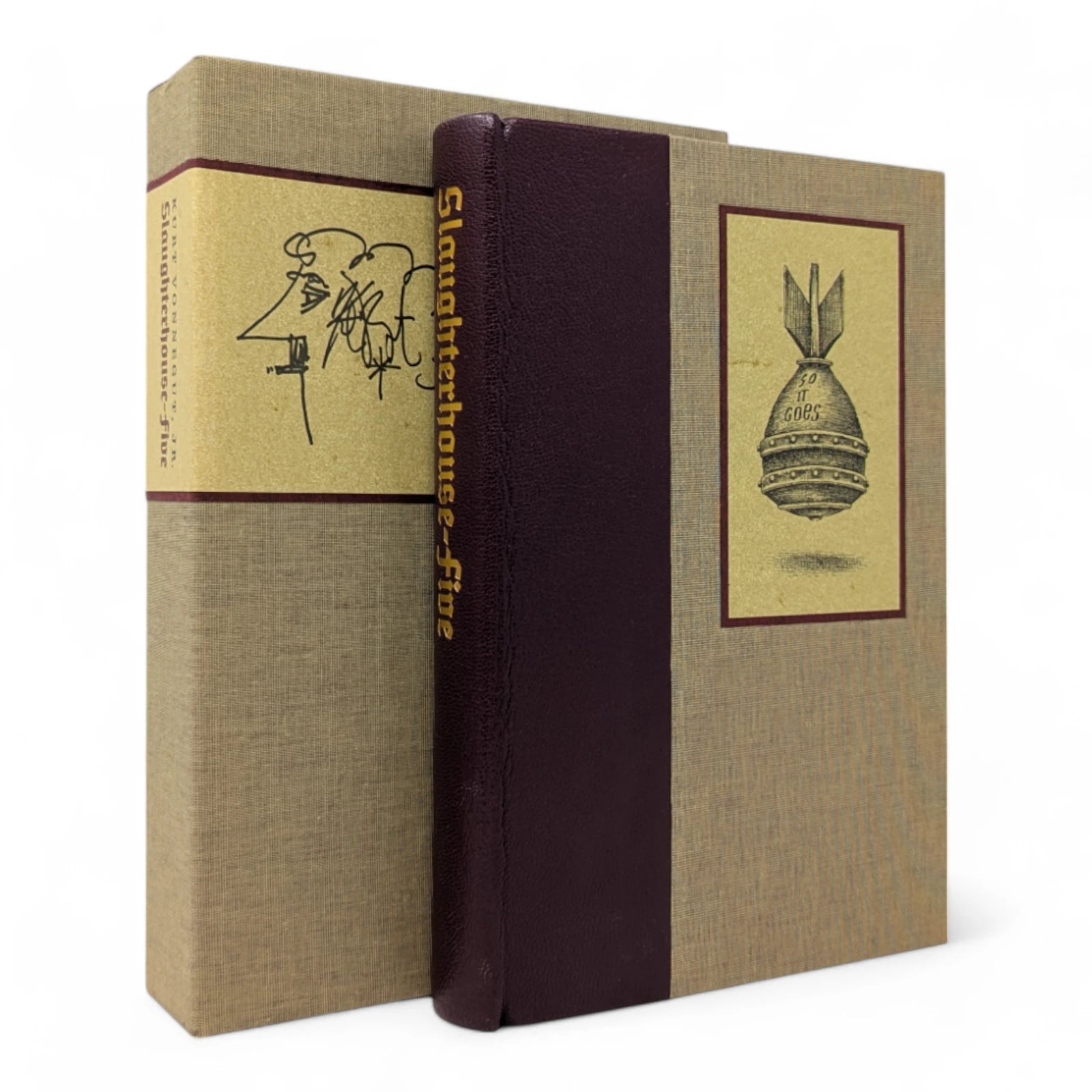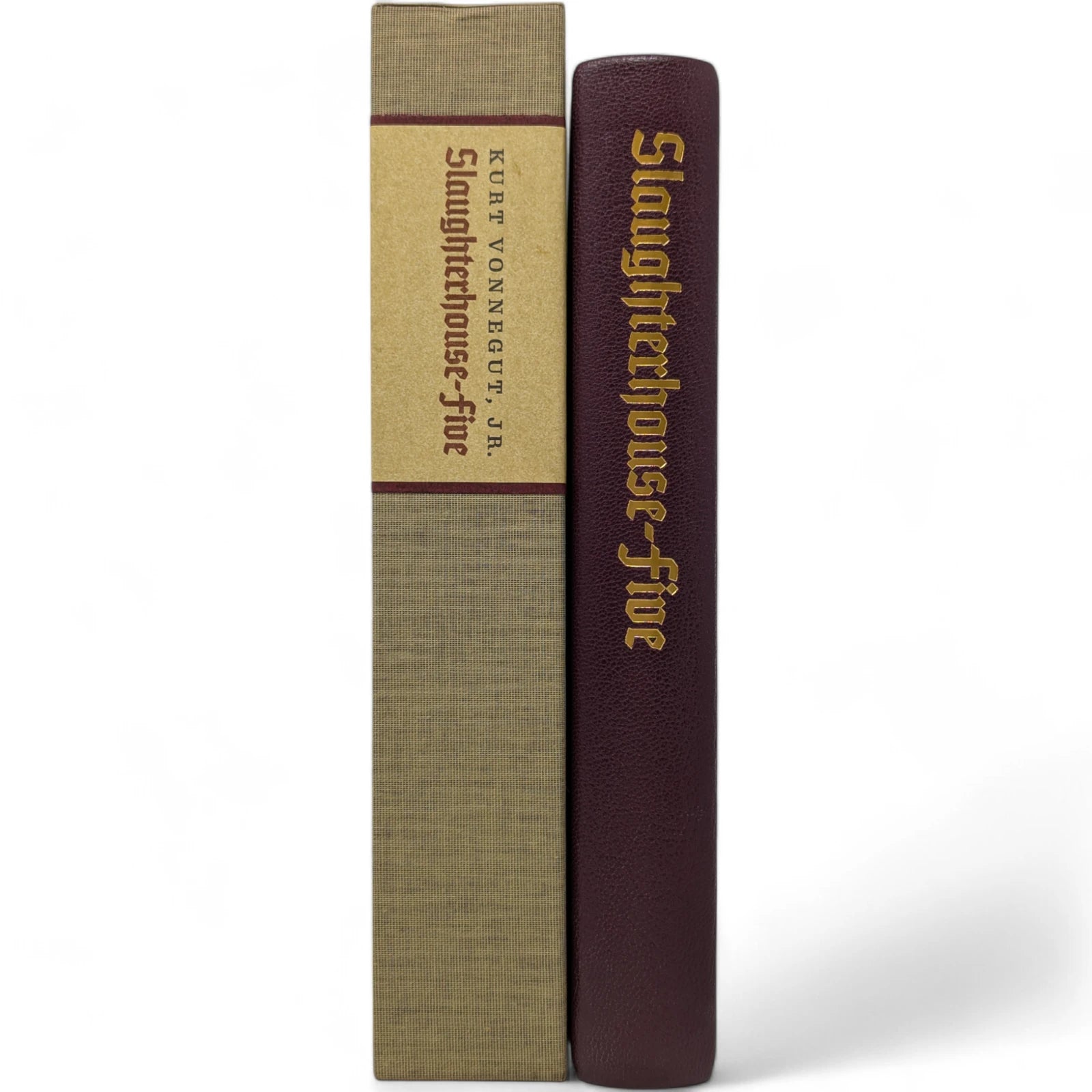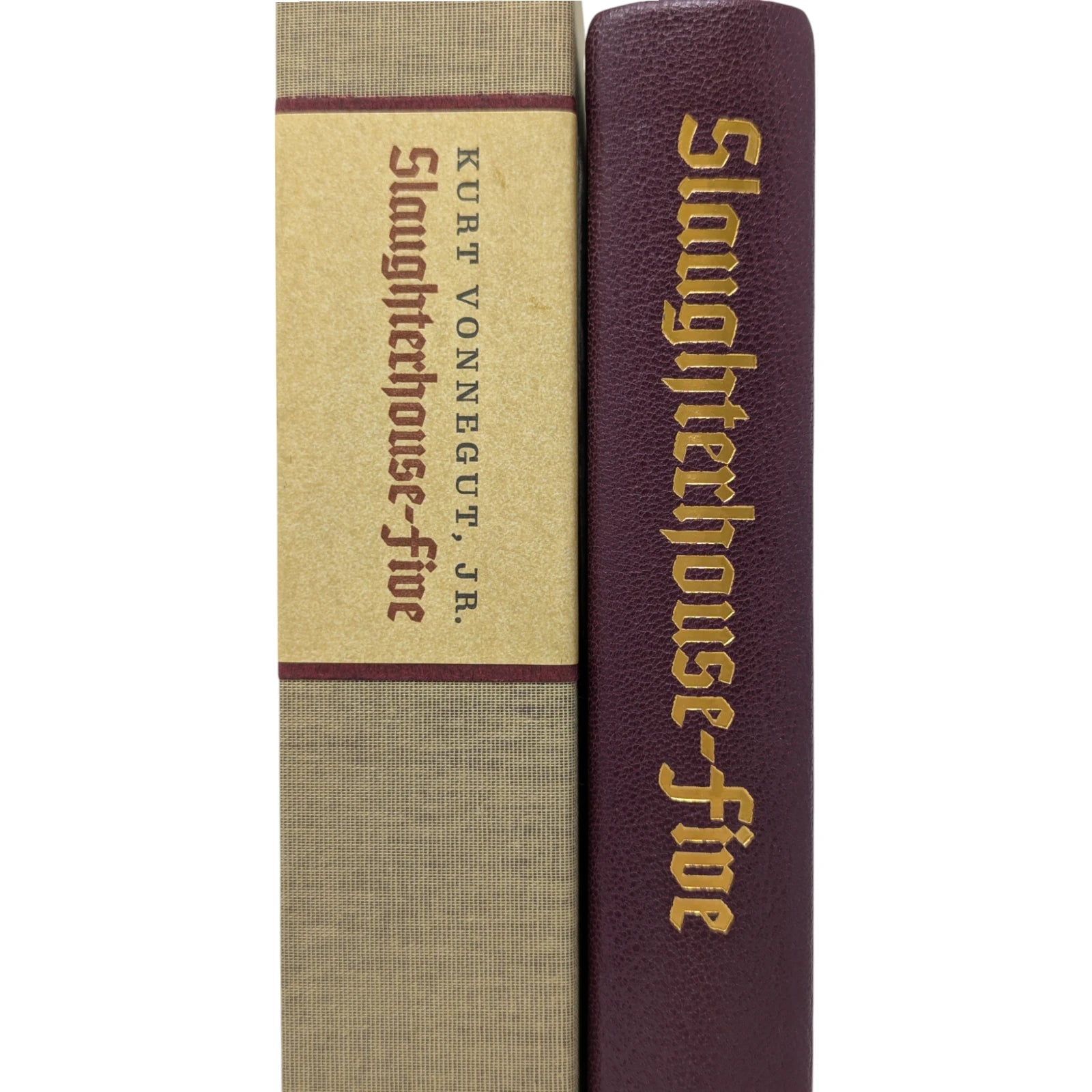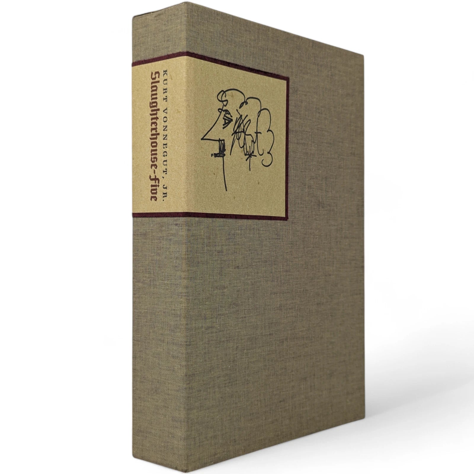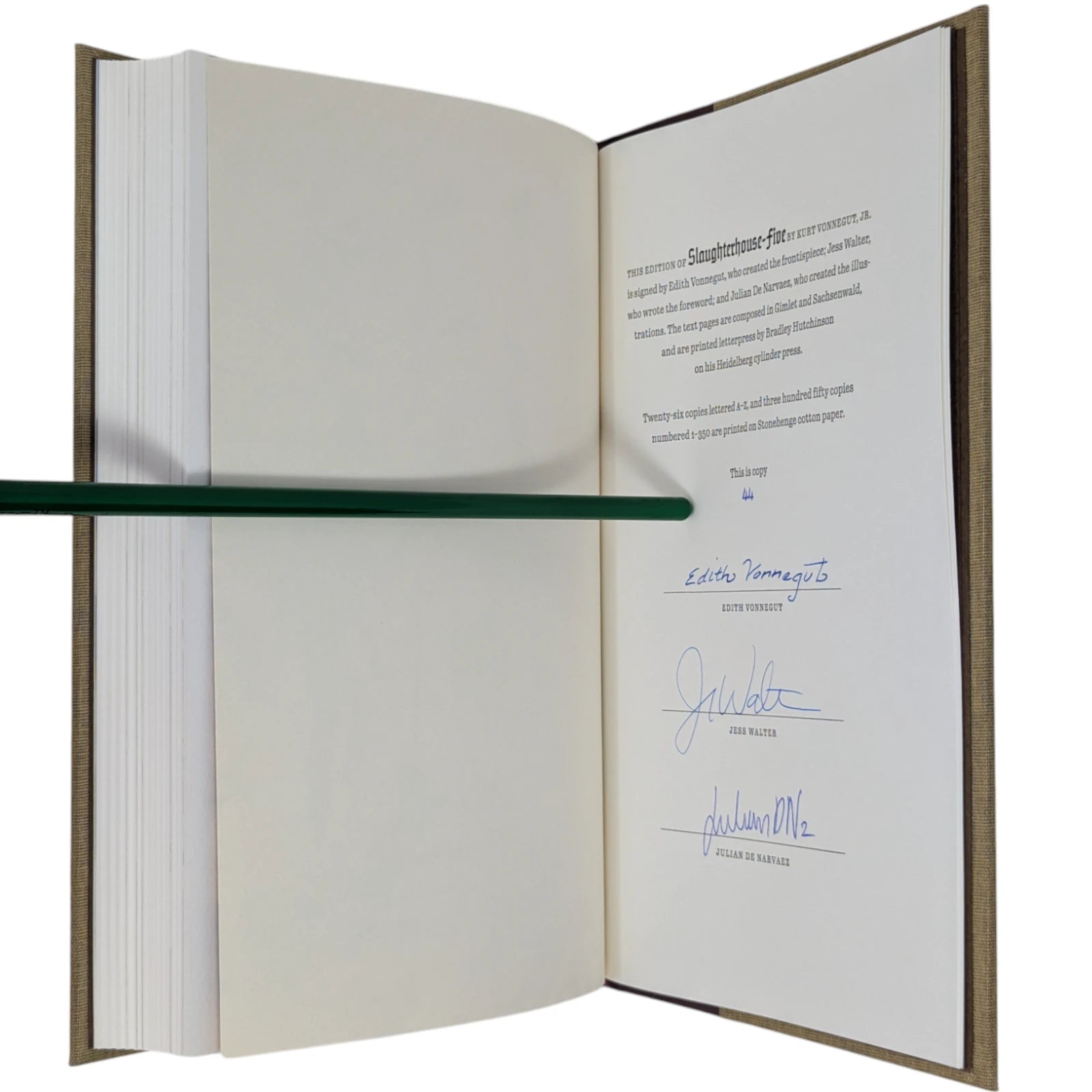 Slaughterhouse-Five, by Kurt Vonnegut Jr. Suntup Editions: 2022. 6” x 9” trim size. 238 pages. Limited to only 350 numbered copies; this being copy number 44. Quarter goatskin binding with duo-tone woven cotton cloth covering the boards. Cover features an inset label printed letterpress. Sculpted headcaps. Handmade headbands. New exclusive introduction by Jess Walter. Frontispiece illustration by Edith Vonnegut. Six full color illustrations by Julian De Narvaez, as well as ten pen and ink vignettes which appear at the head of each chapter. Pen and ink illustrations printed letterpress with the text. Signed by Edith Vonnegut, Jess Walter and Julian De Narvaez. Endsheets are Canson Mi-Teintes. Printed letterpress on Stonehenge cotton paper. Printed in two color on the title and chapter pages. Housed in a slipcase covered with woven cloth and a paper label wrapping the spine and sides. Handbound in the United Kingdom by Roger Grech. Includes original publisher's bookmarks for this edition.
