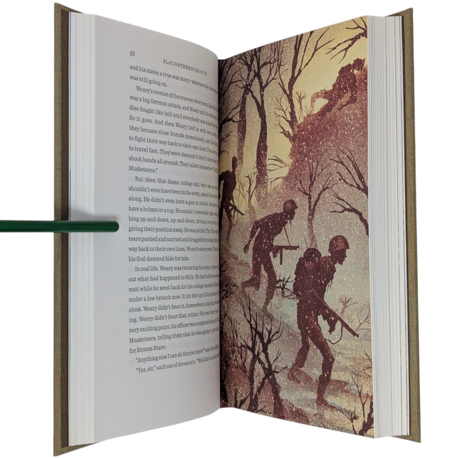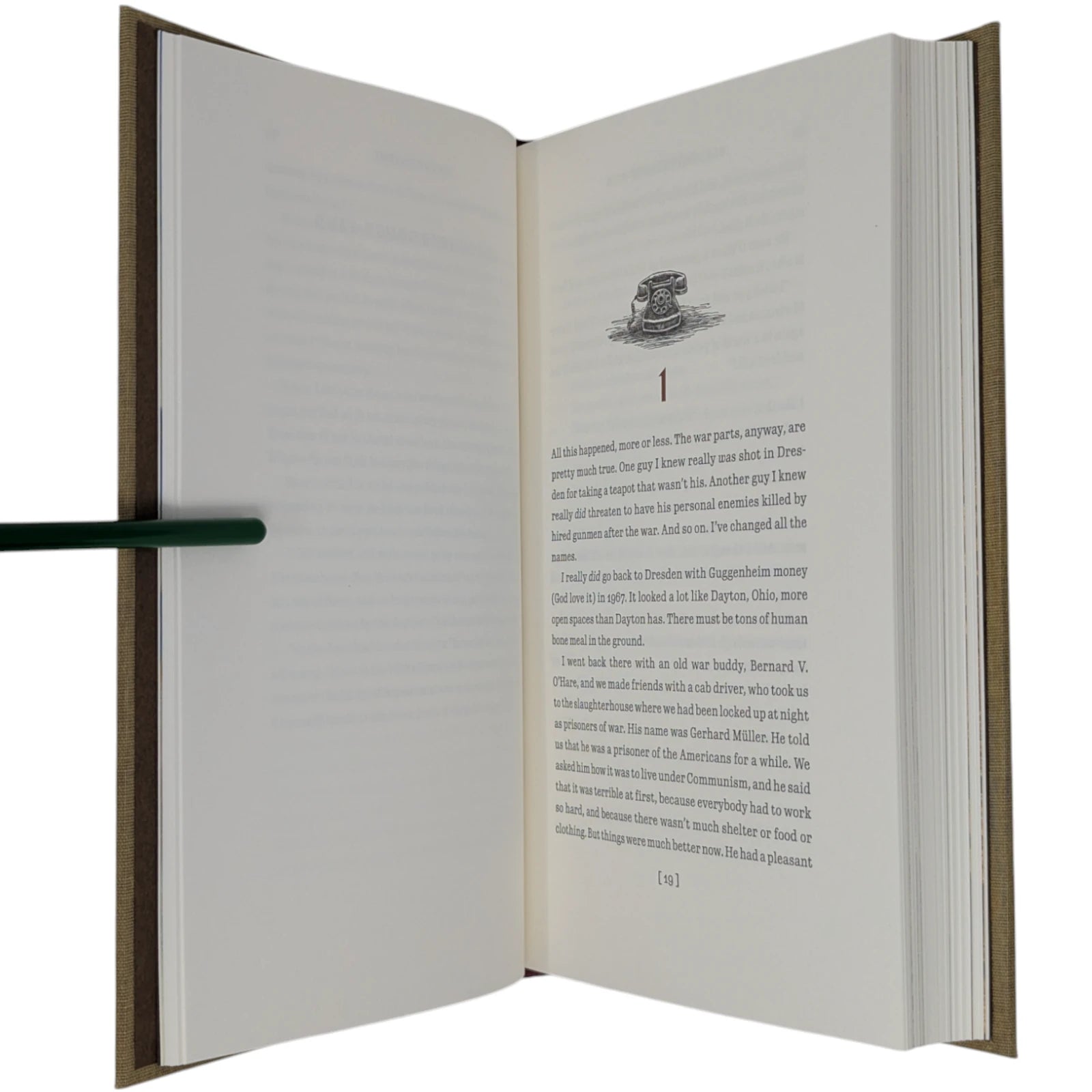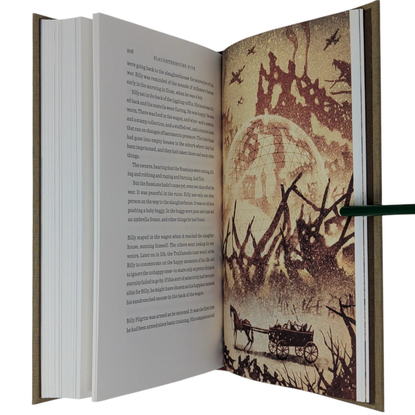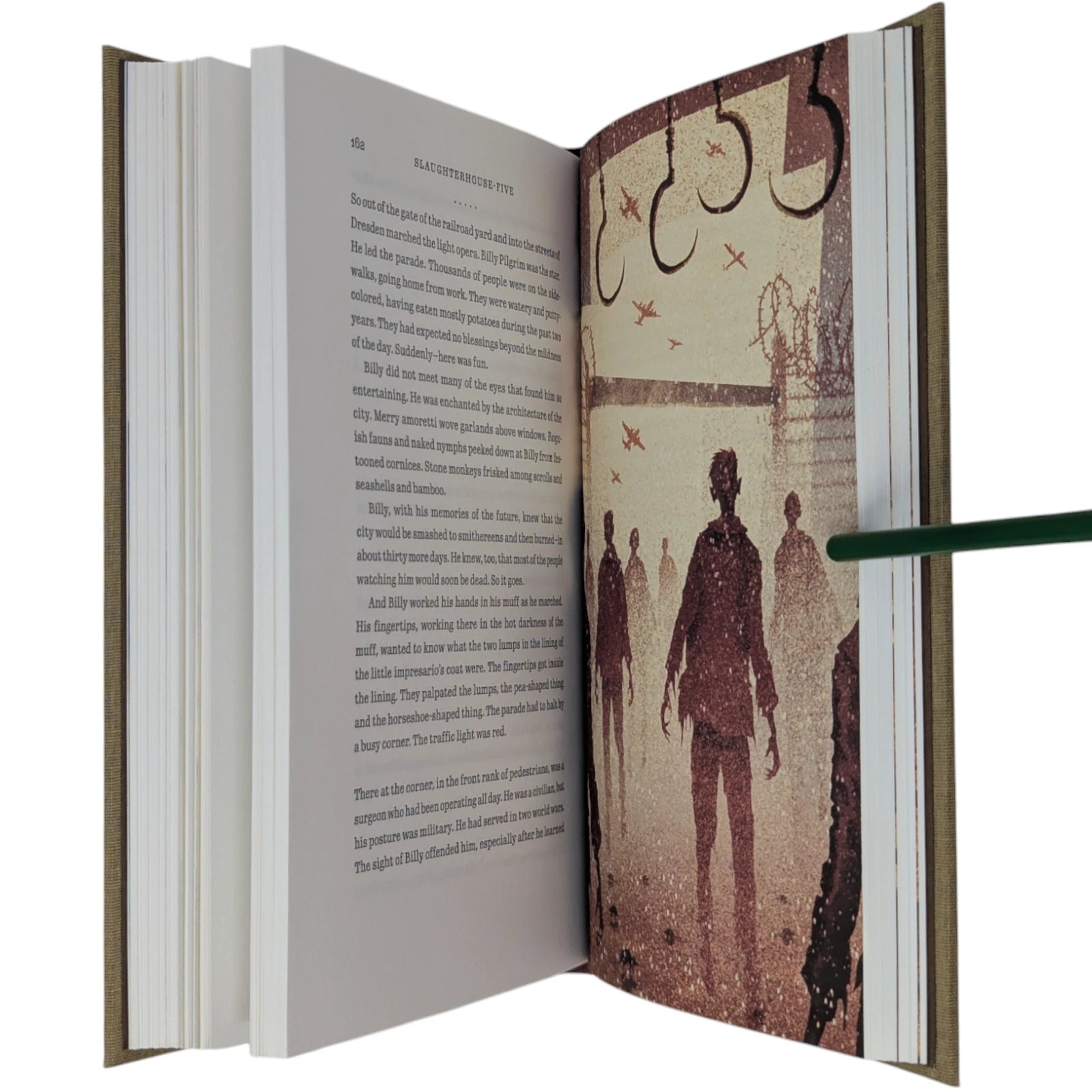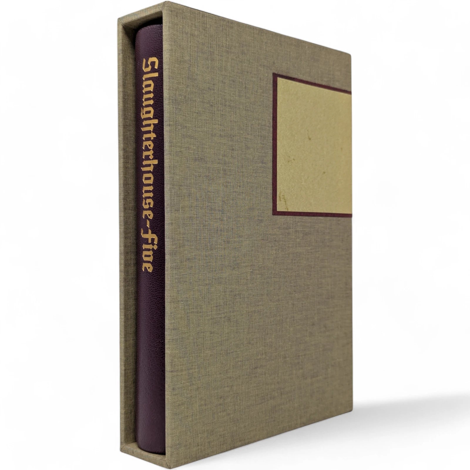 Slaughterhouse-Five, by Kurt Vonnegut Jr. Suntup Editions: 2022. 6” x 9” trim size. 238 pages. Limited to only 350 numbered copies; this being copy number 44. Quarter goatskin binding with duo-tone woven cotton cloth covering the boards. Cover features an inset label printed letterpress. Sculpted headcaps. Handmade headbands. New exclusive introduction by Jess Walter. Frontispiece illustration by Edith Vonnegut. Six full color illustrations by Julian De Narvaez, as well as ten pen and ink vignettes which appear at the head of each chapter. Pen and ink illustrations printed letterpress with the text. Signed by Edith Vonnegut, Jess Walter and Julian De Narvaez. Endsheets are Canson Mi-Teintes. Printed letterpress on Stonehenge cotton paper. Printed in two color on the title and chapter pages. Housed in a slipcase covered with woven cloth and a paper label wrapping the spine and sides. Handbound in the United Kingdom by Roger Grech. Includes original publisher's bookmarks for this edition.