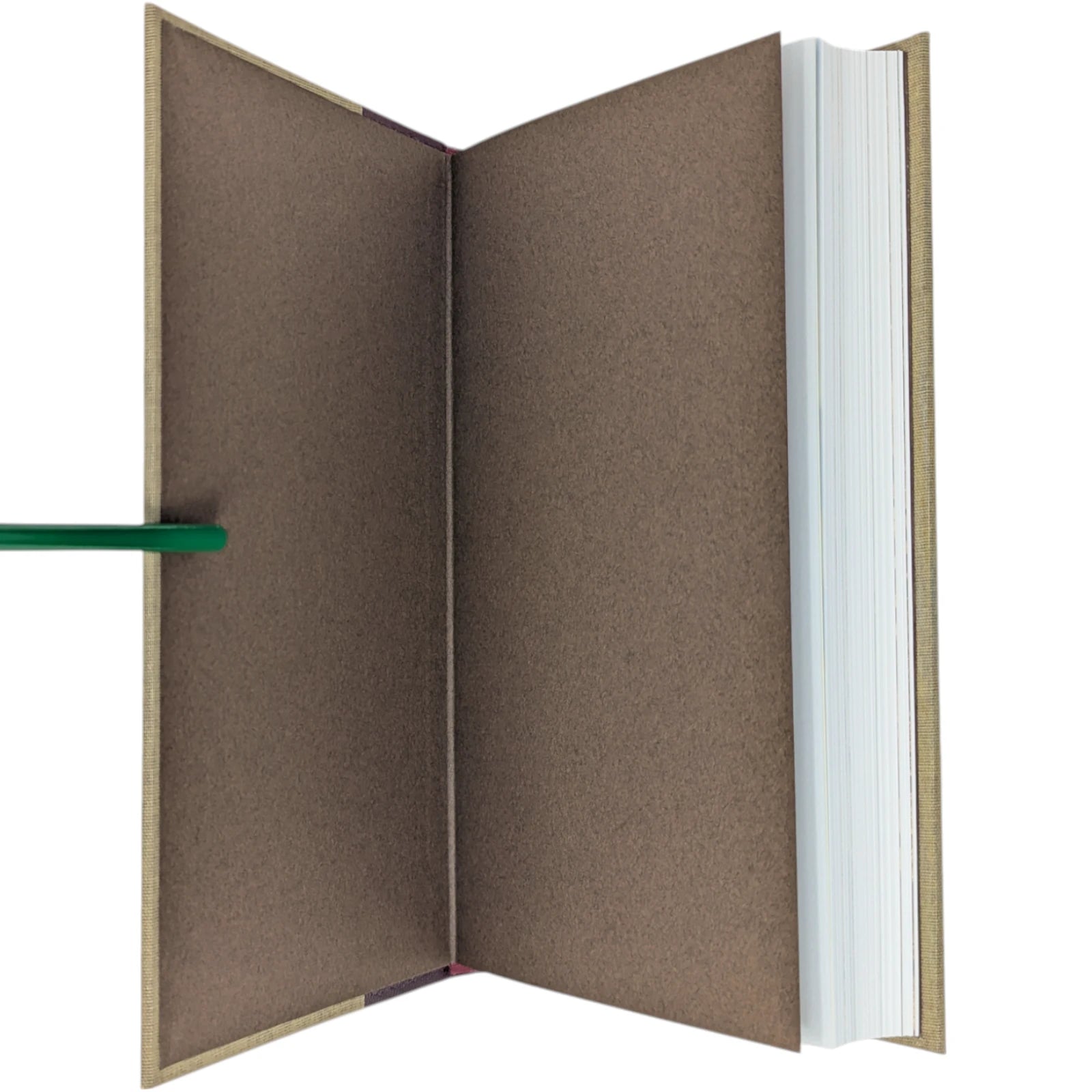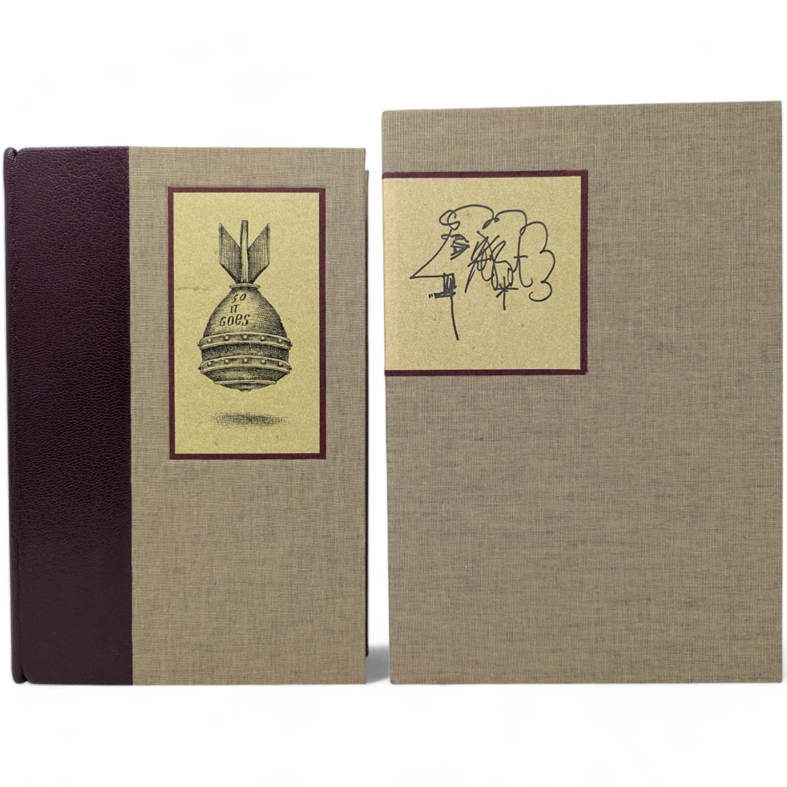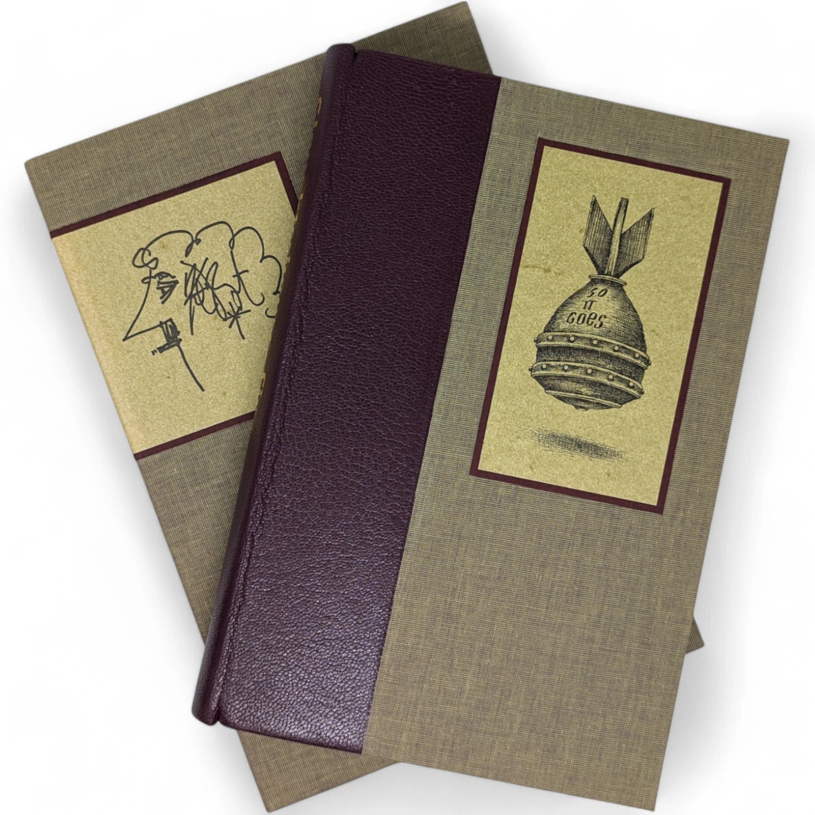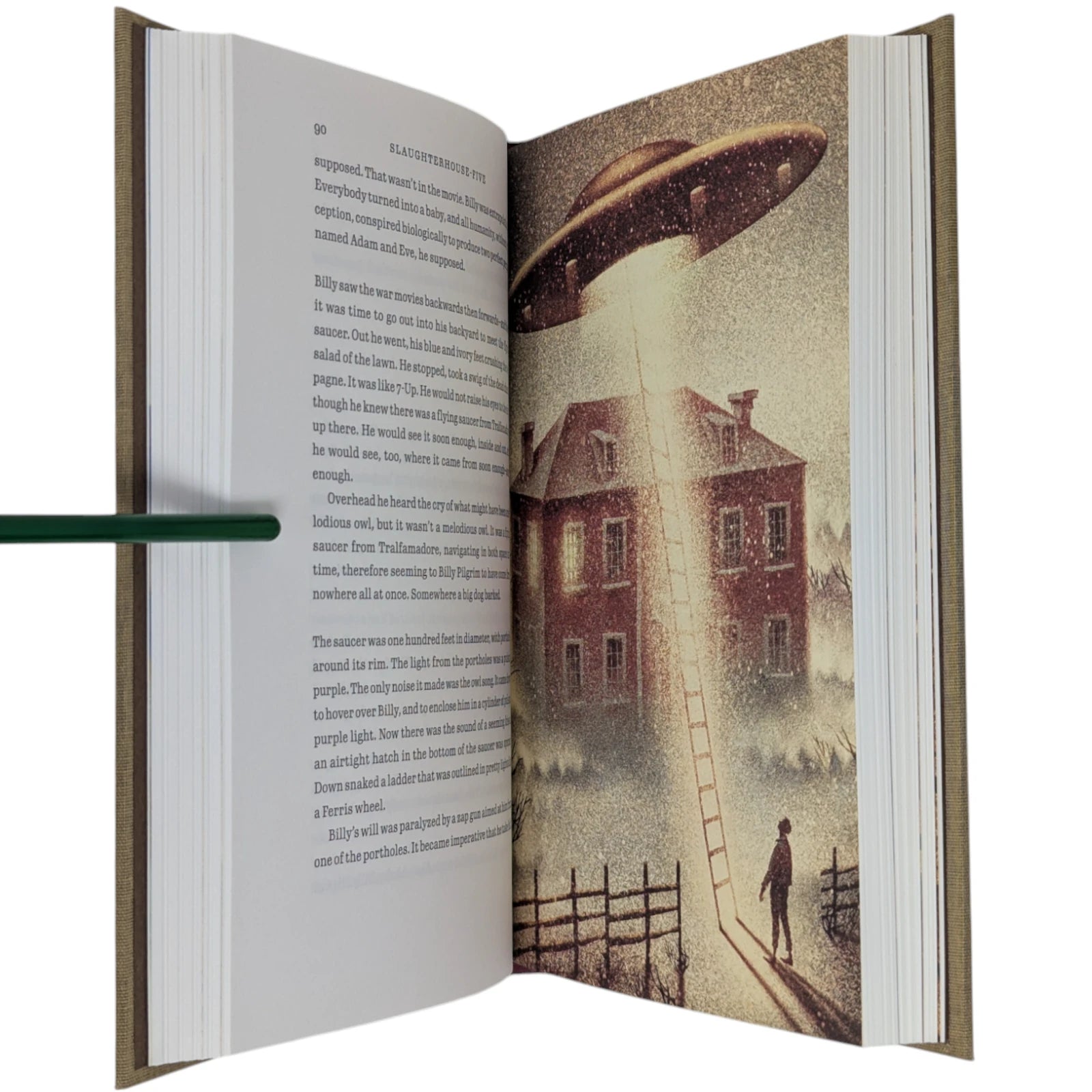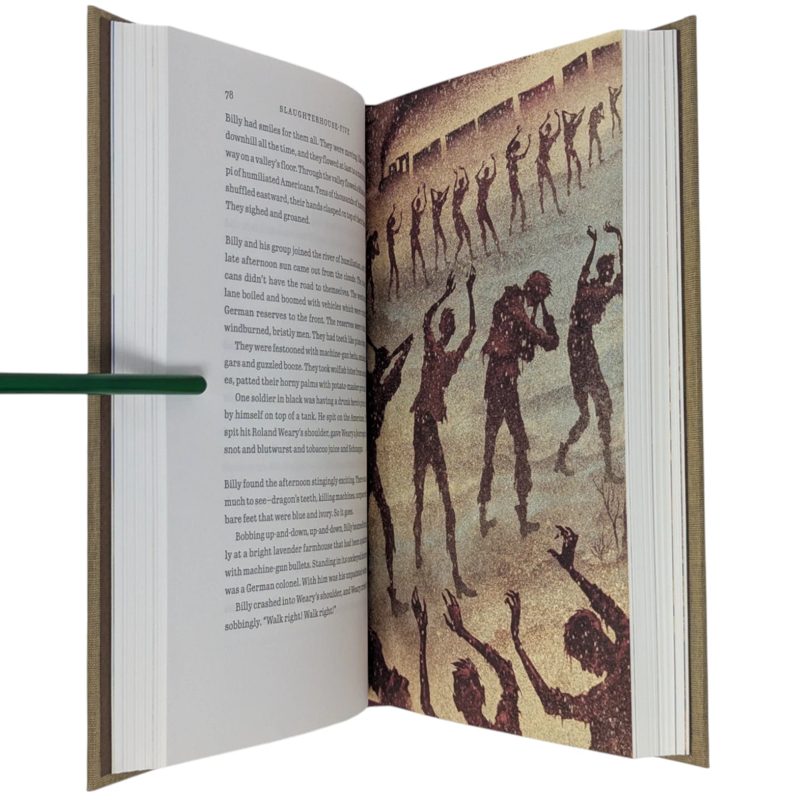 Slaughterhouse-Five, by Kurt Vonnegut Jr. Suntup Editions: 2022. 6” x 9” trim size. 238 pages. Limited to only 350 numbered copies; this being copy number 44. Quarter goatskin binding with duo-tone woven cotton cloth covering the boards. Cover features an inset label printed letterpress. Sculpted headcaps. Handmade headbands. New exclusive introduction by Jess Walter. Frontispiece illustration by Edith Vonnegut. Six full color illustrations by Julian De Narvaez, as well as ten pen and ink vignettes which appear at the head of each chapter. Pen and ink illustrations printed letterpress with the text. Signed by Edith Vonnegut, Jess Walter and Julian De Narvaez. Endsheets are Canson Mi-Teintes. Printed letterpress on Stonehenge cotton paper. Printed in two color on the title and chapter pages. Housed in a slipcase covered with woven cloth and a paper label wrapping the spine and sides. Handbound in the United Kingdom by Roger Grech. Includes original publisher's bookmarks for this edition.