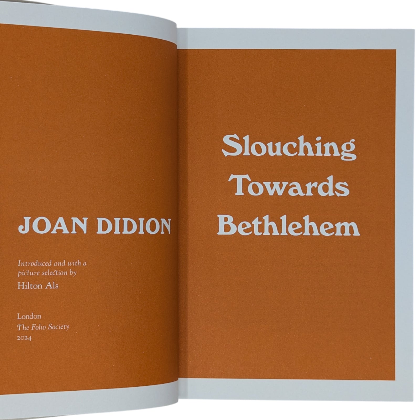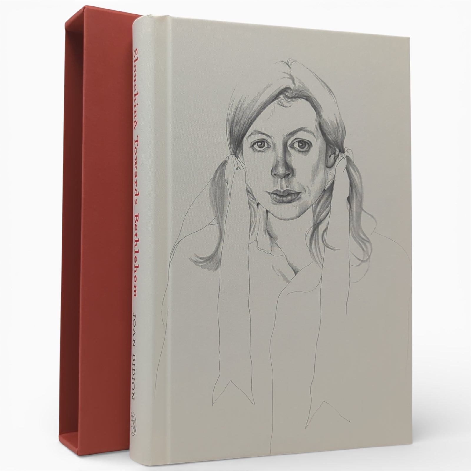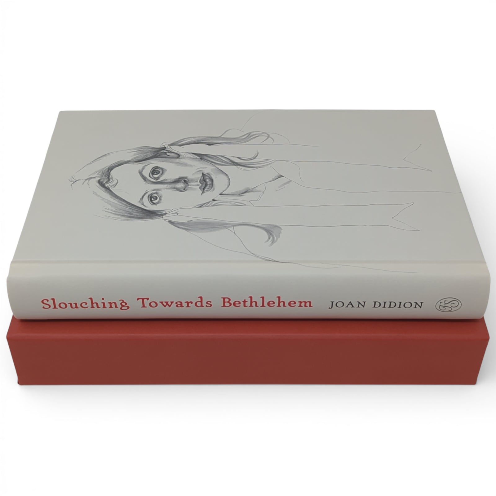 DIDION, Joan. Slouching Towards Bethlehem. London: The Folio Society, 2024. First Folio edition of the author's first collection of journalism covering her visceral view of 1960s America. Introduction and image selection by Pulitzer Prize-winning critic Hilton Als. 8¾ inches x 5½ inches, 280 pages. Bound in blocked textured paper printed with a portrait of Joan Didion by Don Bachardy, with ribbon marker. Set in Kennerley with Windsor as display. Housed in a plain slipcase.