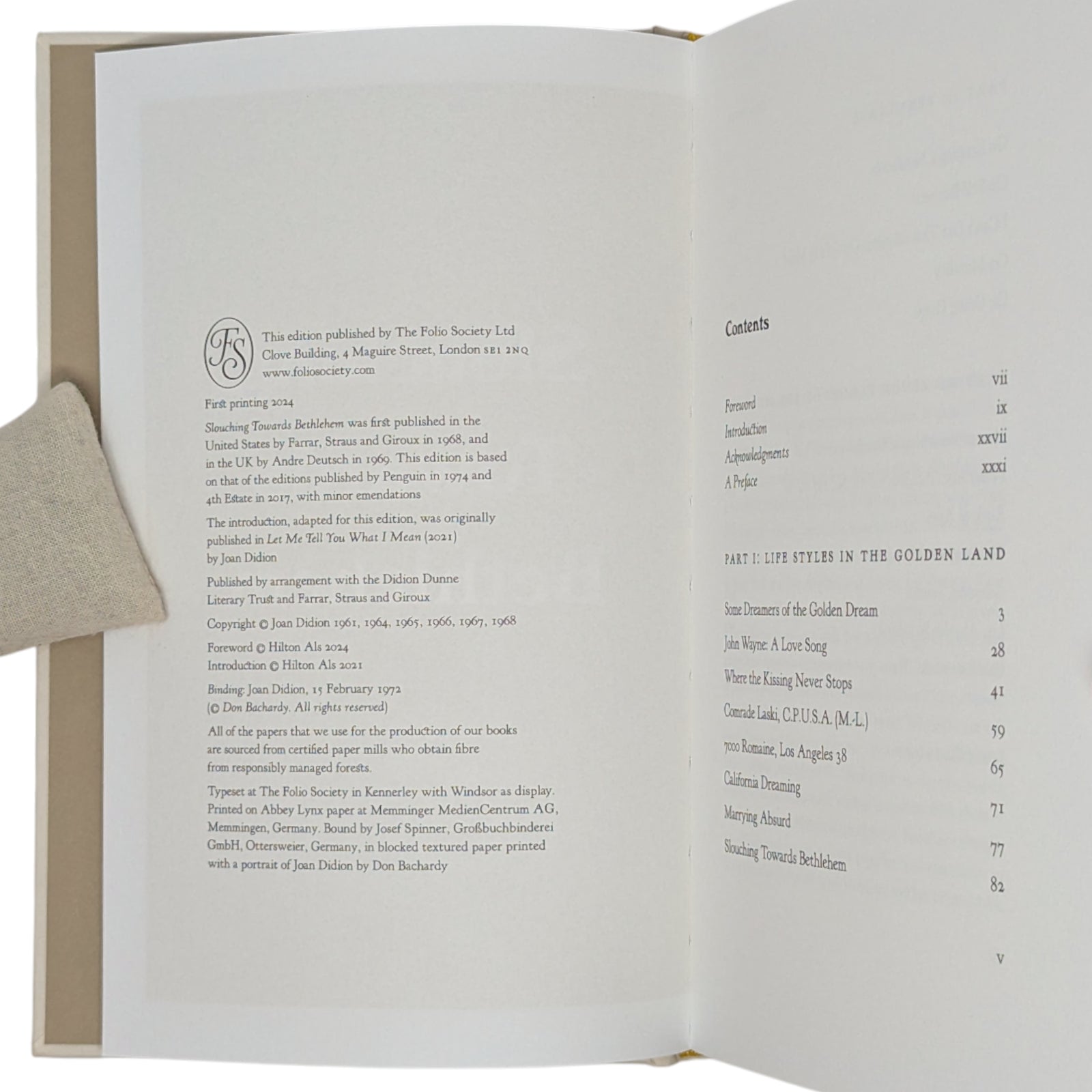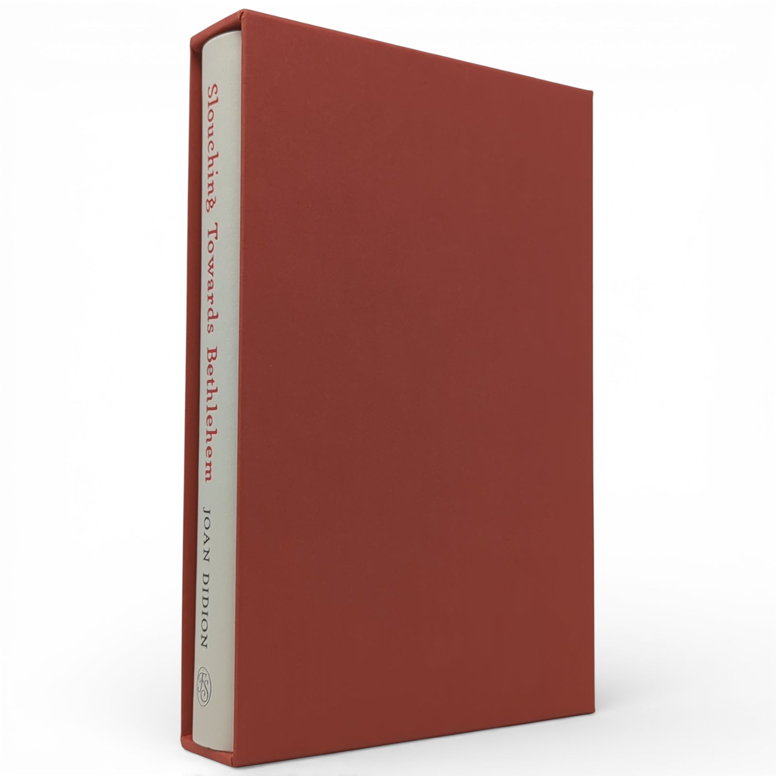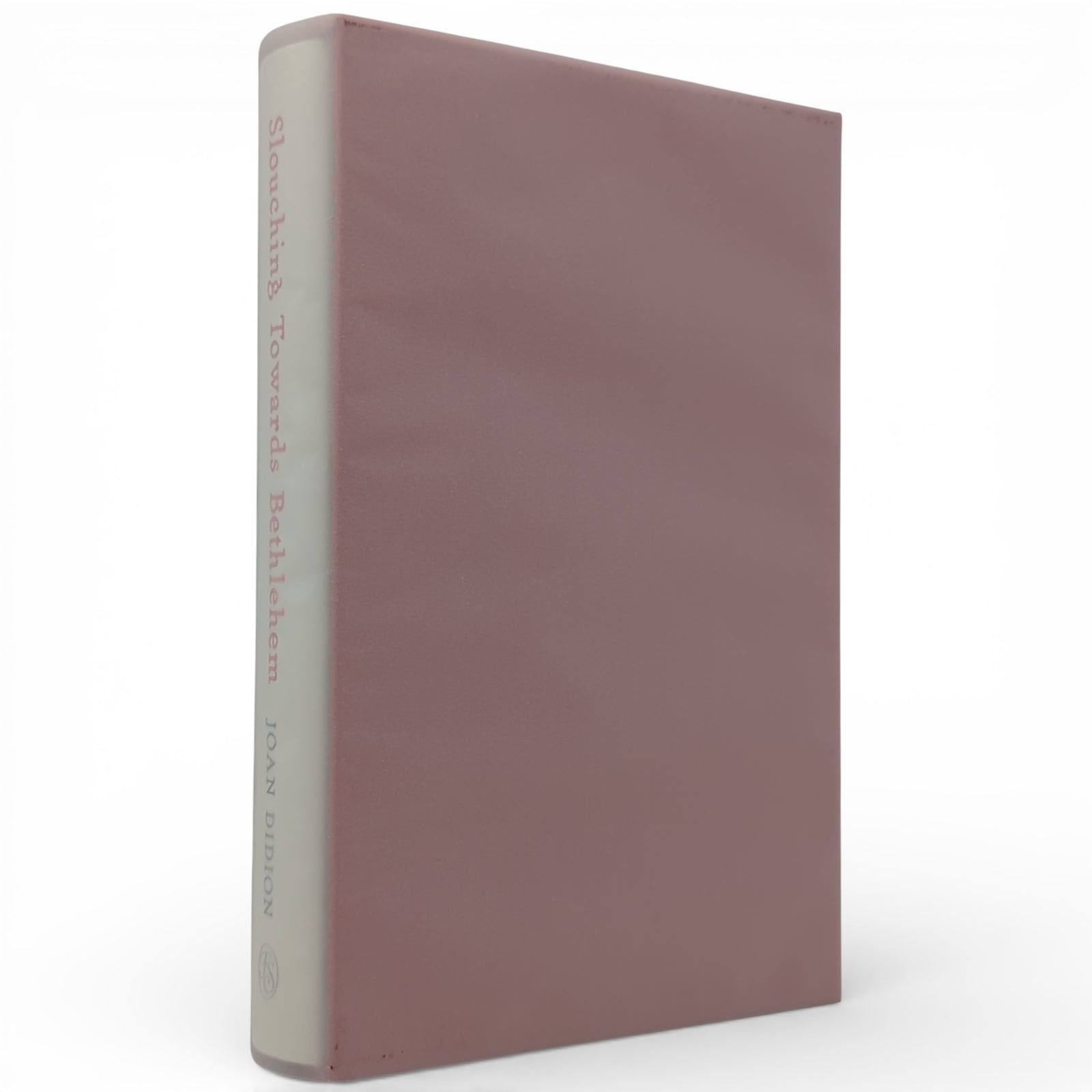 DIDION, Joan. Slouching Towards Bethlehem. London: The Folio Society, 2024. First Folio edition of the author's first collection of journalism covering her visceral view of 1960s America. Introduction and image selection by Pulitzer Prize-winning critic Hilton Als. 8¾ inches x 5½ inches, 280 pages. Bound in blocked textured paper printed with a portrait of Joan Didion by Don Bachardy, with ribbon marker. Set in Kennerley with Windsor as display. Housed in a plain slipcase.