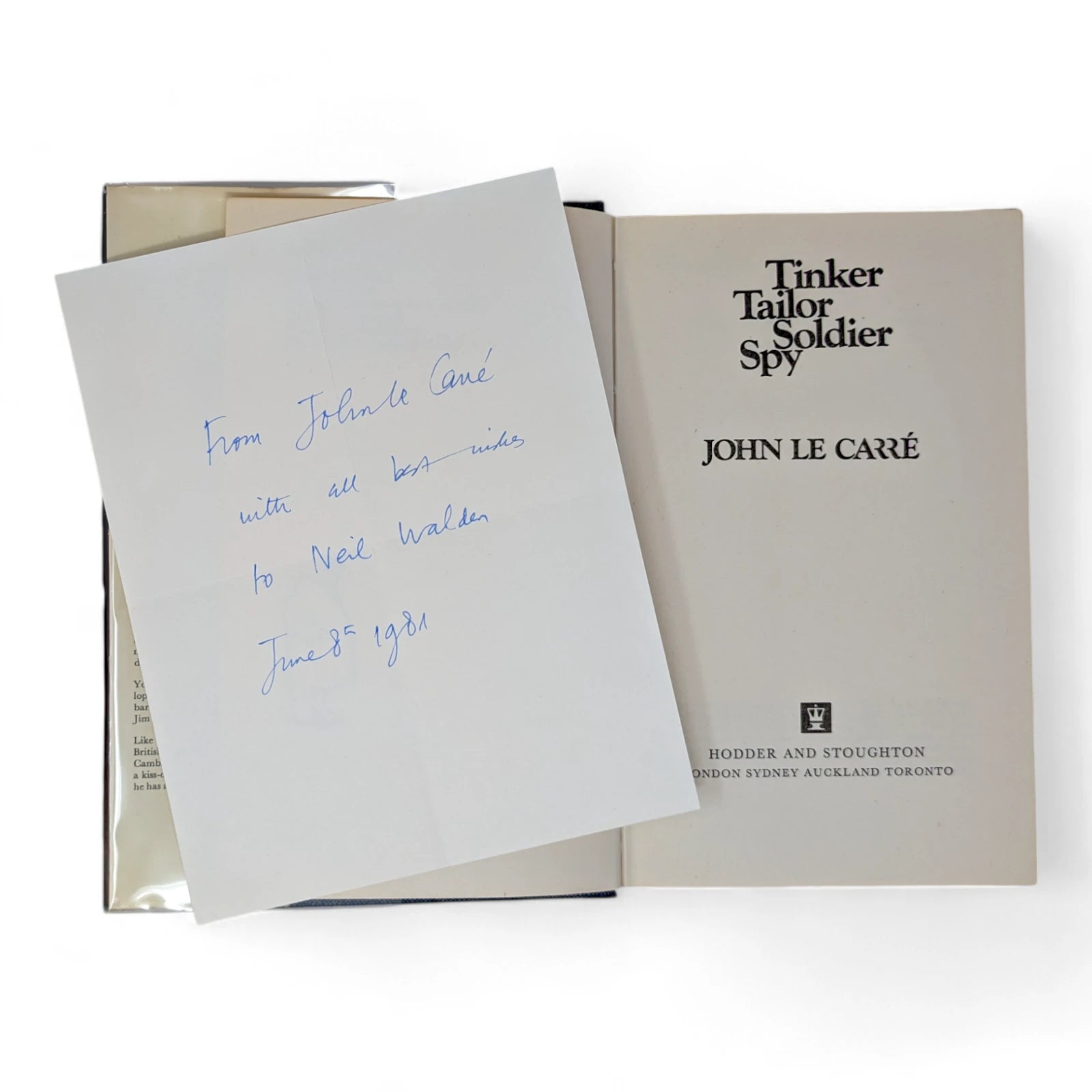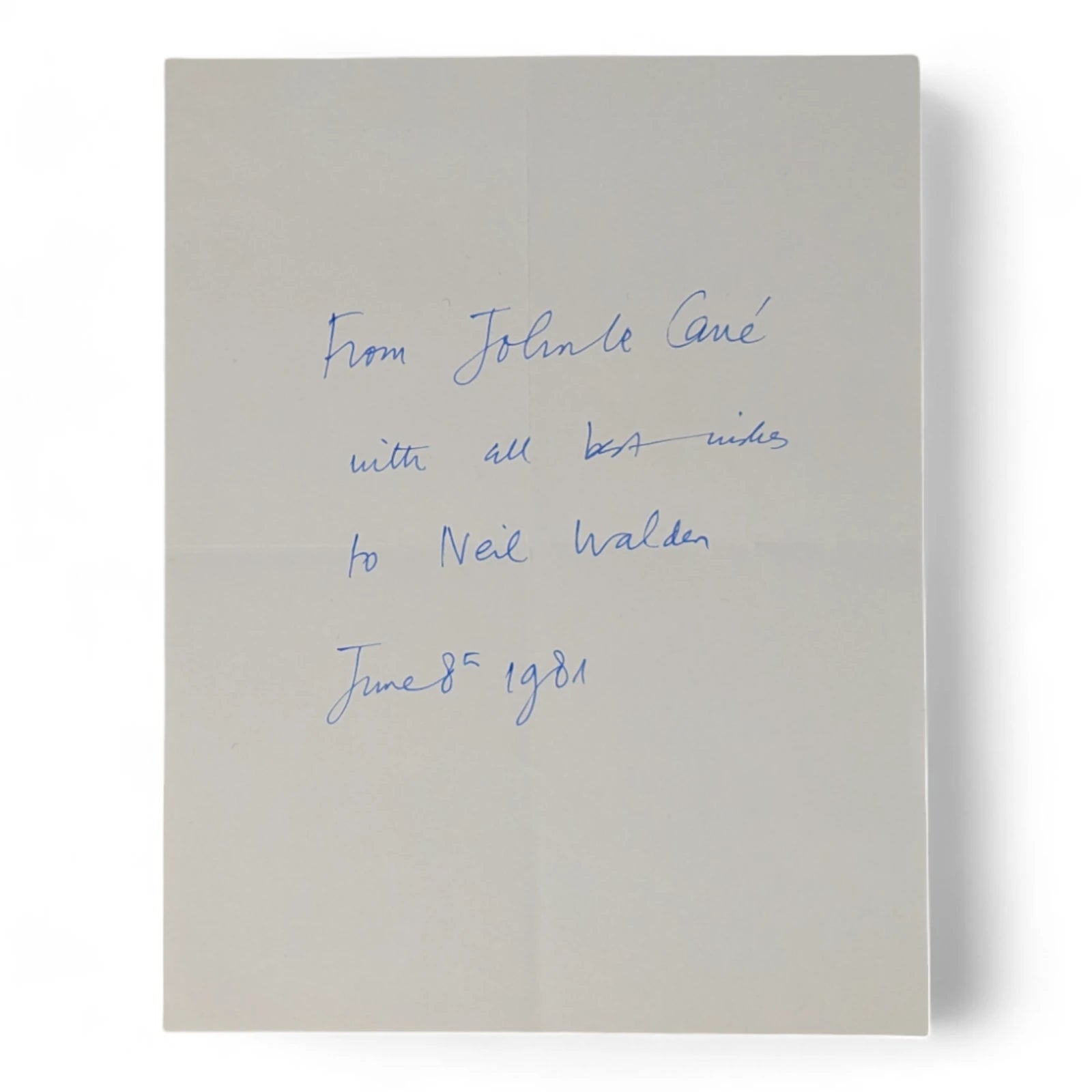 Loosely inserted twice-folded piece of paper signed by author John Le Carre on 8th June 1981 "From John Le Carre with all best wishes to Neil Walden, June 8th 1981". This signed and dedicated piece of paper came as part of a large collection of letters, photographs and cards signed by prominent authors and playwriters, amassed in the 1970s and 1980s by collector Neil Walden.