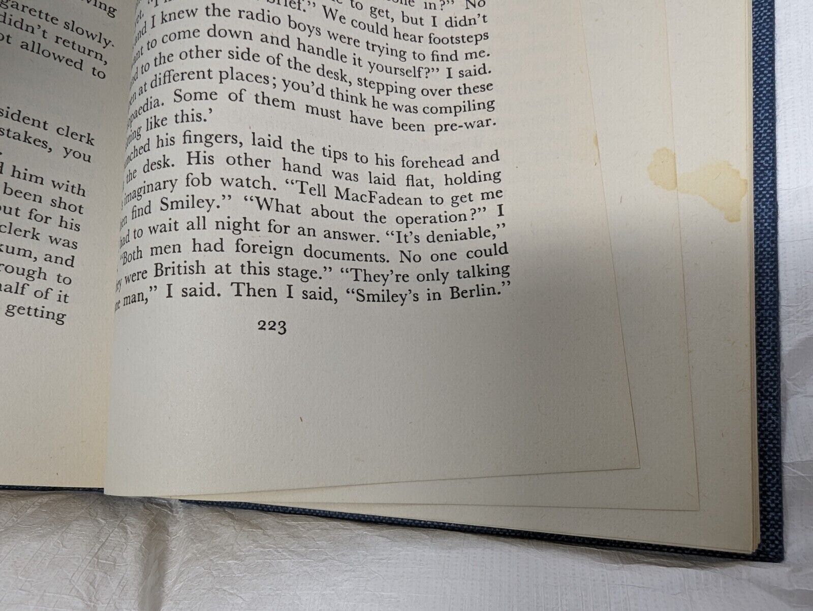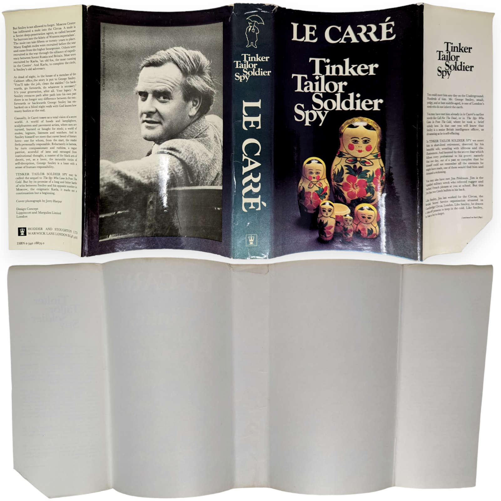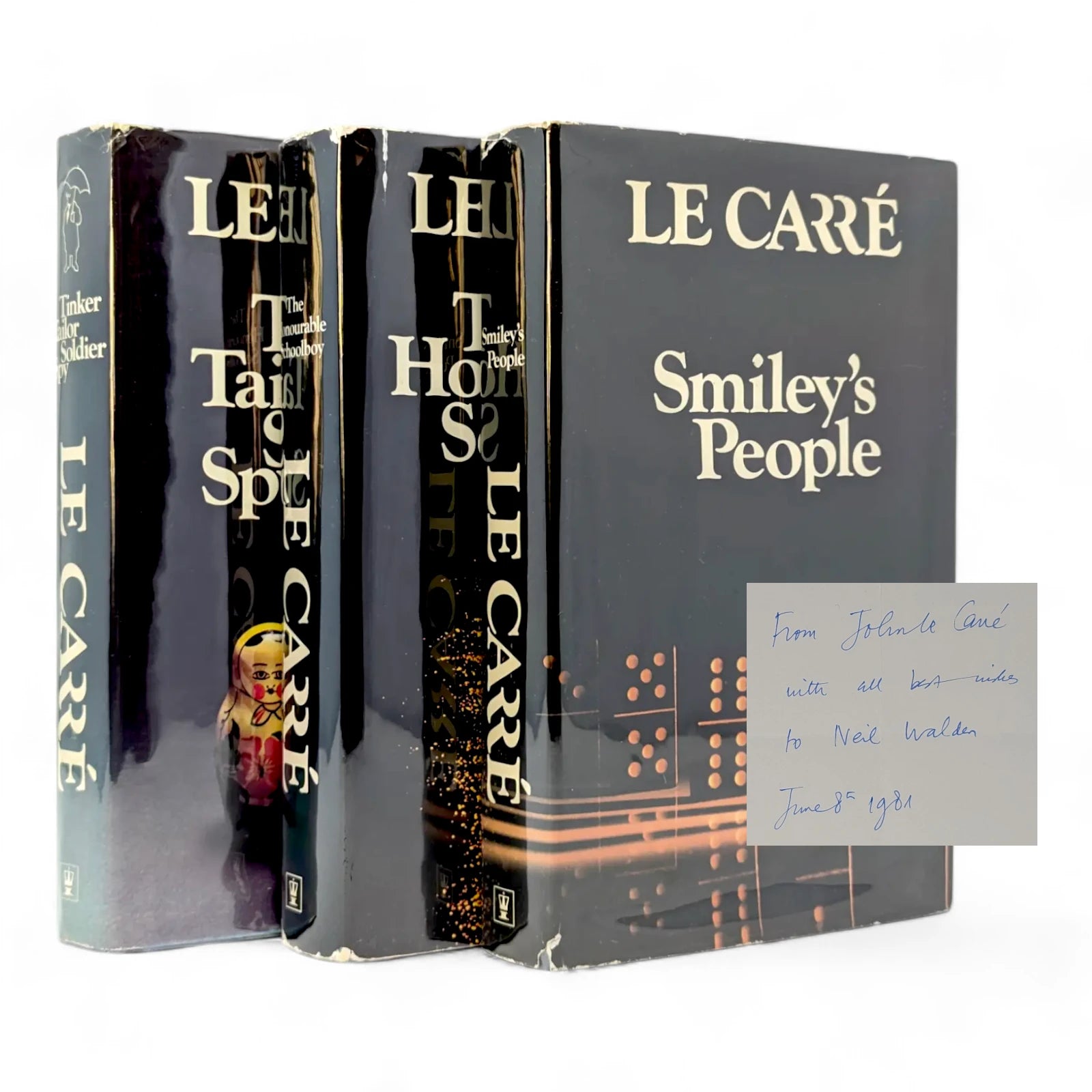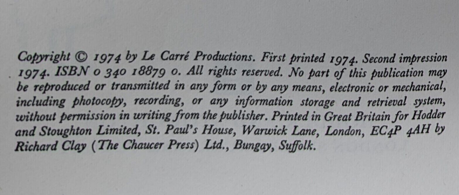 Tinker Tailor Soldier Spy. First edition, second impression. London: Hodder and Stoughton 1974. Pp. 349. Light bumping to one corner, mild crushing to spine tips and small, one-inch tear between board and spine. Slight wear to lettering on the spine. Light foxing and marking to edges. Inscription in pen dated 1974 to FFEP and some small stains, unaffecting text, to a handful of pages, as pictured. Very mild lean to text block. Price-clipped dust wrapper slightly discoloured on spine and tanned to extremities, with some creasing and chipping to edges and little loss. Otherwise a very good copy.