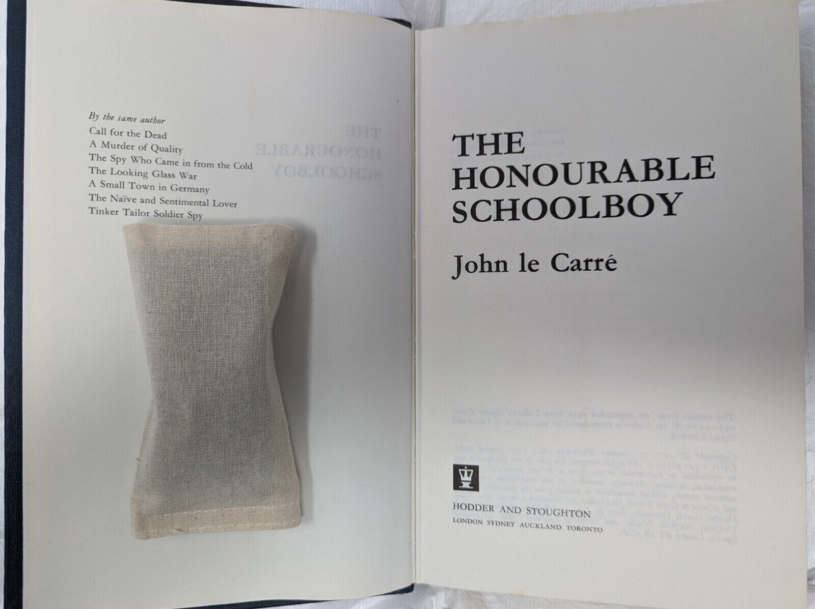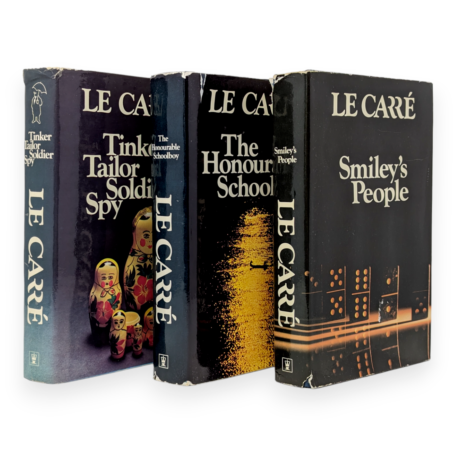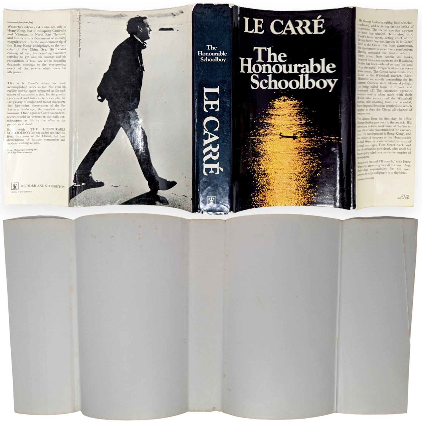 The Honourable Schoolboy. First edition, first impression. London. Hodder and Stoughton 1977. Pp. 532. Light bumping to two corners, mild crushing to spine tips and darkening to extremities and spine. Significant foxing to edges, little to prelims. Uninscribed copy. Mild forward lean to text block. Unclipped dust wrapper (£4.95 net) with foxing on the inside, light discolouration to spine, some creasing, chipping and little loss. Otherwise a very good copy.