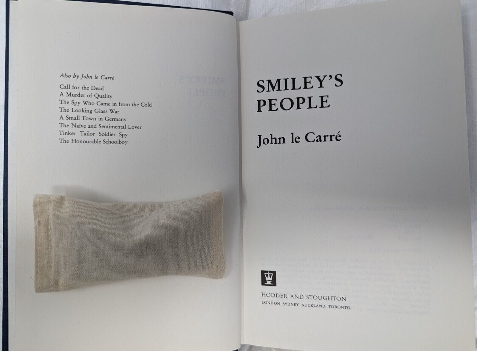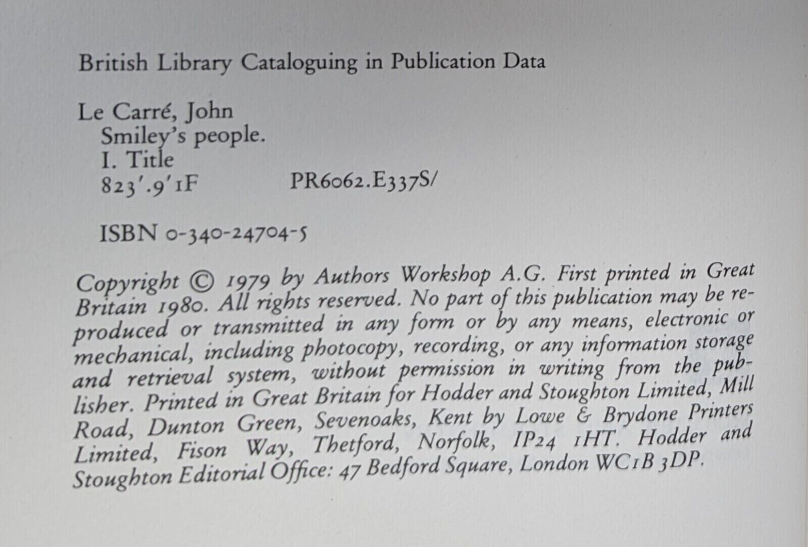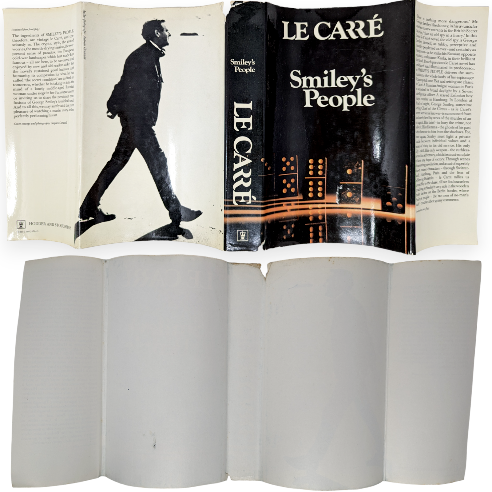 Smiley's People. First edition, first impression. London: Hodder and Stoughton 1980. Pp. 327. Light bumping to one corner, mild crushing to spine tips. A few spots of marking and foxing to edges. Uninscribed copy. Binding nice and square. Unclipped (although price not showing) dust wrapper with some chipping, a bit of wear to front panel and a tiny portion of loss to spine top, as pictured. Otherwise a very good copy.