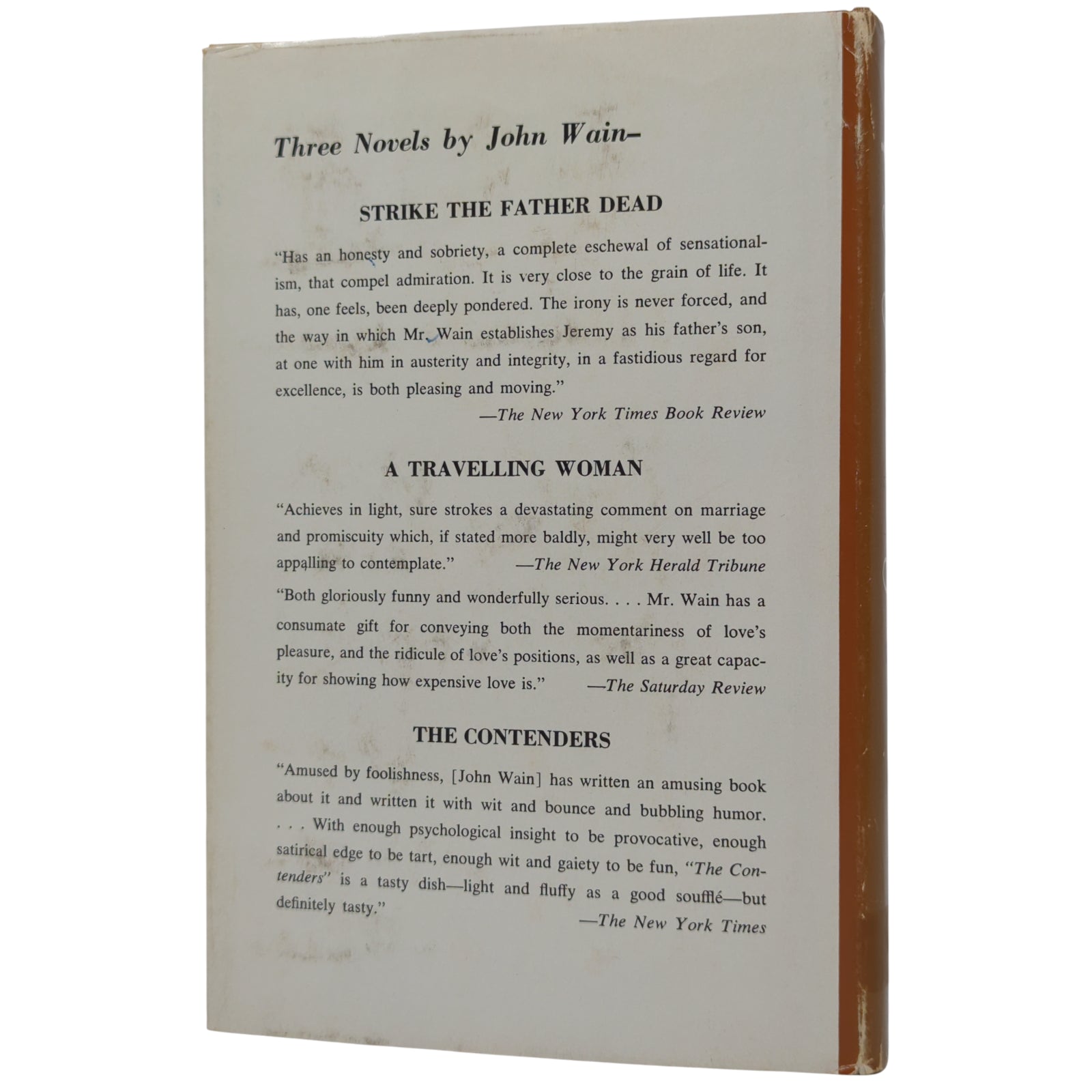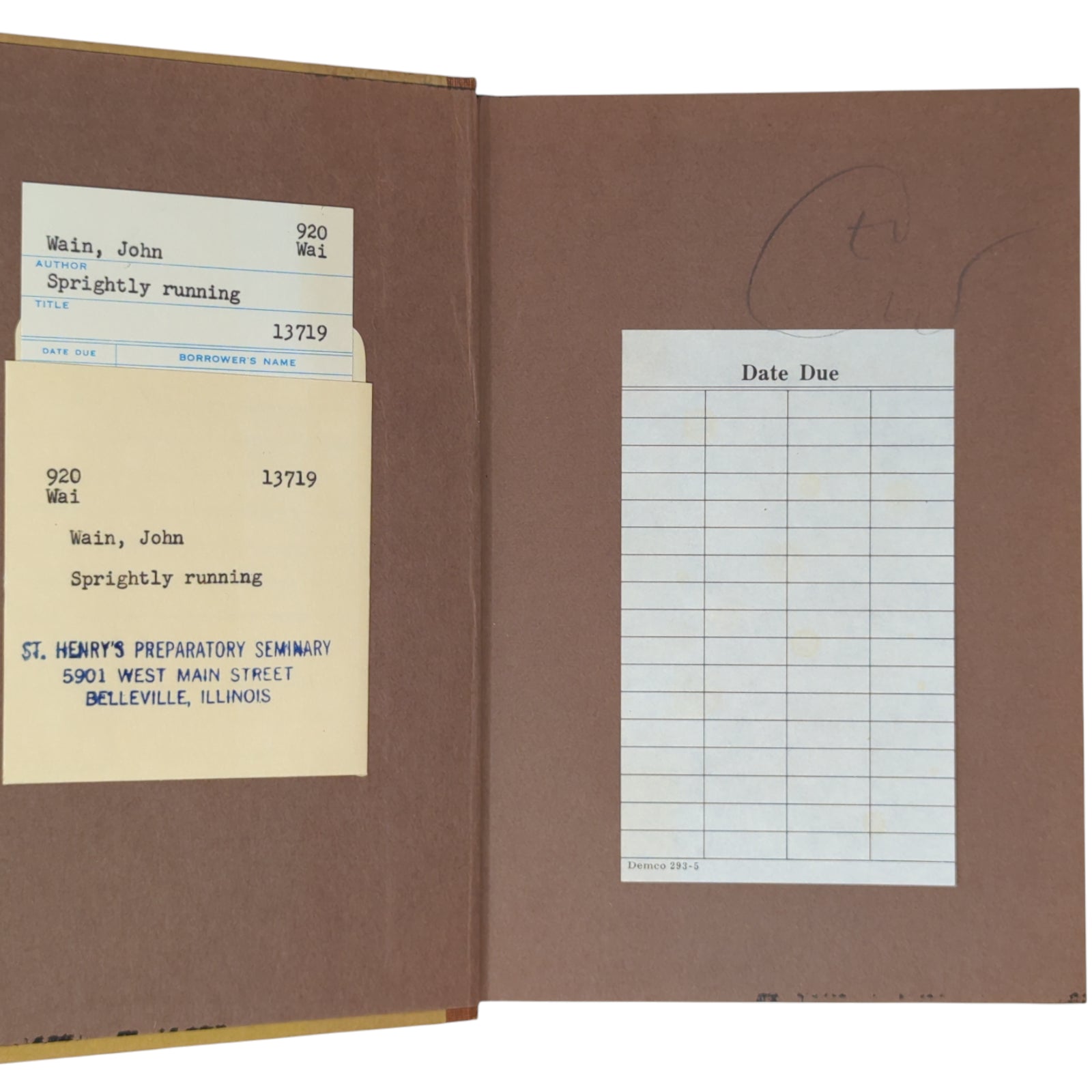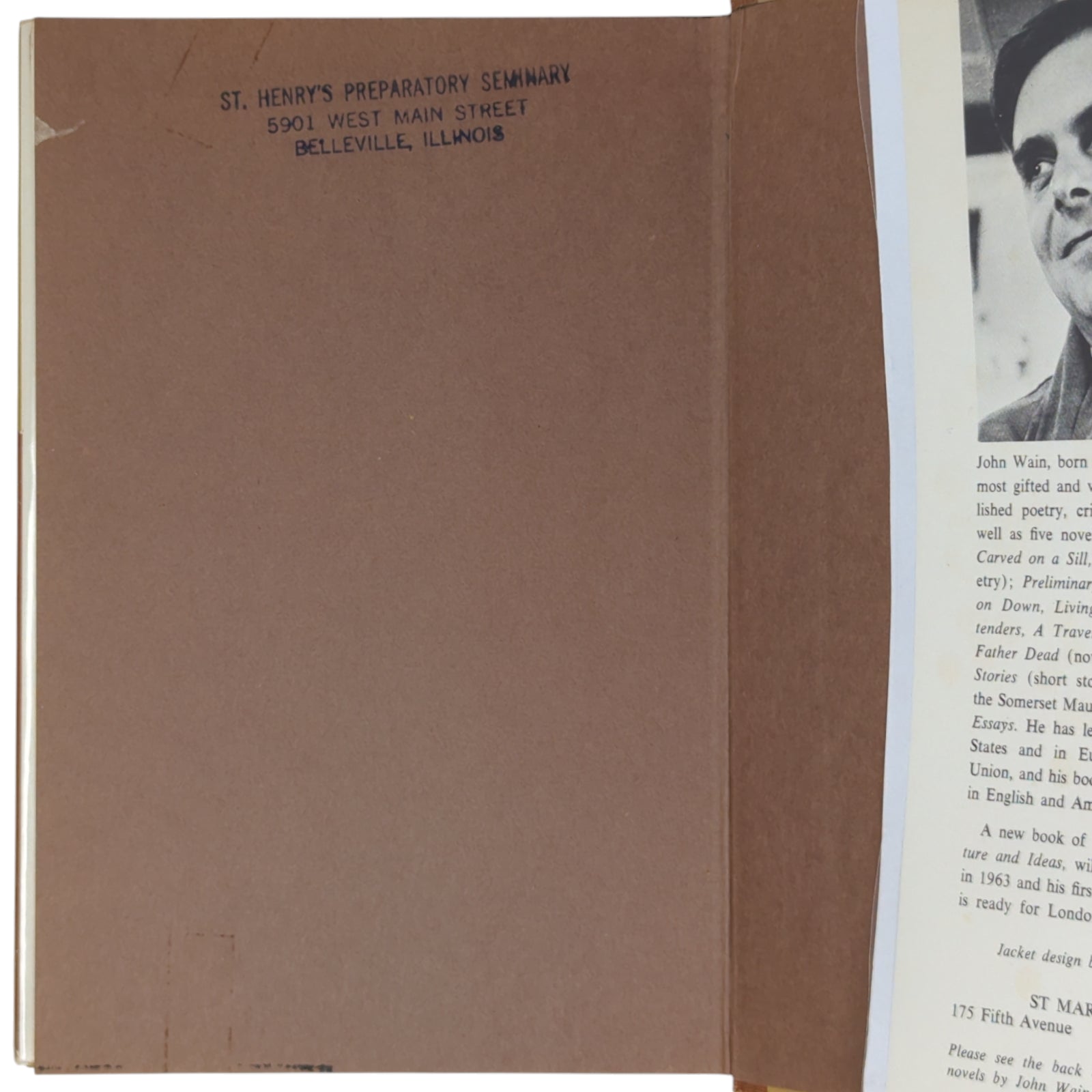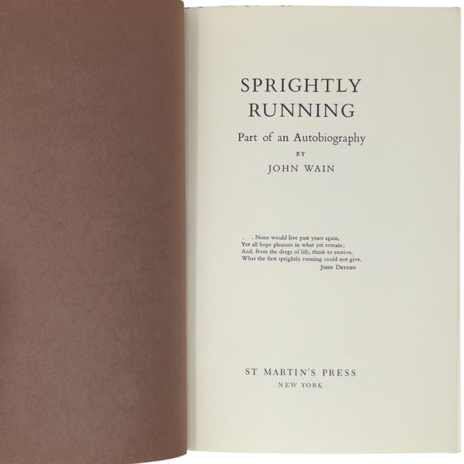 WAIN, John. Sprightly Running: Part of an Autobiography. New York: St. Martin's Press, 1963. First US edition of Inkling John Wain's autobiographical book that includes his relation with J.R.R. Tolkien and his Oxford tutor C.S. Lewis. Publisher's quarter-cloth binding with paper sides, gilt and black lettering to spine; with unclipped ($5.00) dust wrapper.