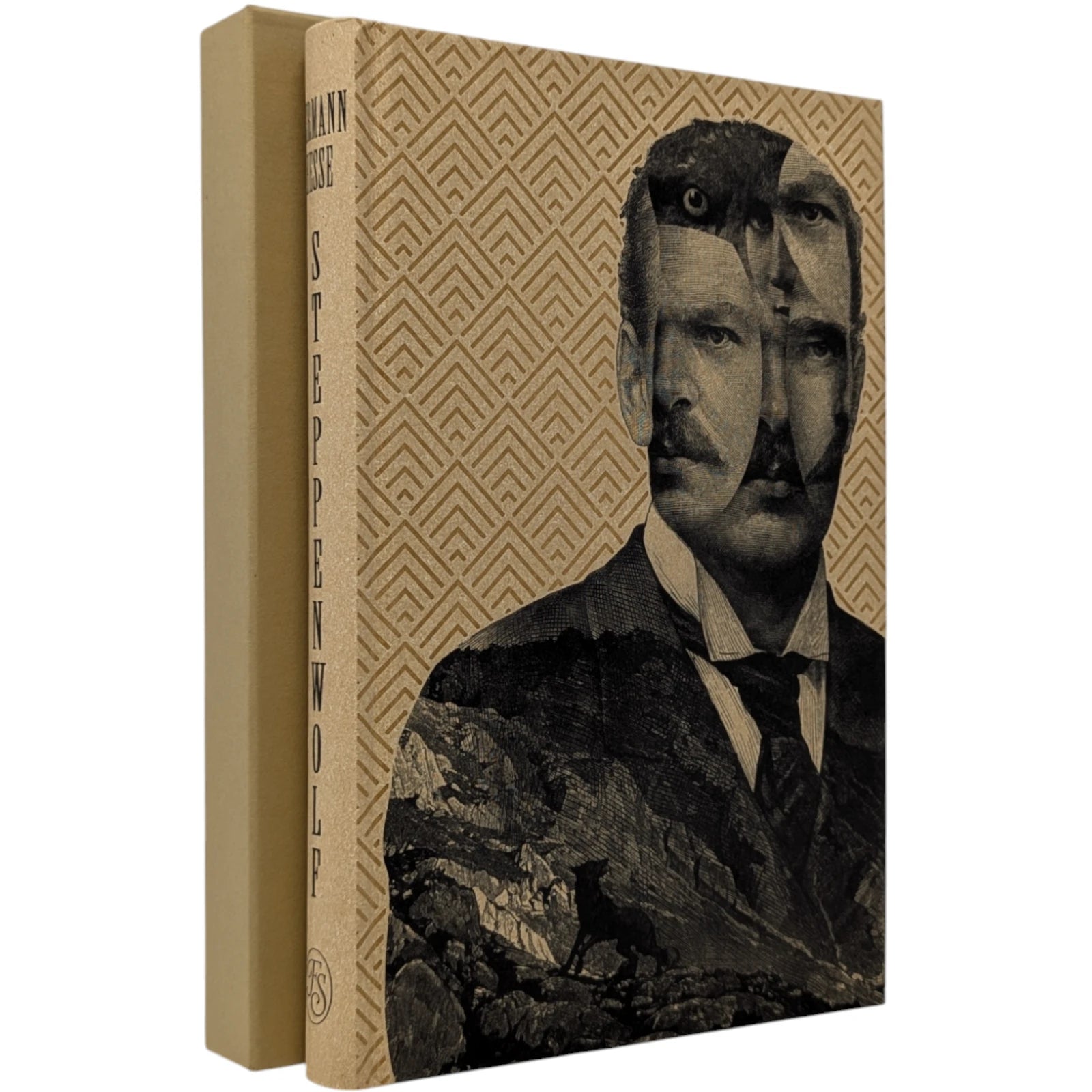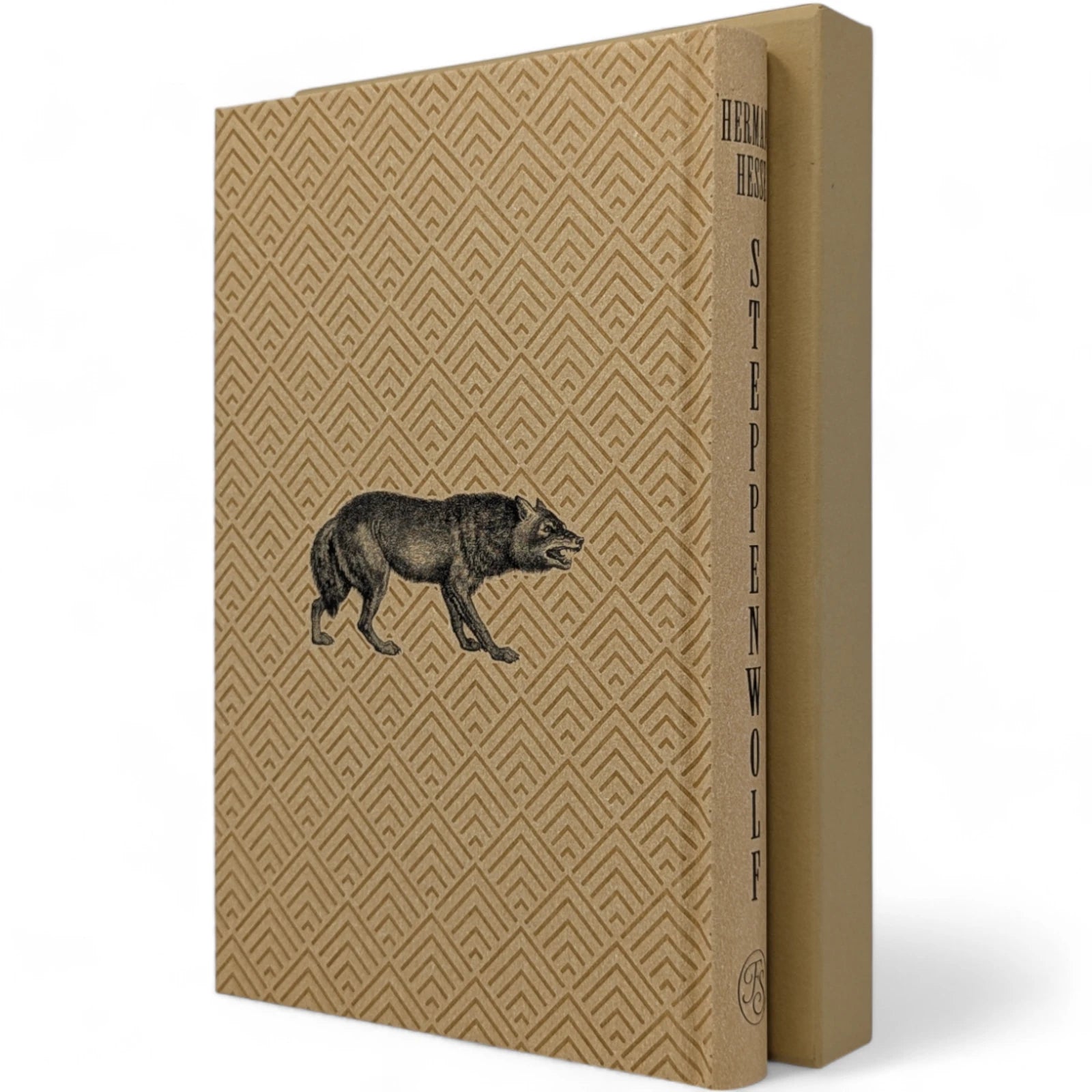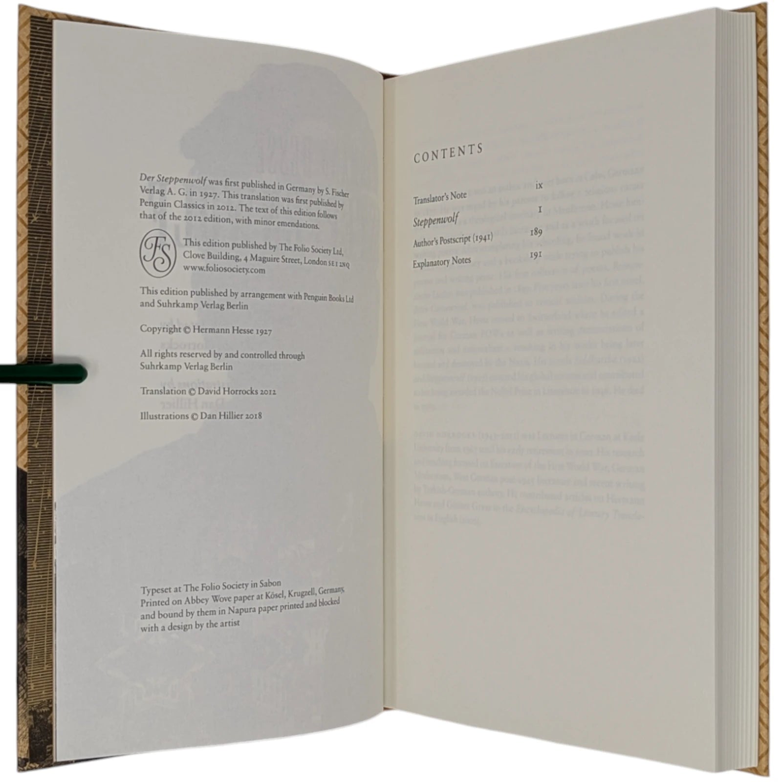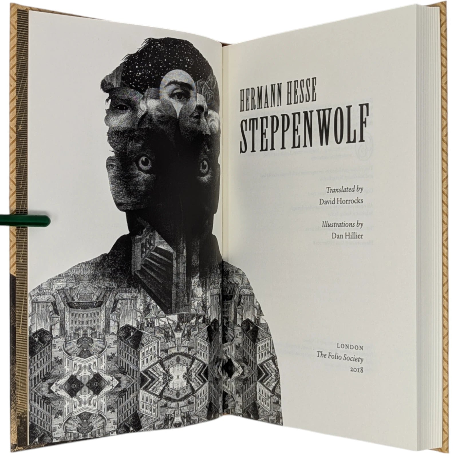 Hermann Hesse, Steppenwolf. London: The Folio Society, 2018. First Print Thus. Translated by David Horrocks, illustrations by Dan Hillier. 227 × 150 × 23 mm. Pp. [i–xii], [1–3] 4–194 [195–198]. Type: Sabon. Printed and bound by Kösel in full pale brown paper printed in black and blocked in brown with a design by the artist; pale brown endleaves with rooftop view printed in black with stars in spot varnish. Cream slip case. Bound in between pp. 38–39 is a 28-page pamphlet with decorative wrappers titled On Steppenwolf, a tract. The title-page spread and pamphlet cover are by Hillier.