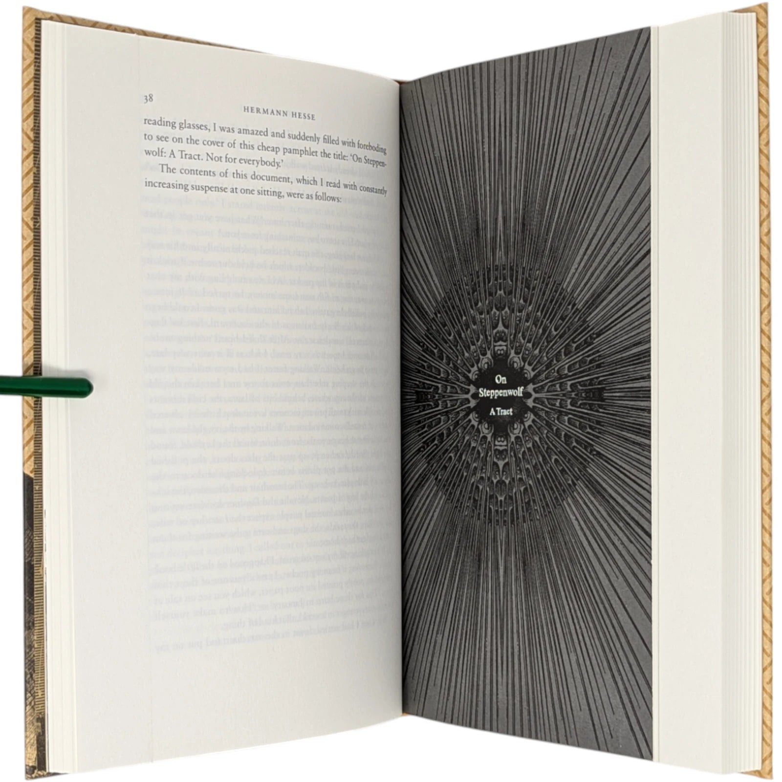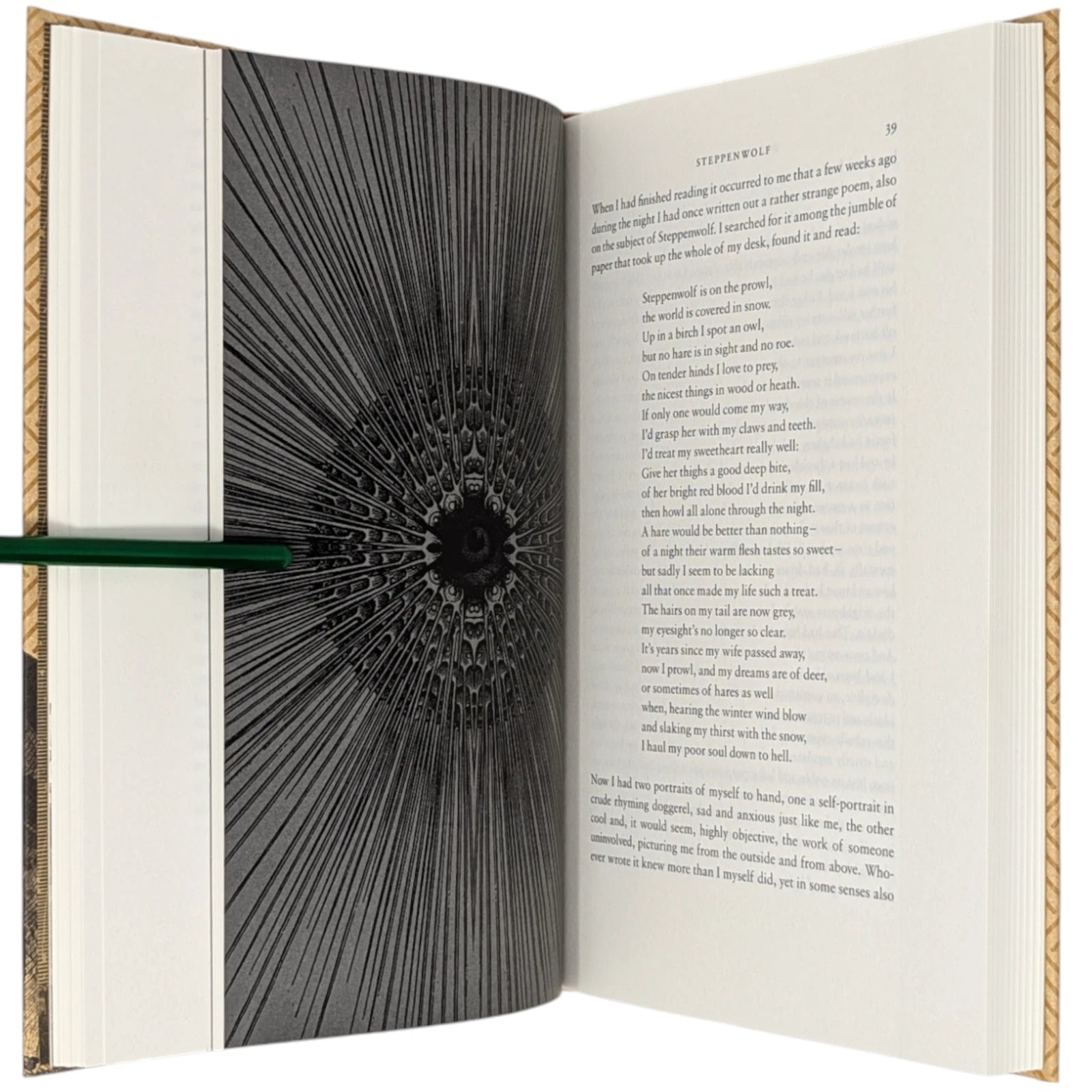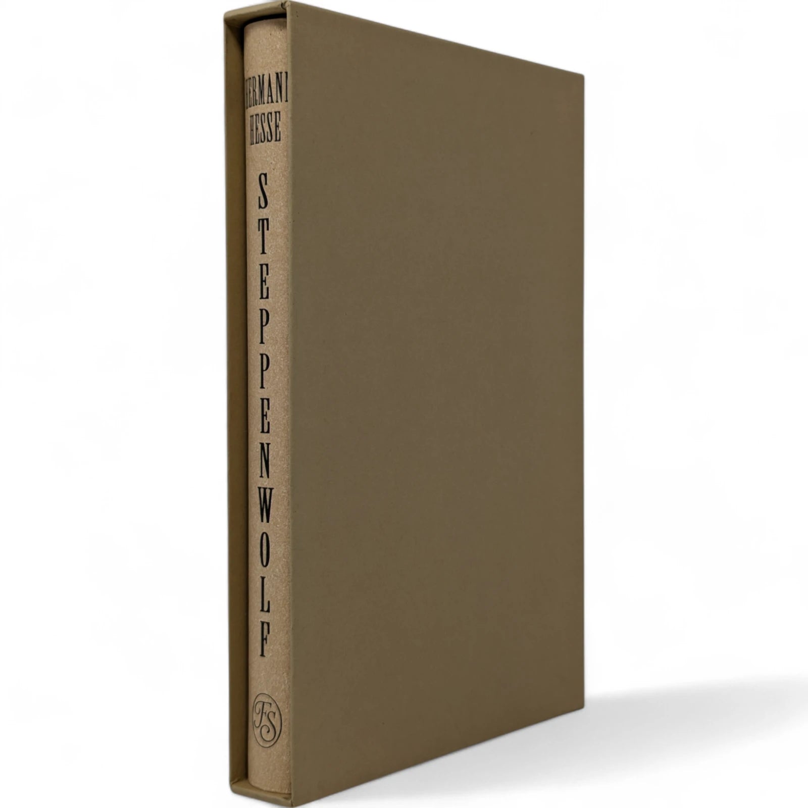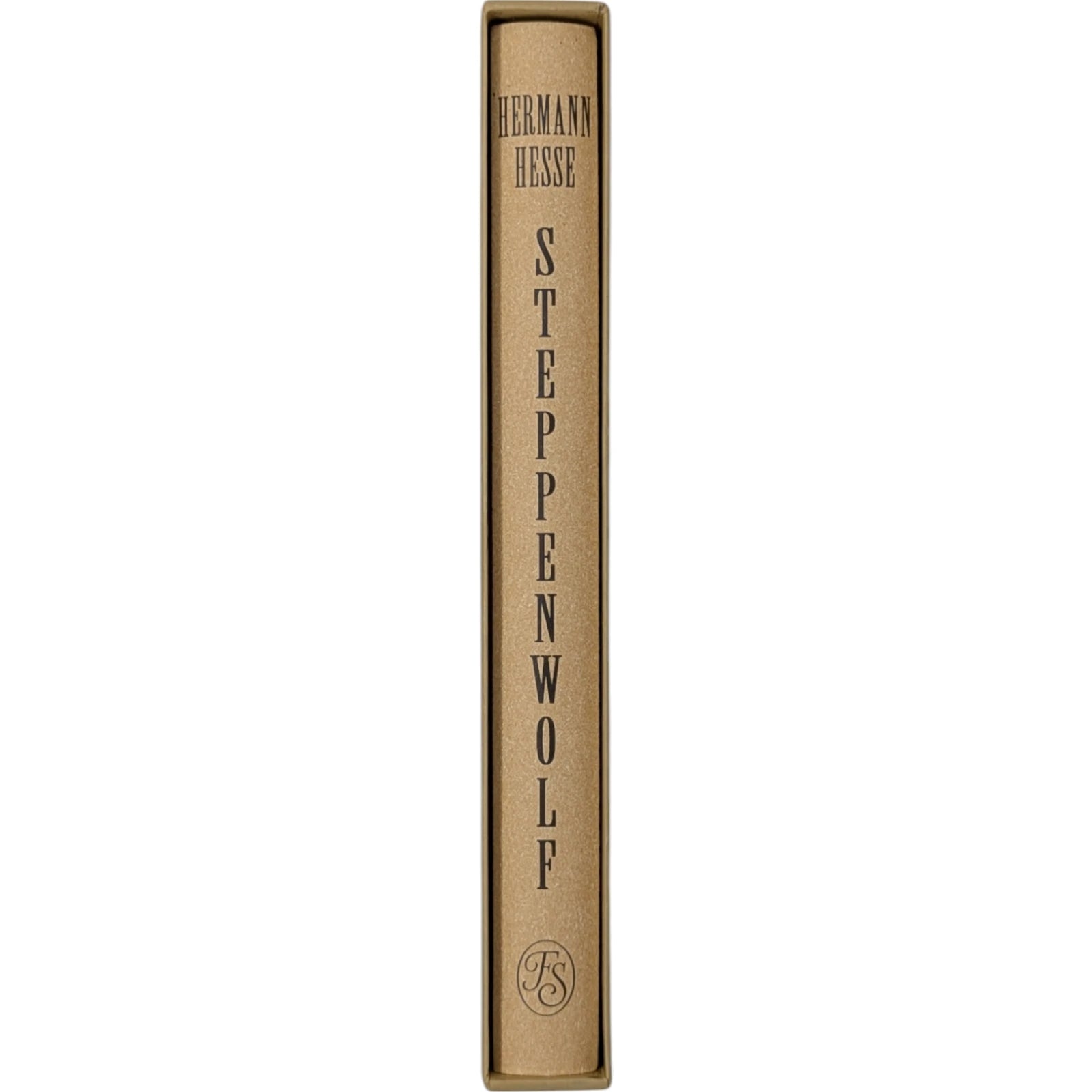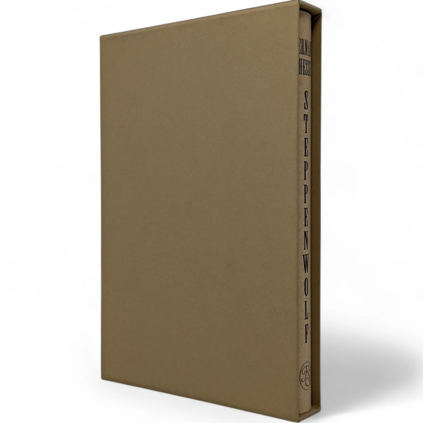 Hermann Hesse, Steppenwolf. London: The Folio Society, 2018. First Print Thus. Translated by David Horrocks, illustrations by Dan Hillier. 227 × 150 × 23 mm. Pp. [i–xii], [1–3] 4–194 [195–198]. Type: Sabon. Printed and bound by Kösel in full pale brown paper printed in black and blocked in brown with a design by the artist; pale brown endleaves with rooftop view printed in black with stars in spot varnish. Cream slip case. Bound in between pp. 38–39 is a 28-page pamphlet with decorative wrappers titled On Steppenwolf, a tract. The title-page spread and pamphlet cover are by Hillier.